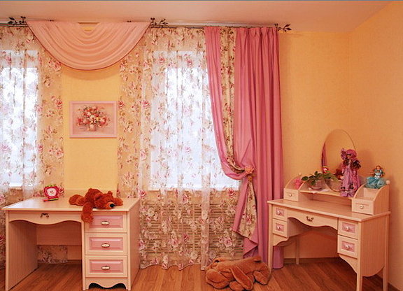 Очень важную роль при выборе занавесок для детской комнаты играет пол и возраст ребенка. Это объясняется тем, что у детей со временем меняются вкусы и увлечения. Многие родители для дочек советуют выбирать занавески теплых оттенков. В дизайн интерьера такой детской идеально вписываются изделия персикового, зеленого, желтого, акварельного или нежно розового цвета.