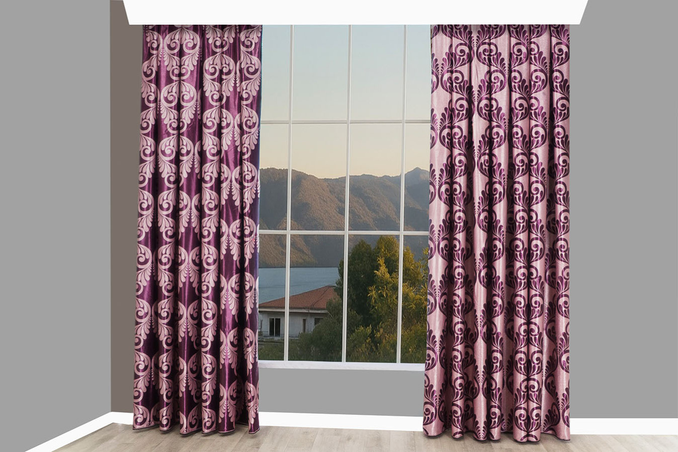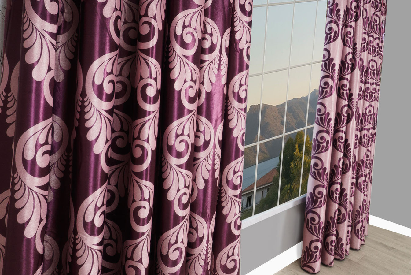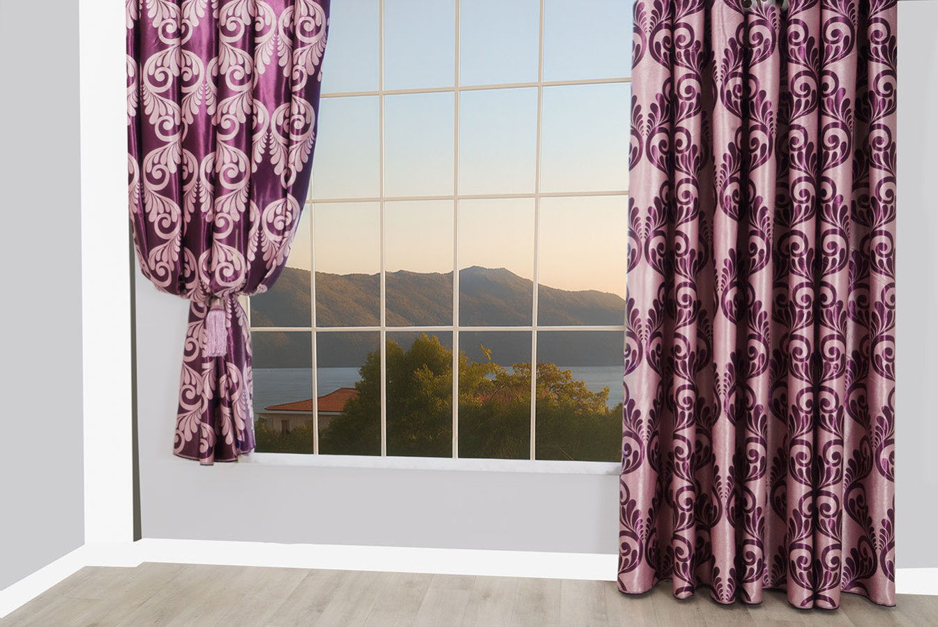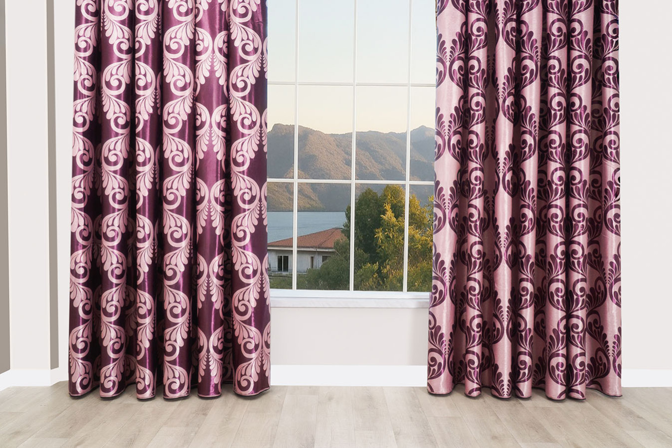 Штори з блекаута в двосторонньому виконанні з крупним виразним візерунком у вигляді вензелів. Забарвлення штор включає надзвичайно красиві відтінки - пастельний рожево-ліловий і фіолетовий. А ніжне сяйво глянсової і велюрової фактур надає колірній гамі ще більшу колоритність. Краї полотна обрізані спеціальним гарячим способом, який дозволяє надовго зберігати акуратний вигляд країв. Штори виглядають однаково ошатно і ефектно з обох сторін, і ви зможете легко змінювати зовнішній вигляд вікон і всього інтер'єру просто перевісивши їх на іншу сторону.