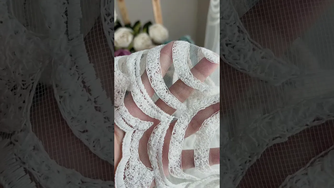 Молочний фатин з вишитим візерунком і фігурно обробленою нижньою крайкою полотна. Хвилястий візерунок вишитий молочними, ніжно сяючими нитками, а незвичайний спосіб декоративного шиття створив щільну, і наче букльовану поверхню орнаменту. Тюль відноситься до числа елітних преміум тканин, відрізняється високою якістю, довговічністю і стійкістю до деформацій. Також, завдяки дрібносітчастій структурі основи завіса відмінно розсіює світло і добре пропускає повітря.