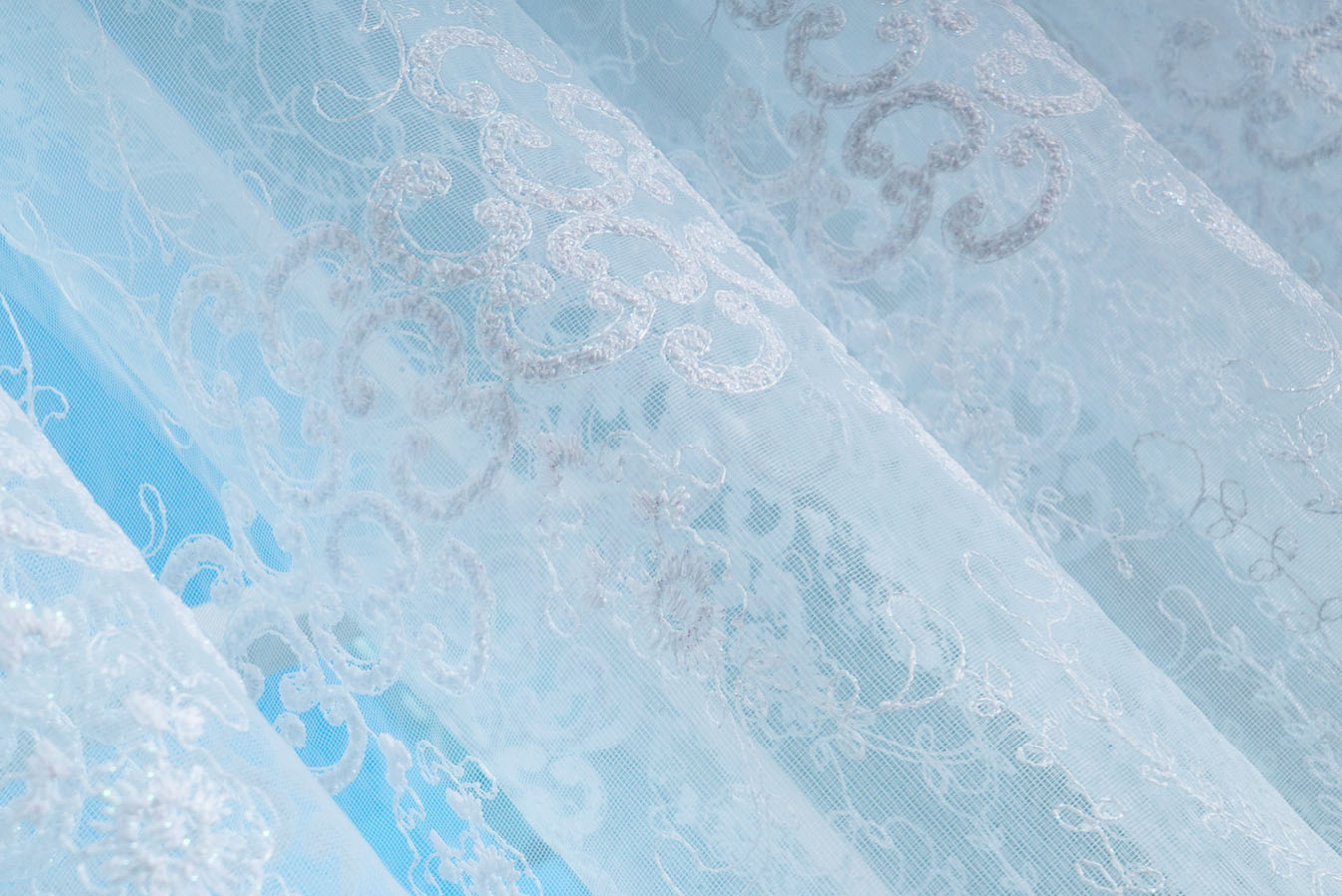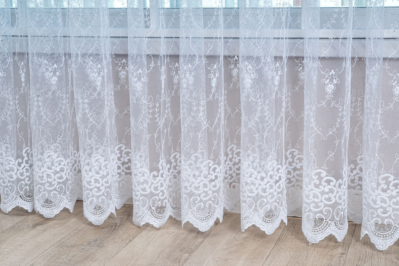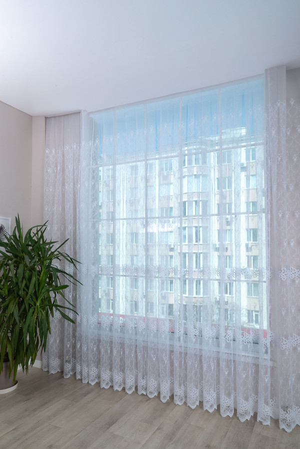 Ніжний і витончений фатин для тюлю з вишитими по всій висоті візерунками із серії елітних гардин преміум класу. Вишивка виконана двома способами - витончене рядкове шиття і щільний букльований декор, що нагадує махрову поверхню. Низ гардини виконаний у вигляді фігурної мереживної оборки. А виразні горизонтальні лінії рельєфного візерунка допомагають візуально розширити приміщення.