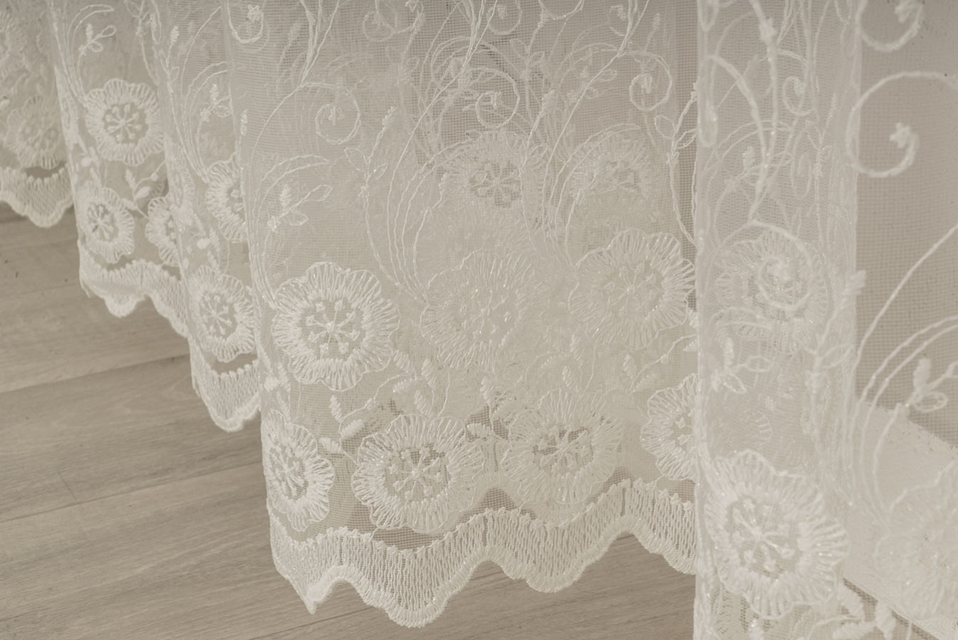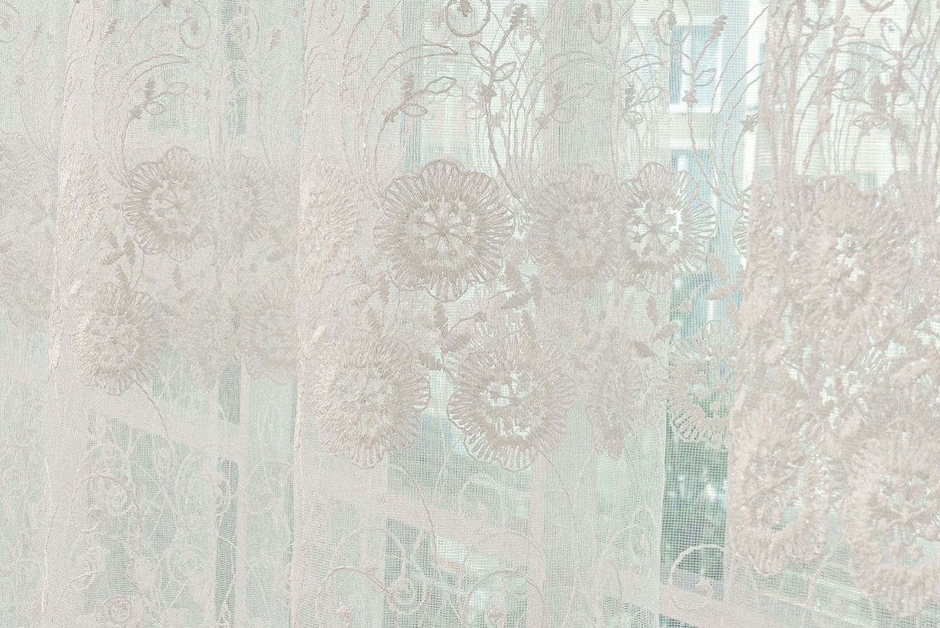 Фатиновий тюль ніжного молочного відтінку з колекції високоякісних тюлів преміум класу. Декор моделі являє собою розкішне шиття з горизонтальними смугами квіткового орнаменту і фігурно обробленою нижньою кромкою. Вишивка виконана матовими нитками і виглядає дуже чітко на ніжному і напівпрозорому фоні. Гардина виглядає багато і витончено, прекрасно прикрашає і освіжає вікна надаючи їм вишуканий і ошатний вигляд.