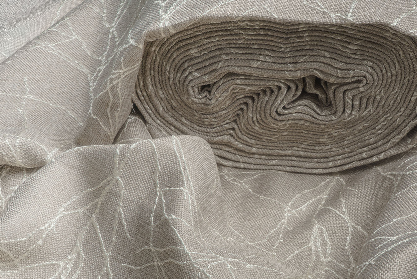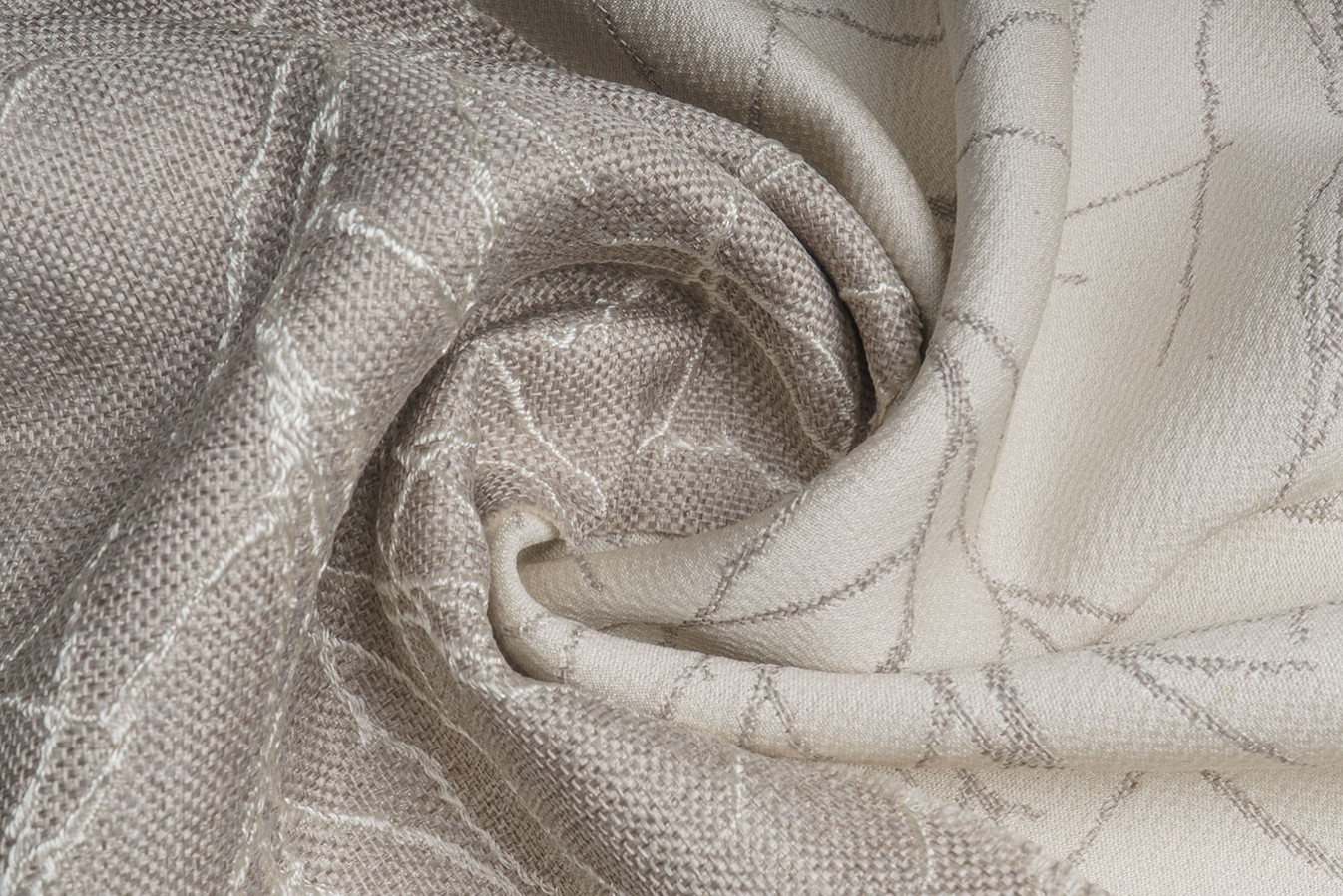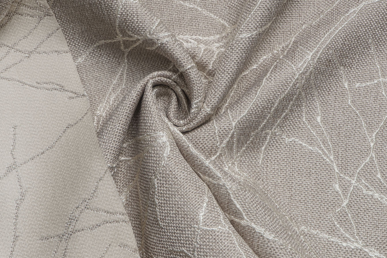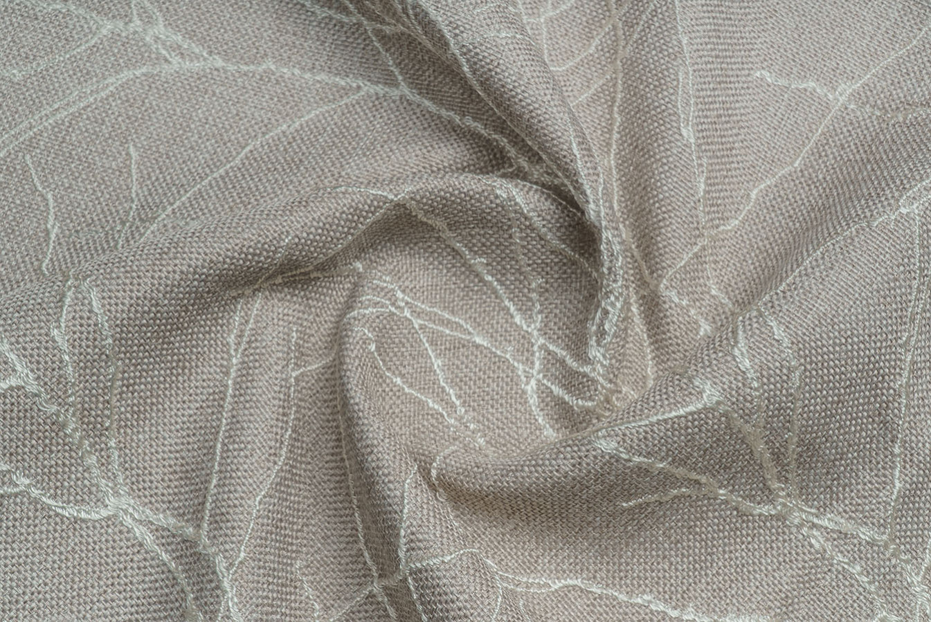 Бежево-сіра мішковина для штор з опуклим розложистим візерунком. Тонкі лінії малюнка виконані шляхом фактурного вплетення контрастних глянцевих волокон, що створює картину динамічного і рельєфного візерунка. Фоновий матеріал володіє грубим полотняним плетінням з виразною структурою. А благородна і тепла колірна гамма цих портьєр дарує відчуття неймовірного комфорту і затишку.