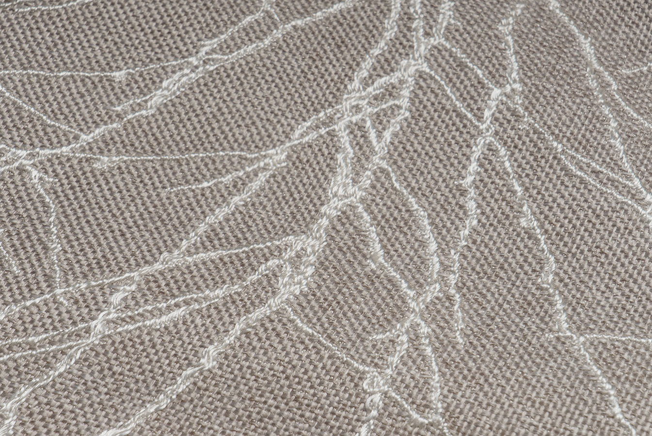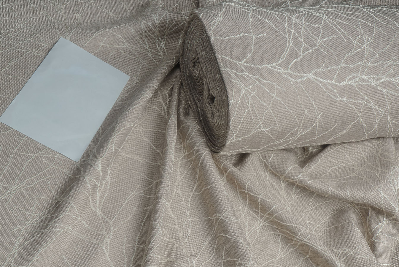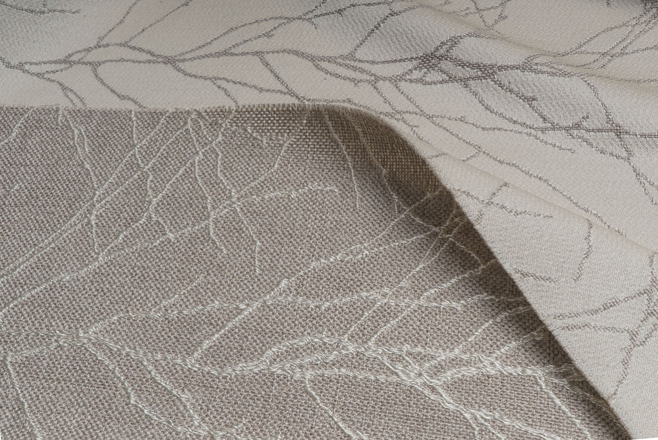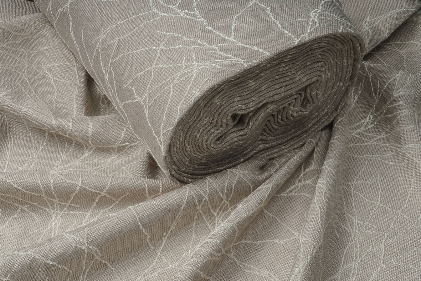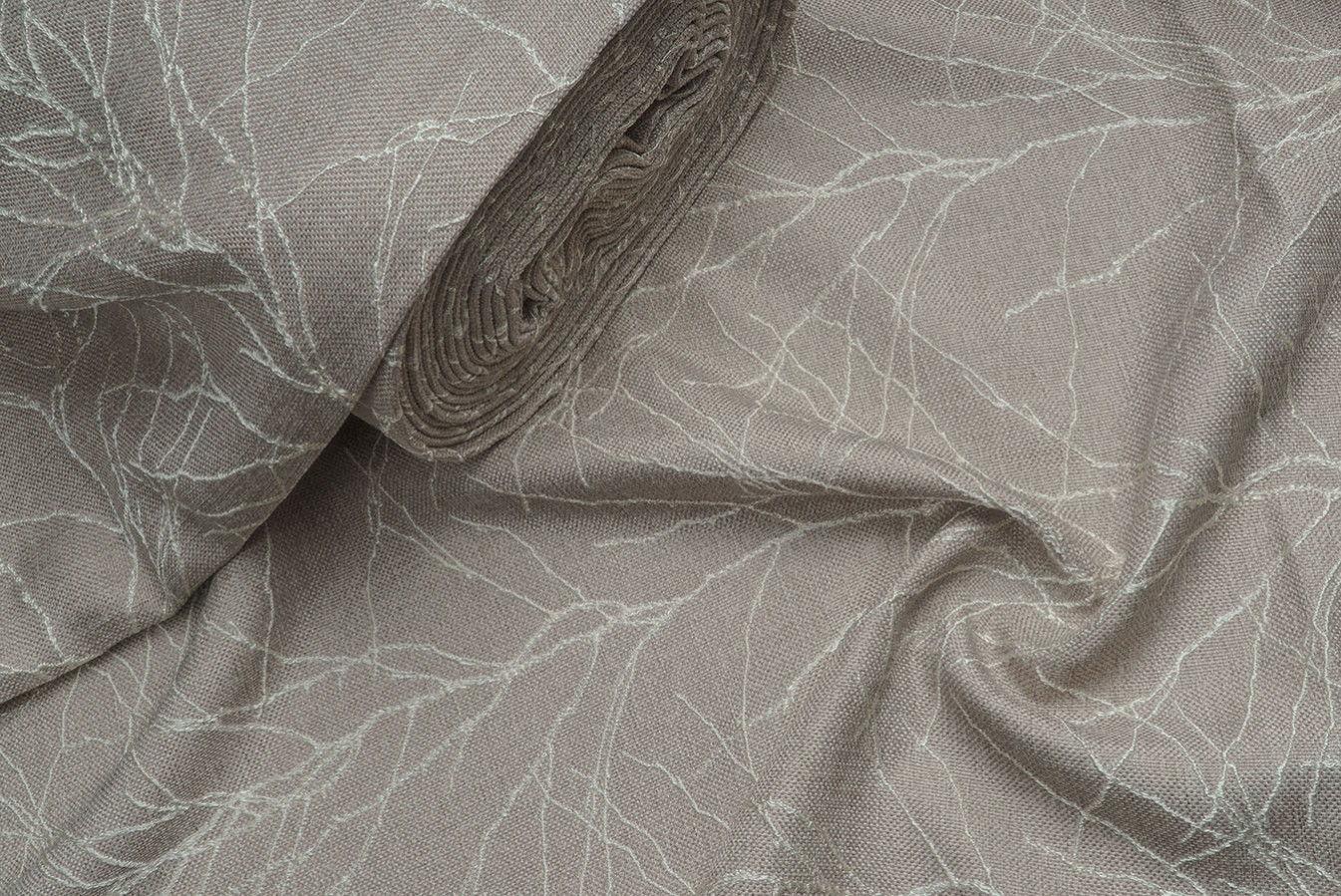 Бежево-сіра мішковина для штор з опуклим розложистим візерунком. Тонкі лінії малюнка виконані шляхом фактурного вплетення контрастних глянцевих волокон, що створює картину динамічного і рельєфного візерунка. Фоновий матеріал володіє грубим полотняним плетінням з виразною структурою. А благородна і тепла колірна гамма цих портьєр дарує відчуття неймовірного комфорту і затишку.