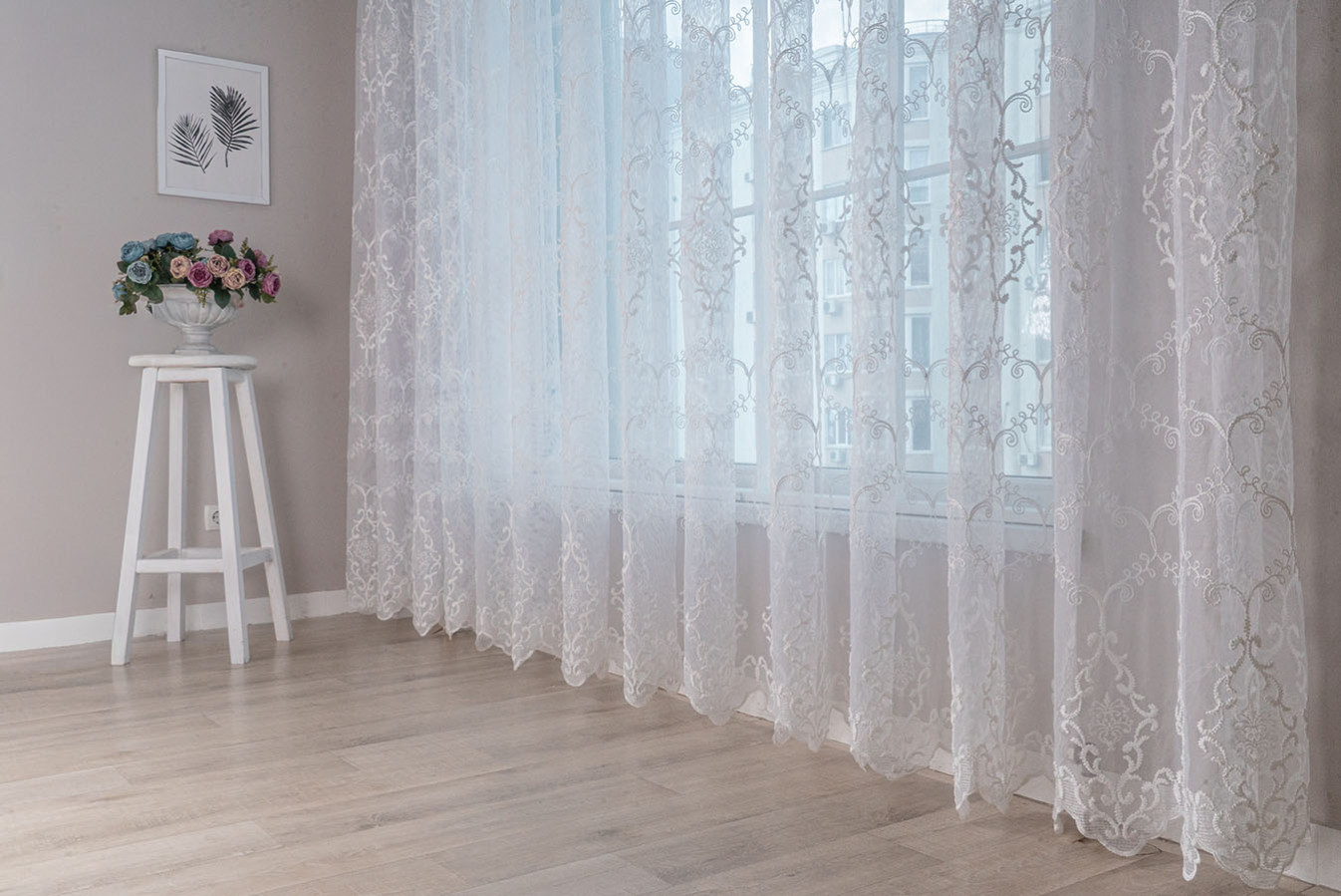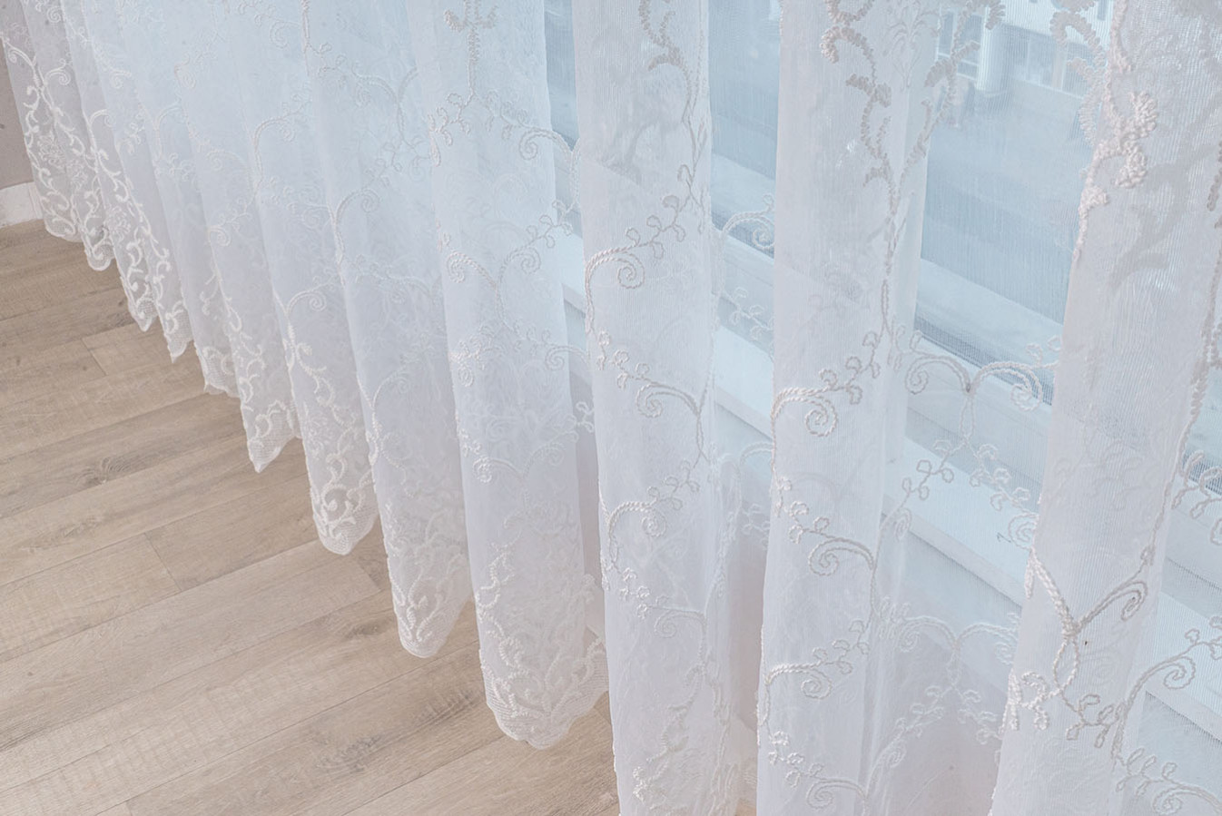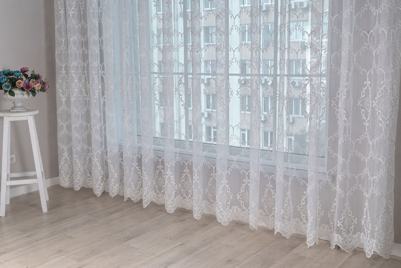 Білий тюль з багатим шиттям у вигляді вензелів на основі легкого напівпрозорого фатину. Вишивка виконана матовими об'ємними нитками, які створюють на поверхні гардини опуклі і рельєфні лінії візерунка. Таке виконання надає малюнку особливу виразність і об'єм, а дрібносітчаста фатинова основа виступає прекрасним фоном для орнаменту. На вікнах виглядає повітряно і багато, надаючи оформленню вікон респектабельний і розкішний вигляд.