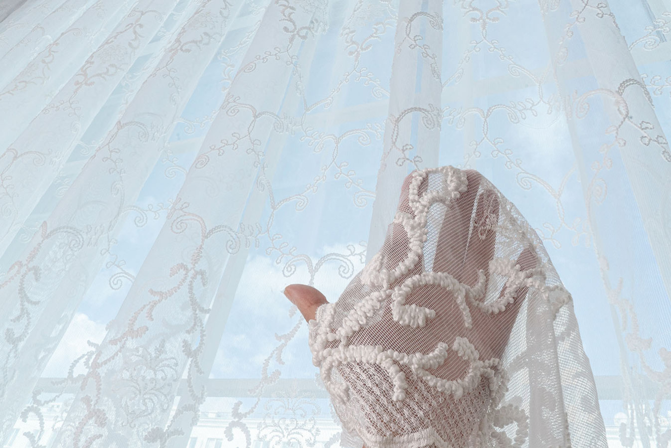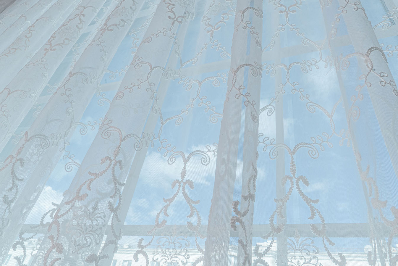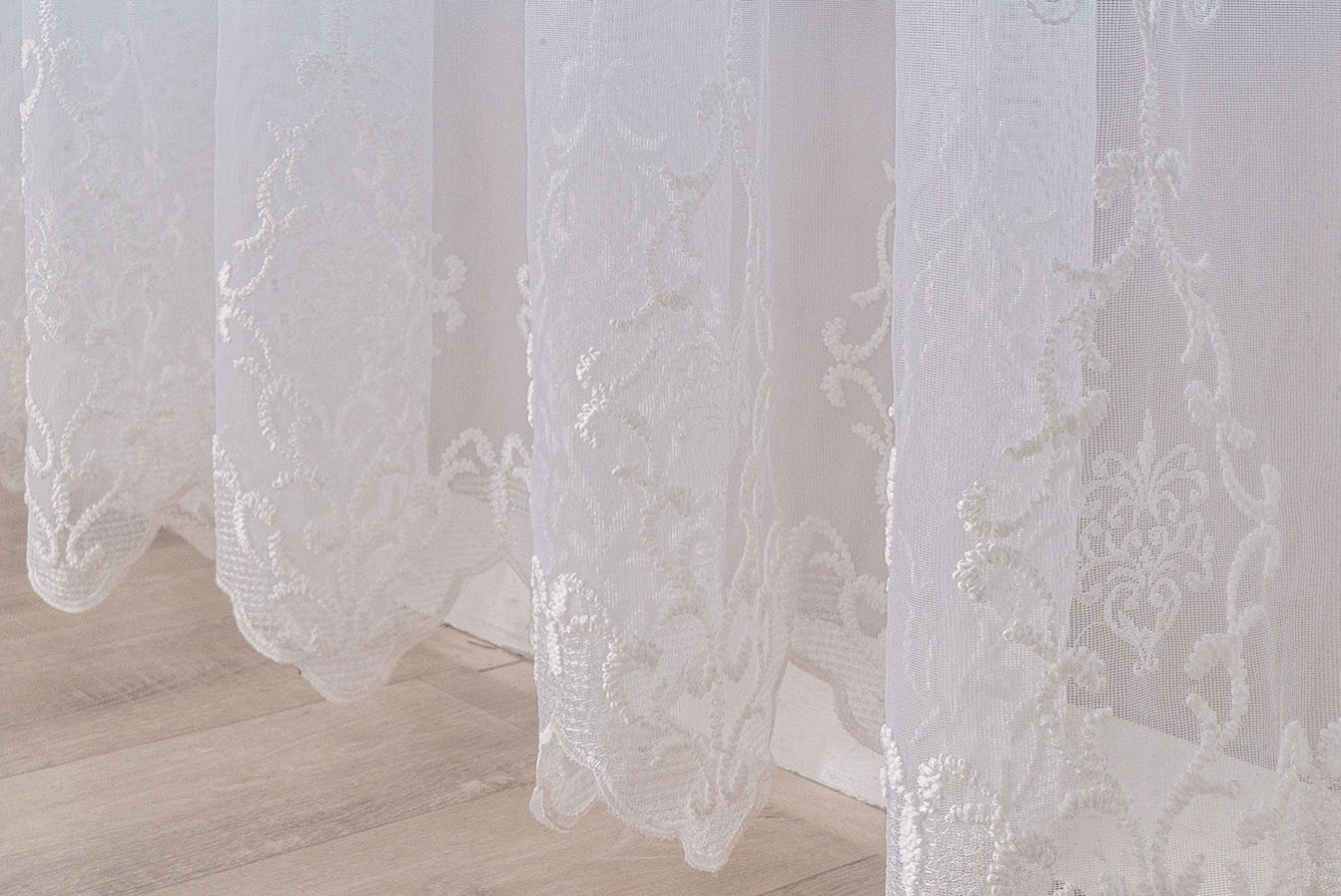 Білий тюль з багатим шиттям у вигляді вензелів на основі легкого напівпрозорого фатину. Вишивка виконана матовими об'ємними нитками, які створюють на поверхні гардини опуклі і рельєфні лінії візерунка. Таке виконання надає малюнку особливу виразність і об'єм, а дрібносітчаста фатинова основа виступає прекрасним фоном для орнаменту. На вікнах виглядає повітряно і багато, надаючи оформленню вікон респектабельний і розкішний вигляд.