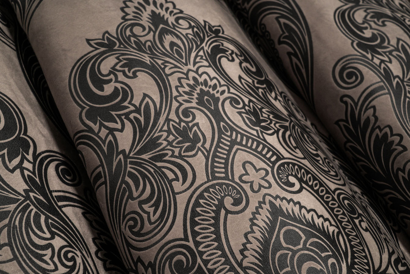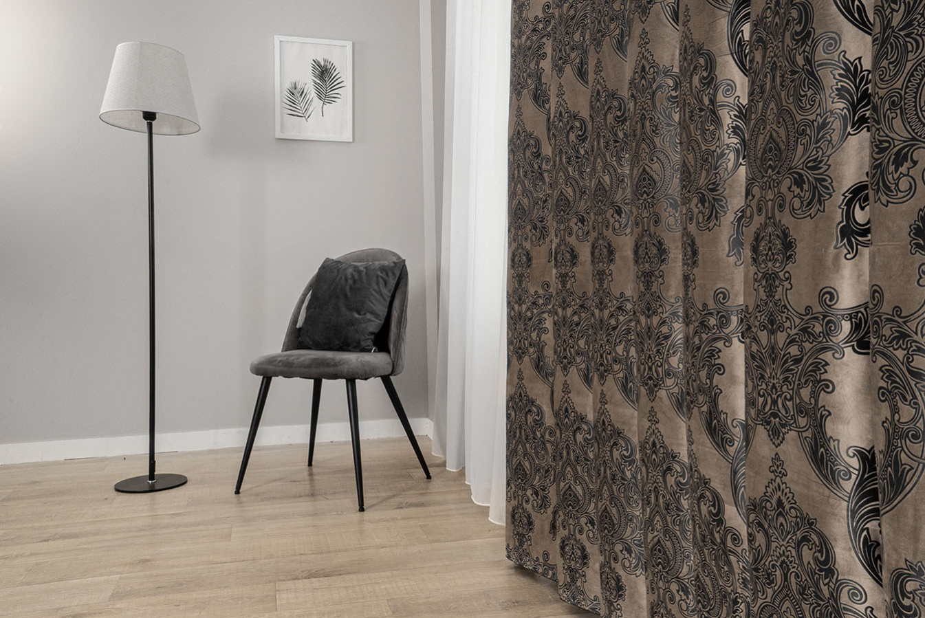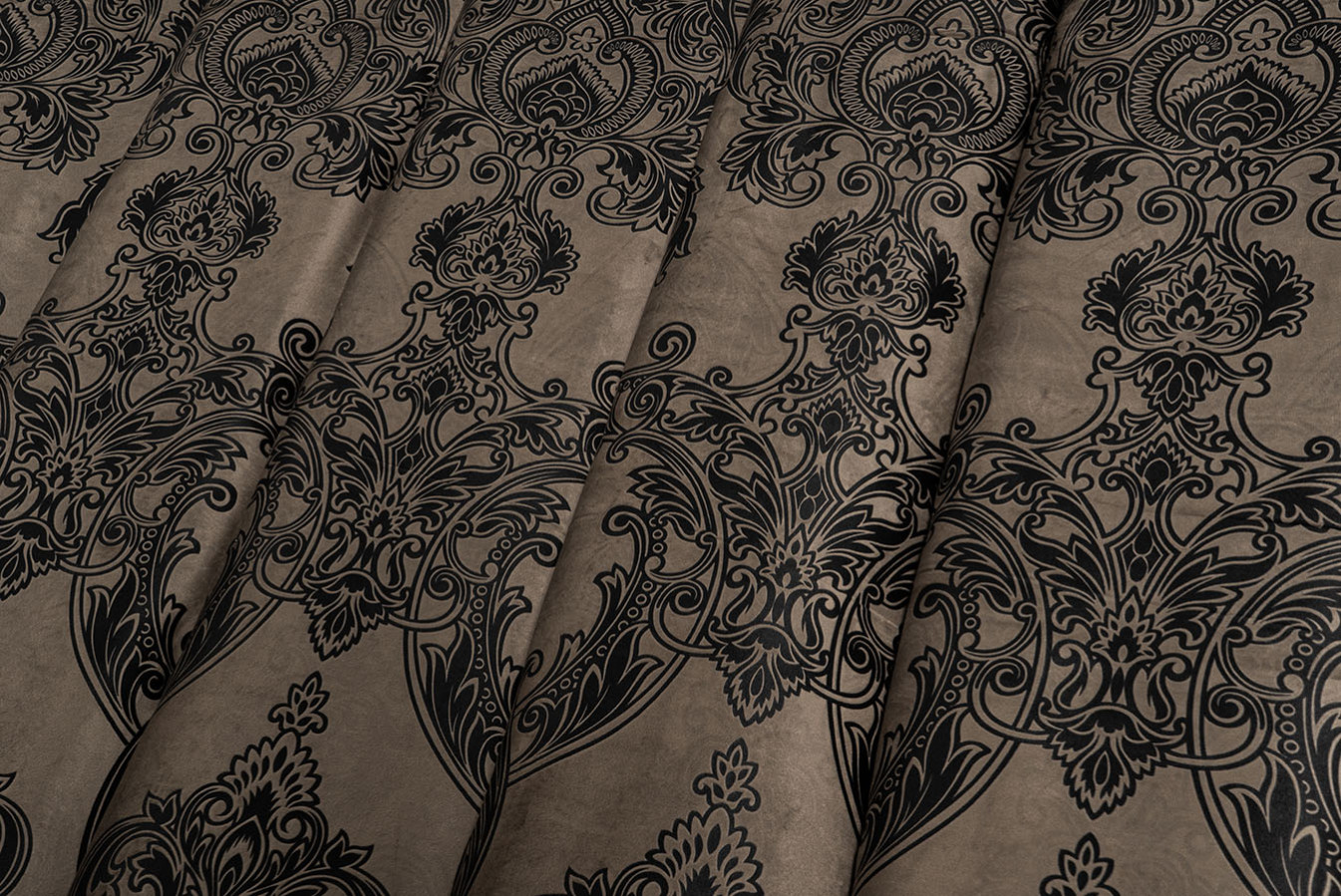 Оксамитові штори з тисненим візерунком в бежево-графітовому забарвленні. Розкішний орнамент "корона" виконаний великим раппортом і характеризується високою точністю контурів з найдрібнішими деталями. Портьєри мають м'яку на дотик, ворсисту структуру з ніжним оксамитовим відливом на поверхні. У драпіруваннях ця модель штор утворює податливі, м'яко спадаючі складки. А в інтер'єрі штори виглядають багато, розкішно і респектабельно - відмінний вибір для елегантних і аристократичних стилів оформлення.