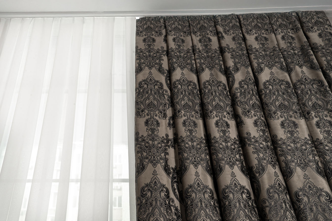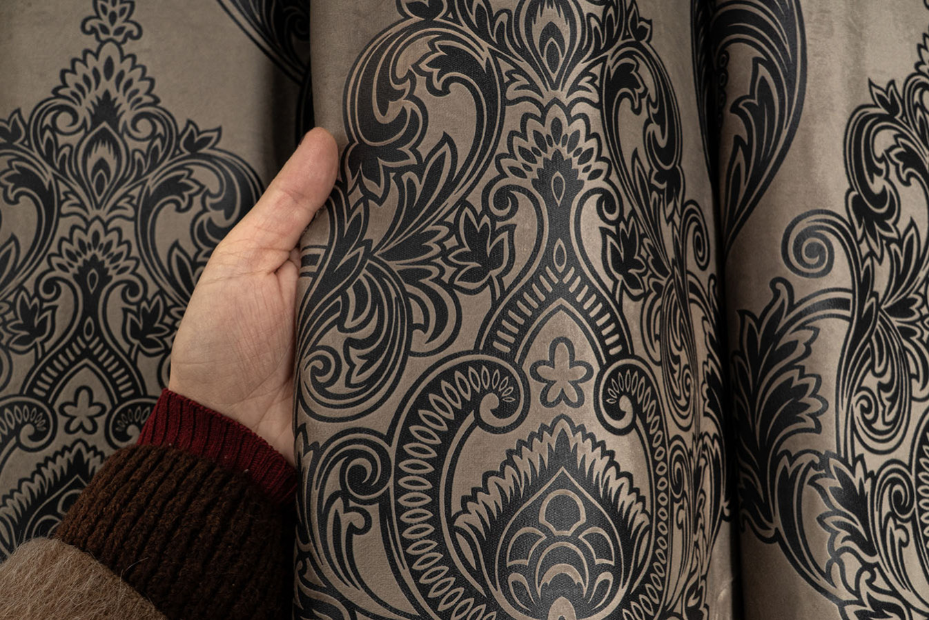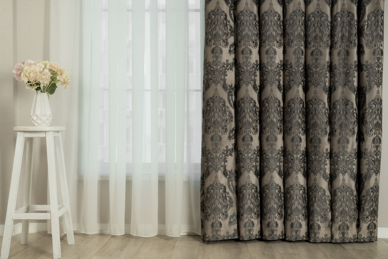 Оксамитові штори з тисненим візерунком в бежево-графітовому забарвленні. Розкішний орнамент "корона" виконаний великим раппортом і характеризується високою точністю контурів з найдрібнішими деталями. Портьєри мають м'яку на дотик, ворсисту структуру з ніжним оксамитовим відливом на поверхні. У драпіруваннях ця модель штор утворює податливі, м'яко спадаючі складки. А в інтер'єрі штори виглядають багато, розкішно і респектабельно - відмінний вибір для елегантних і аристократичних стилів оформлення.