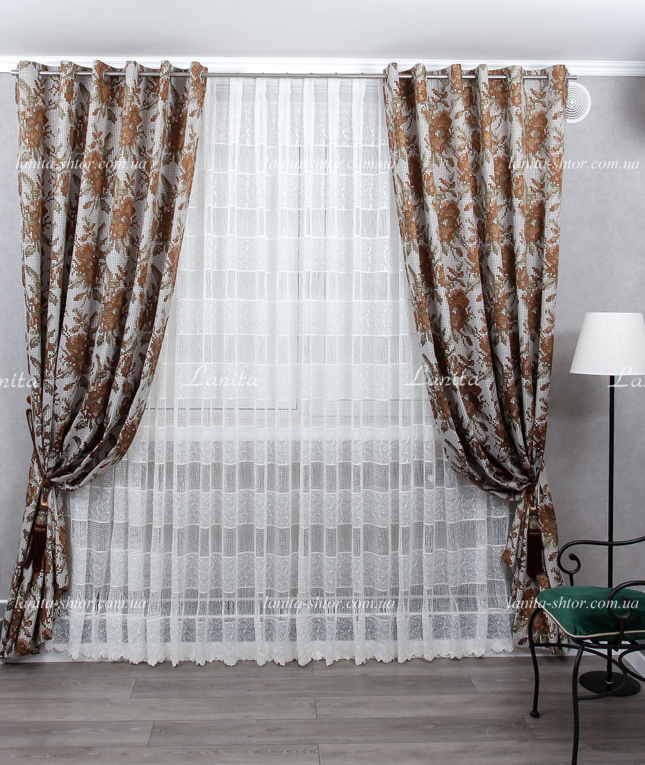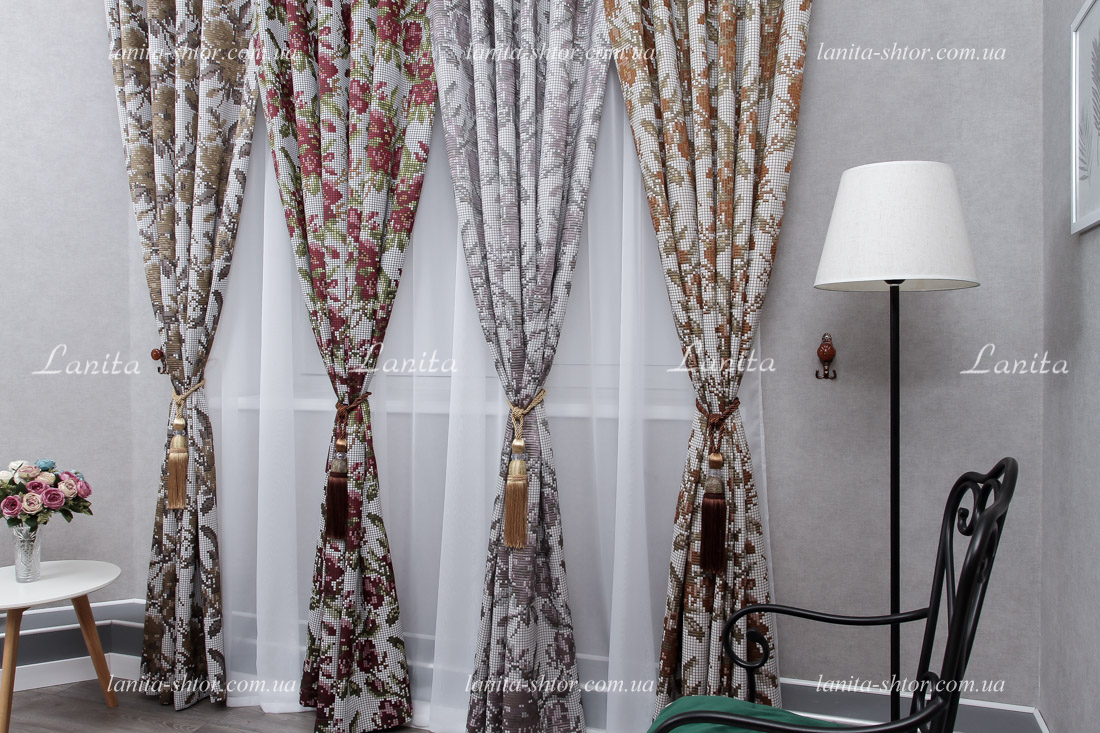 Штори гобелен з оригінальним квітковим візерунком, виконаним у вигляді "пікселів", нагадує орнамент вишитий хрестом. Портьєра має виразну рельєфну фактуру та ніжне сяйво на поверхні. Завдяки своїй гнучкості і пластичності, тканина лягає в глибокі і формостійкі складки при драпіруваннях. Штори виглядають дуже ефектно і стильно, ідеальний вибір для модних сучасних інтер'єрів.