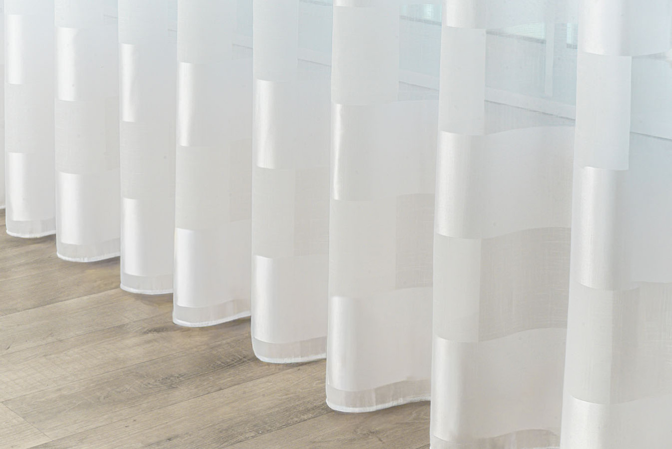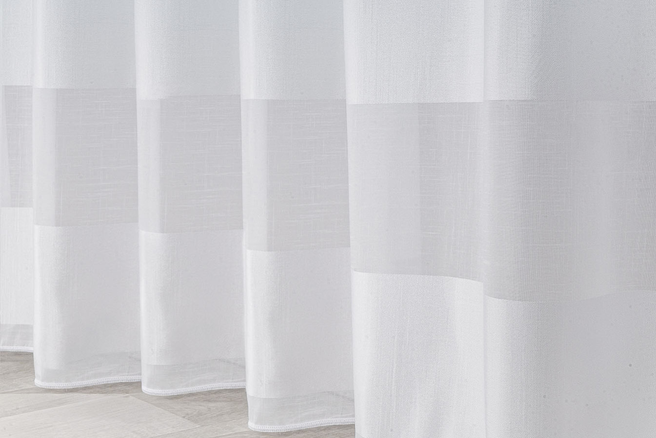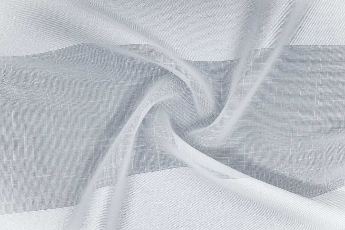 Турецький білий тюль з горизонтальними смужками на основі тканини під льон. Основа гардини характеризується матовою поверхнею і виразною лляною фактурою, створеною завдяки полотняному плетінню з включенням потовщених волокон. Смужки виконані щільними і непрозорими, мають ніжне сатинове сяйво на поверхні. В драпіруваннях тюль лягає в рівні хвилясті волани, прозорість нижче середньої. Дана серія тканин відрізняється ефектним дизайном і прекрасними текстильними характеристиками.