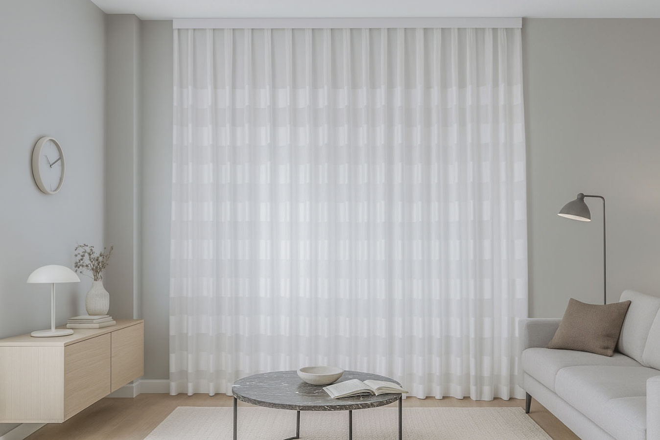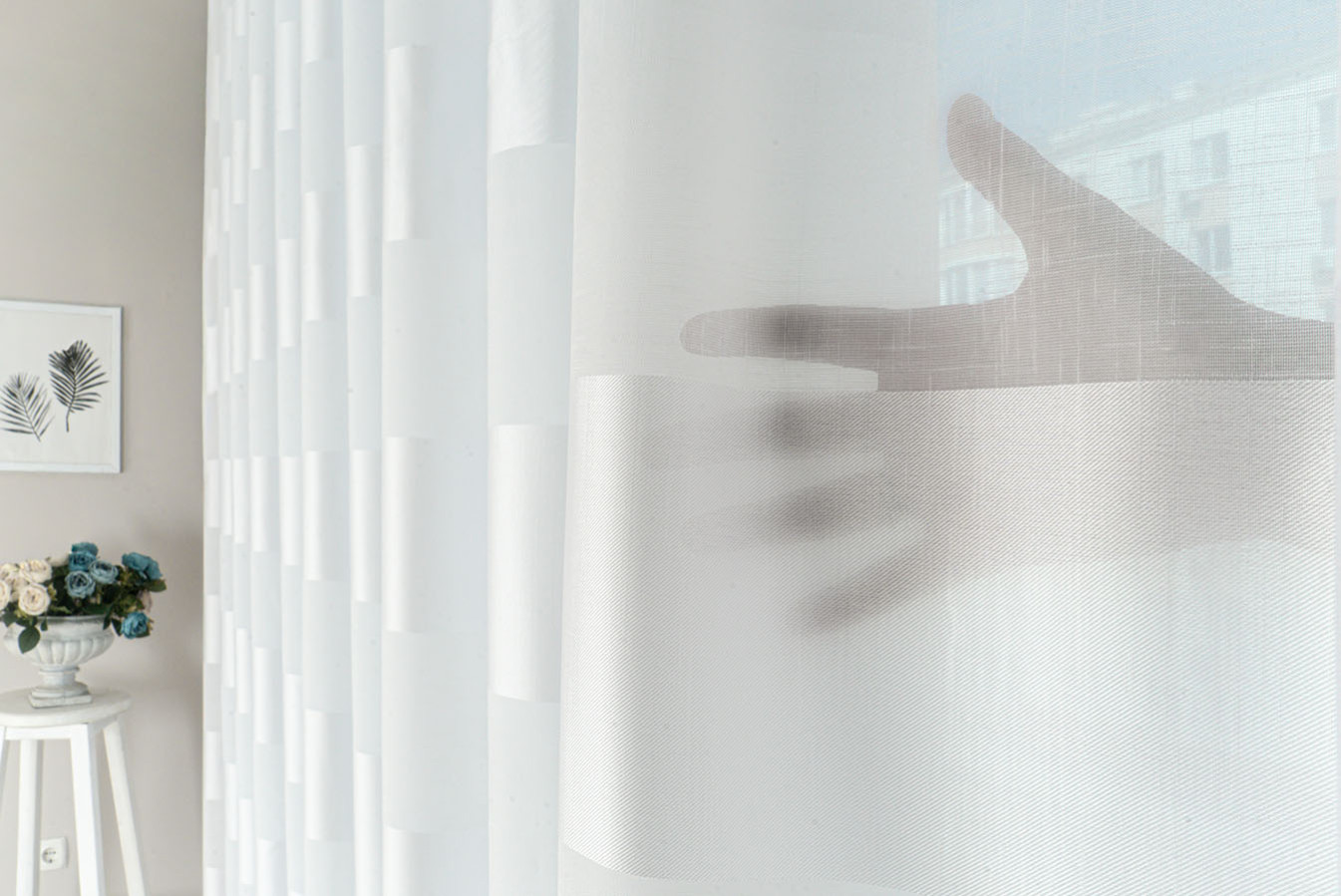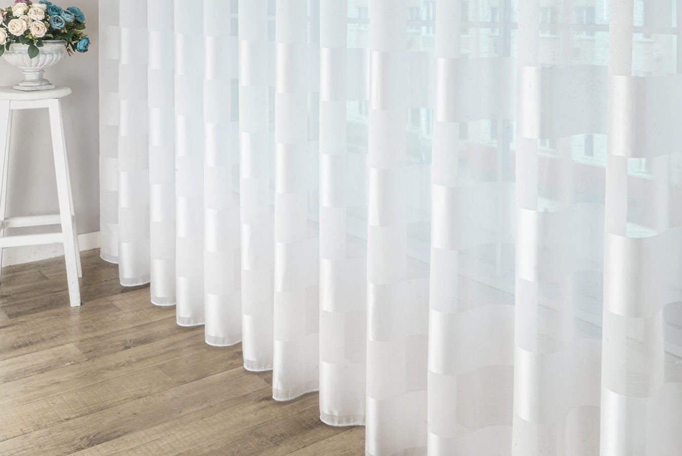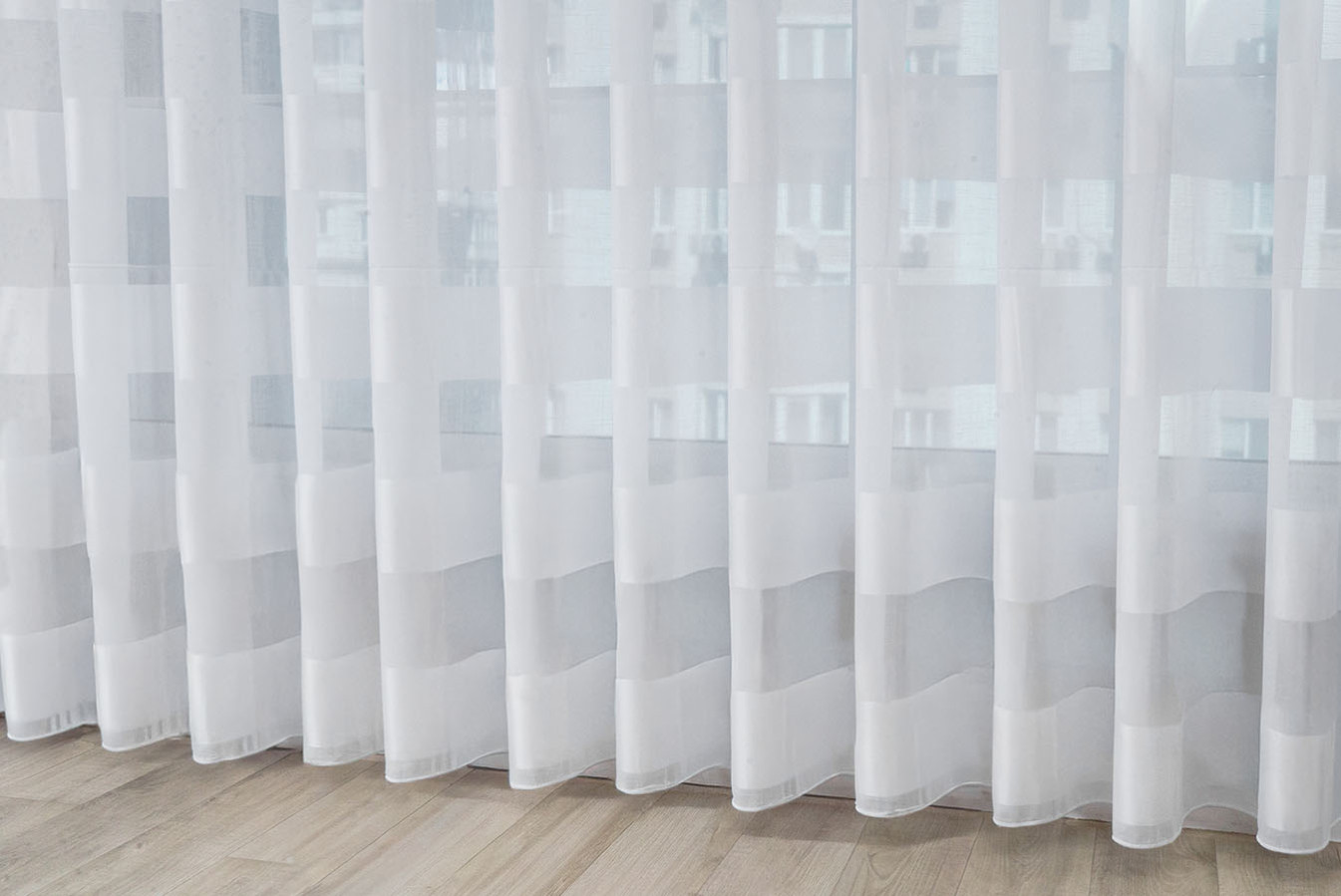 Турецький білий тюль з горизонтальними смужками на основі тканини під льон. Основа гардини характеризується матовою поверхнею і виразною лляною фактурою, створеною завдяки полотняному плетінню з включенням потовщених волокон. Смужки виконані щільними і непрозорими, мають ніжне сатинове сяйво на поверхні. В драпіруваннях тюль лягає в рівні хвилясті волани, прозорість нижче середньої. Дана серія тканин відрізняється ефектним дизайном і прекрасними текстильними характеристиками.
