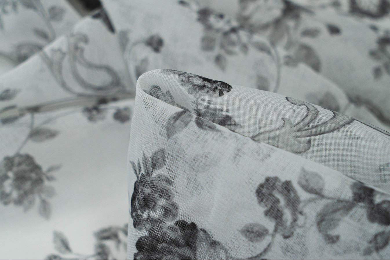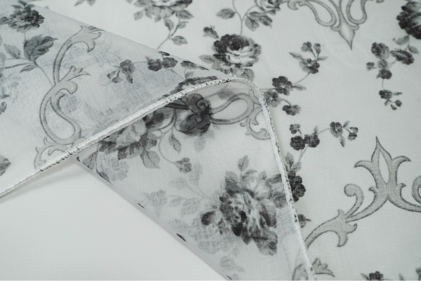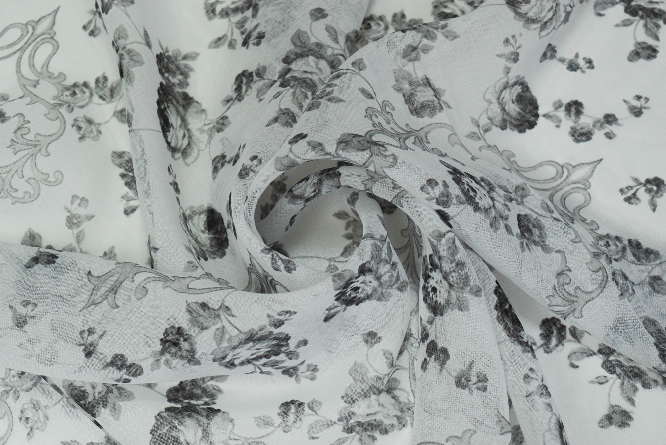 Тюль батист із крупним квітковим малюнком, виконаним технологією текстильного принтування. Принт виконаний у сірій гамі, завдяки чому виглядає контрастно та виразно на білому фоні. Основа гардини характеризується легкістю, напівпрозорістю та матовою поверхнею. У структуру тканини включені потовщені волокна, що надає полотняному плетиву особливої фактурності. Такий тюль підходить для декору вікон практично в будь-якій кімнаті, виглядає дуже повітряно і самобутньо.