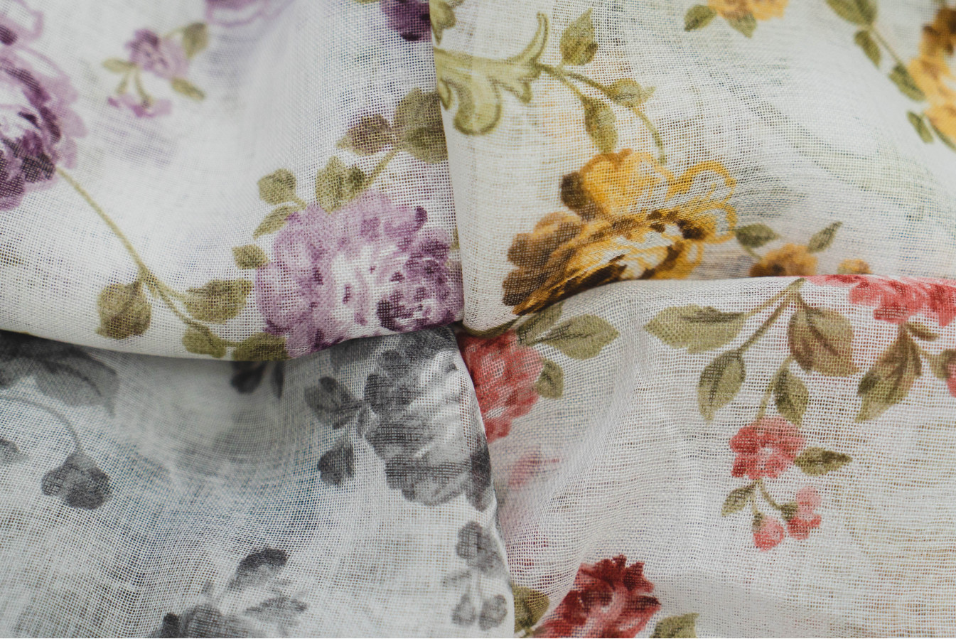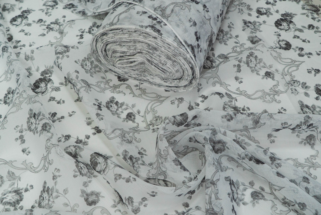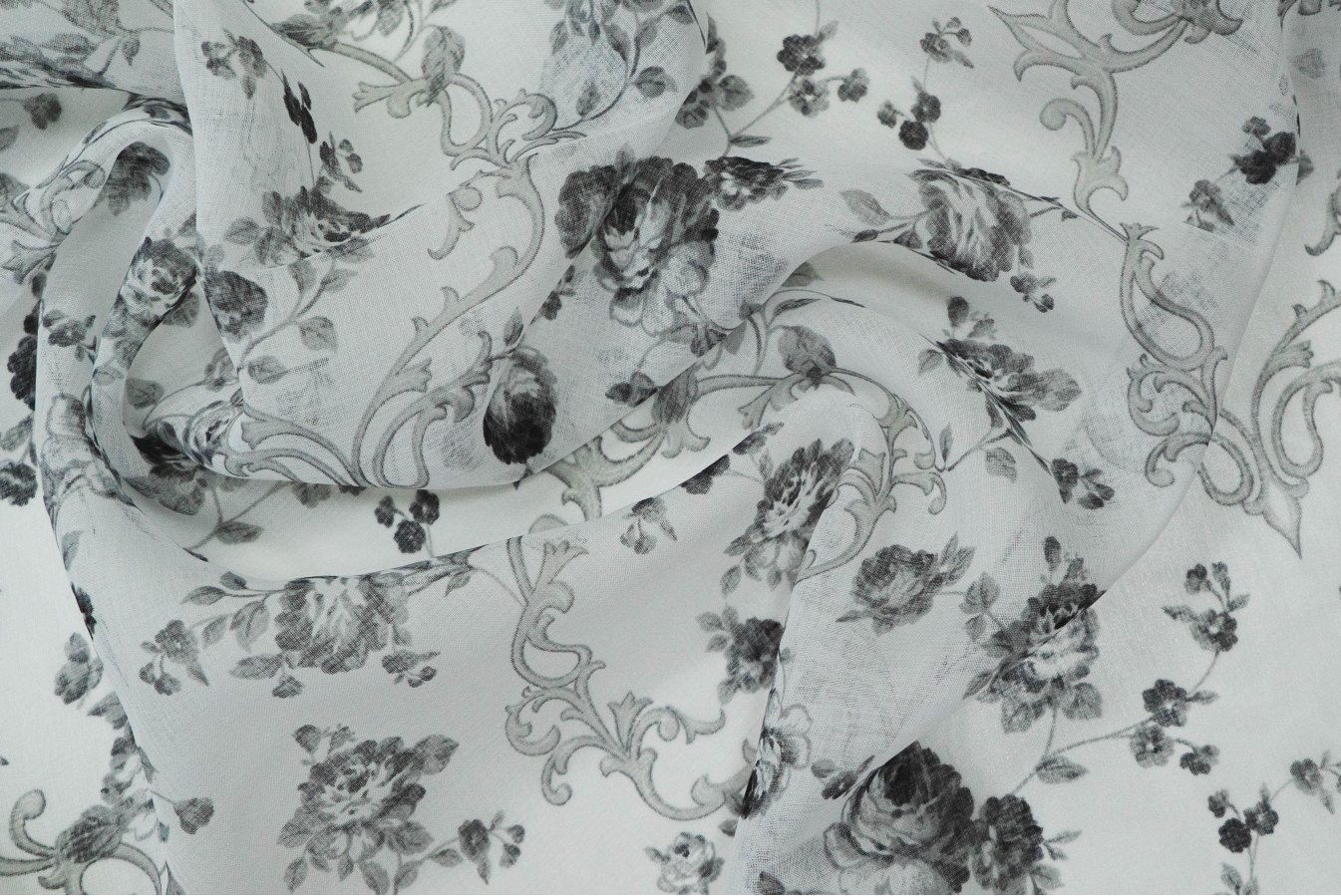 Тюль батист із крупним квітковим малюнком, виконаним технологією текстильного принтування. Принт виконаний у сірій гамі, завдяки чому виглядає контрастно та виразно на білому фоні. Основа гардини характеризується легкістю, напівпрозорістю та матовою поверхнею. У структуру тканини включені потовщені волокна, що надає полотняному плетиву особливої фактурності. Такий тюль підходить для декору вікон практично в будь-якій кімнаті, виглядає дуже повітряно і самобутньо.