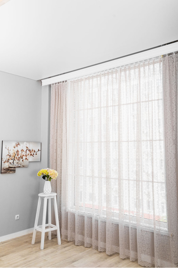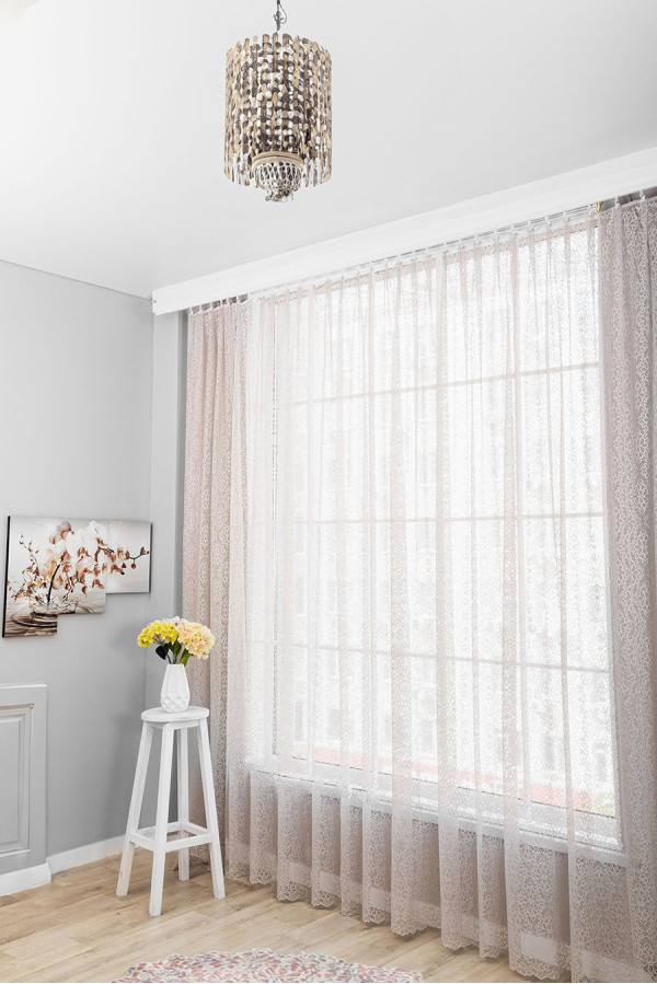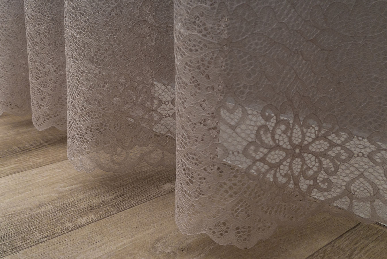 Гіпюровий сітчастий тюль з густим візерунком найтоншого фігурного плетіння. Гардина характеризується витонченим ажурним візерунком і ніжним сяйвом шовковистих волокон, з яких зіткана ця розкішна тканина. Тюль має унікальну здатність відмінно пропускати повітря і при цьому, прекрасно розсіювати денне світло. Тюль виглядає дорого і розкішно, а її багатий візерунок надає декору вікон урочистий і респектабельний вигляд. Не дивлячись на витончений вид, цей матеріал є лідером практичності і невибагливості серед інтер'єрних тканин - не мнеться, не дає усадку і не втрачає свій первісний вигляд після багатьох прань.