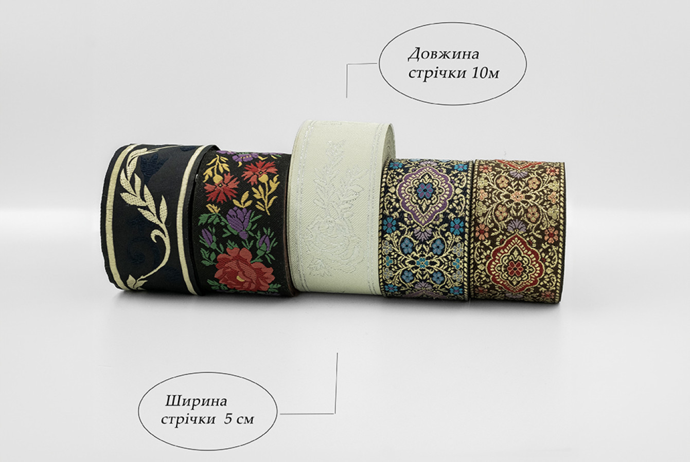Тесьма декоративна із тканими орнаментами в асортименті. Характеризується високою якістю виконання та гарним дизайном. Декоративна тасьма широко використовуються в різних способах оздоблення: в одязі, прикрашанні домашнього текстилю, творчих проектах та багатьох видах рукоділля.