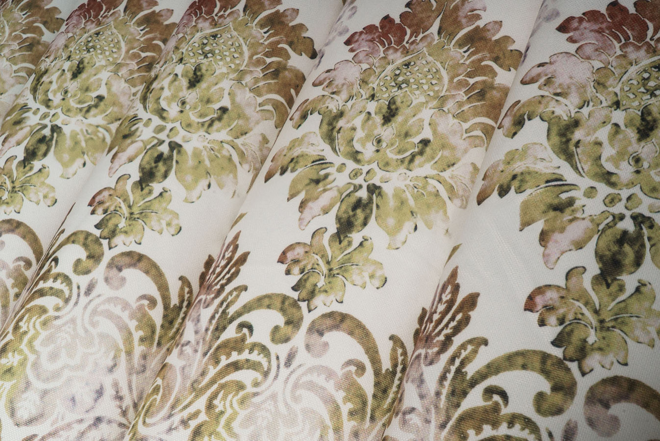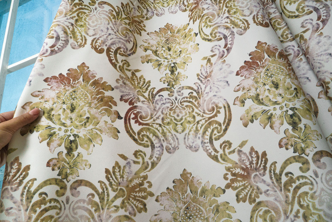 Штори мікровелюр турецького виробництва із принтом у вигляді геральдичного візерунка. Вензельний орнамент має злегка розмиті контури, на кшталт акварельного малюнка. Порт'єри мають матову, коротковорсисту, м'яку і приємну на дотик лицьову поверхню. За структурою це тканина полотняного плетіння середньої щільності. Штори відрізняються високою якістю та найкращими текстильними характеристиками, у драпіровках утворюють рівні та формостійкі складки.