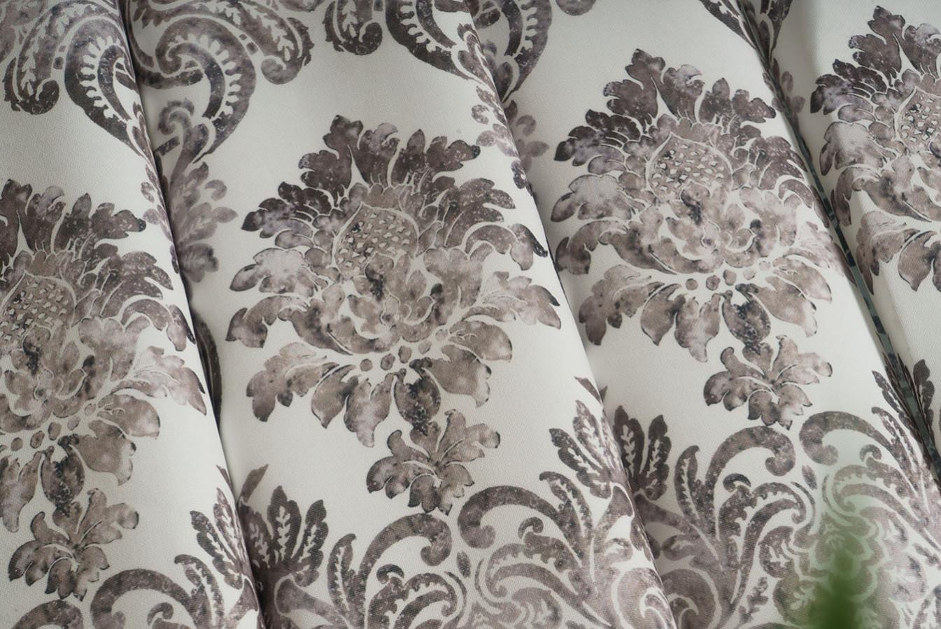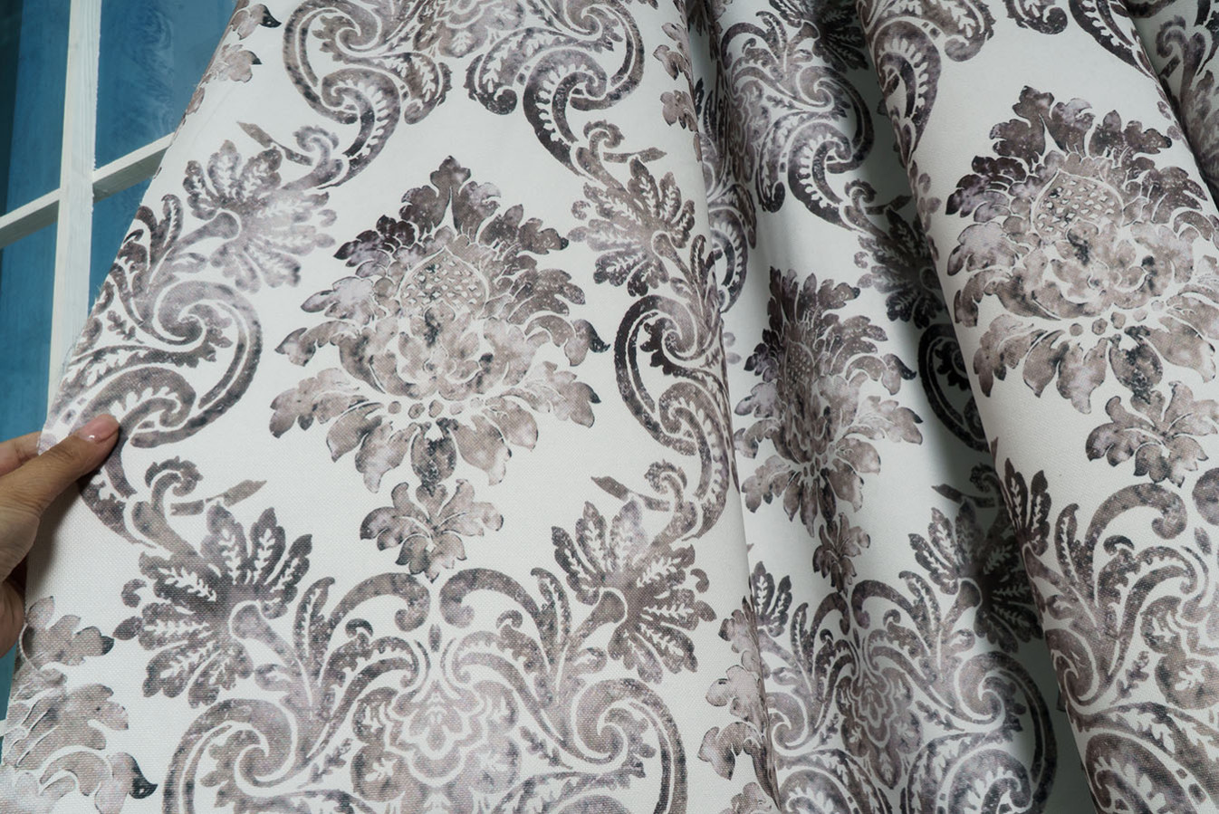Штори мікровелюр турецького виробництва із принтом у вигляді геральдичного візерунка. Вензельний орнамент має злегка розмиті контури, на кшталт акварельного малюнка. Порт'єри мають матову, коротковорсисту, м'яку і приємну на дотик лицьову поверхню. За структурою це тканина полотняного плетіння середньої щільності. Штори відрізняються високою якістю та найкращими текстильними характеристиками, у драпіровках утворюють рівні та формостійкі складки.