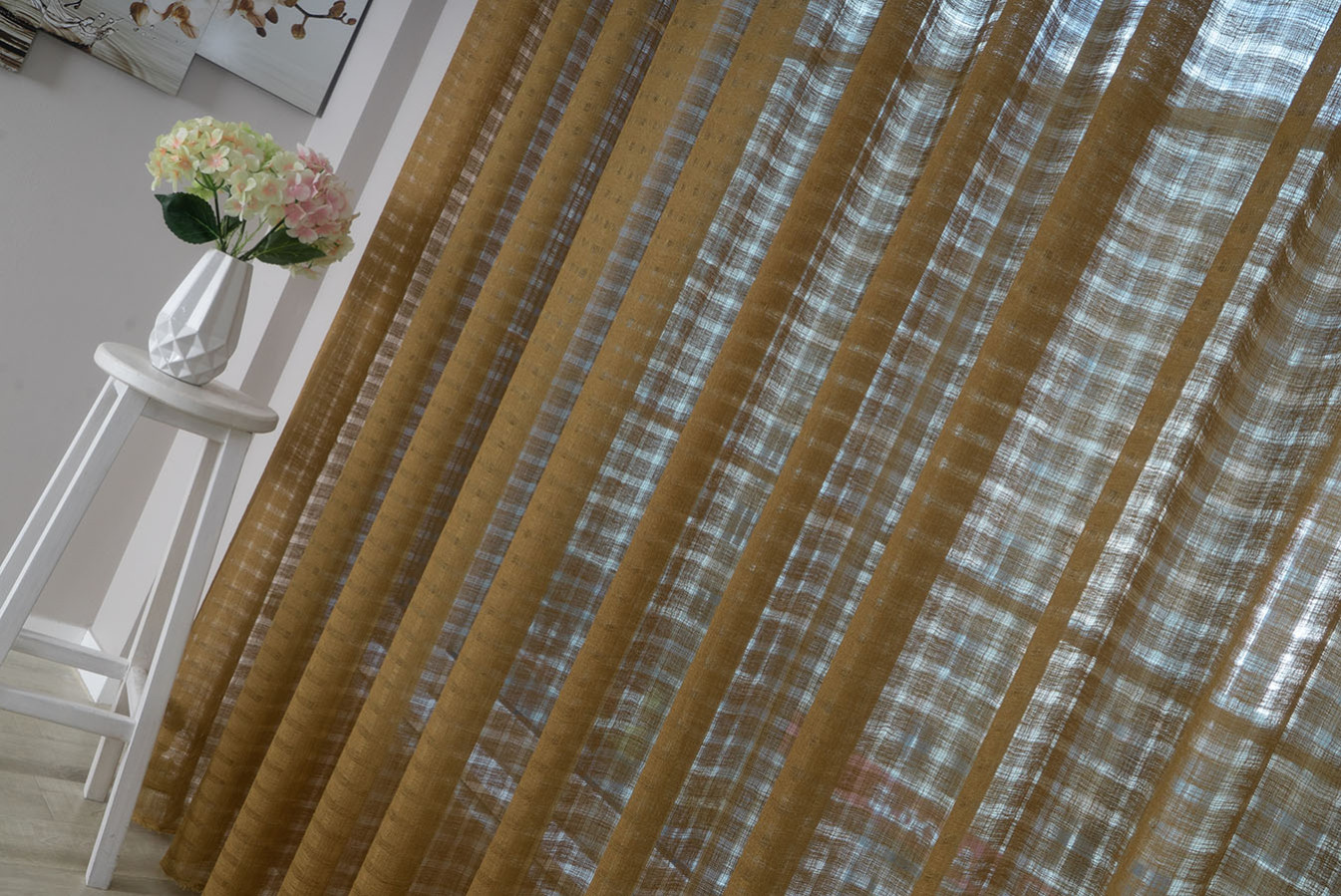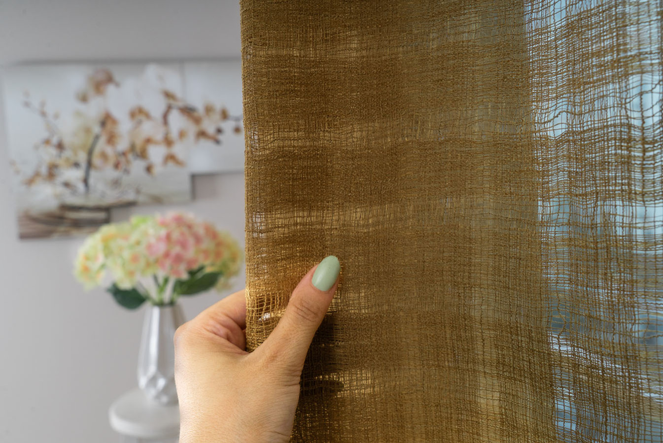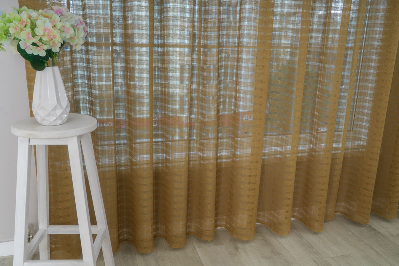 Теракотовий тюль льон з ритмічним візерунком, що нагадує клітинку. Плетіння волокон має пухку і фактурну структуру, що утворює сітчасту тканину. Не дивлячись на делікатний зовнішній вигляд, тюль відмінно тримає форму і не дає усадку, завдяки спеціальним добавкам в складі тканини. Це відмінний варіант для оформлення лаконічних і стильних інтер'єрів, а також прекрасно підходить для декору вікон на кухнях.