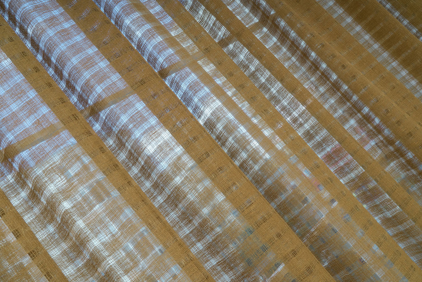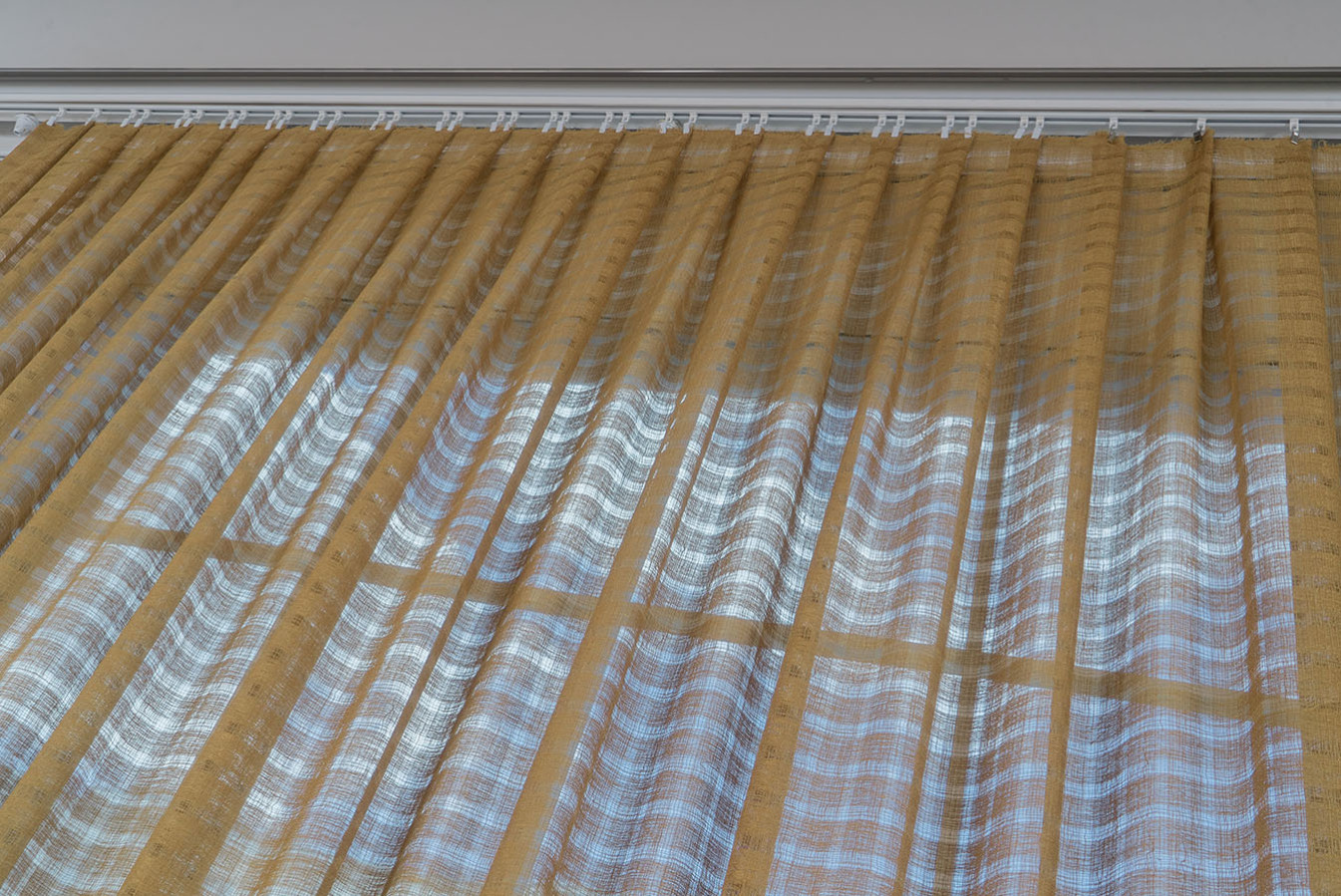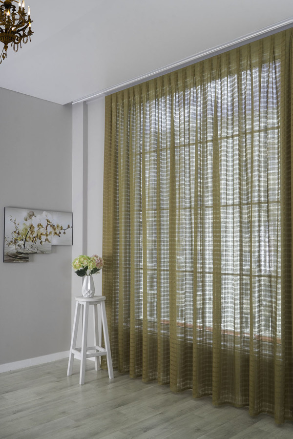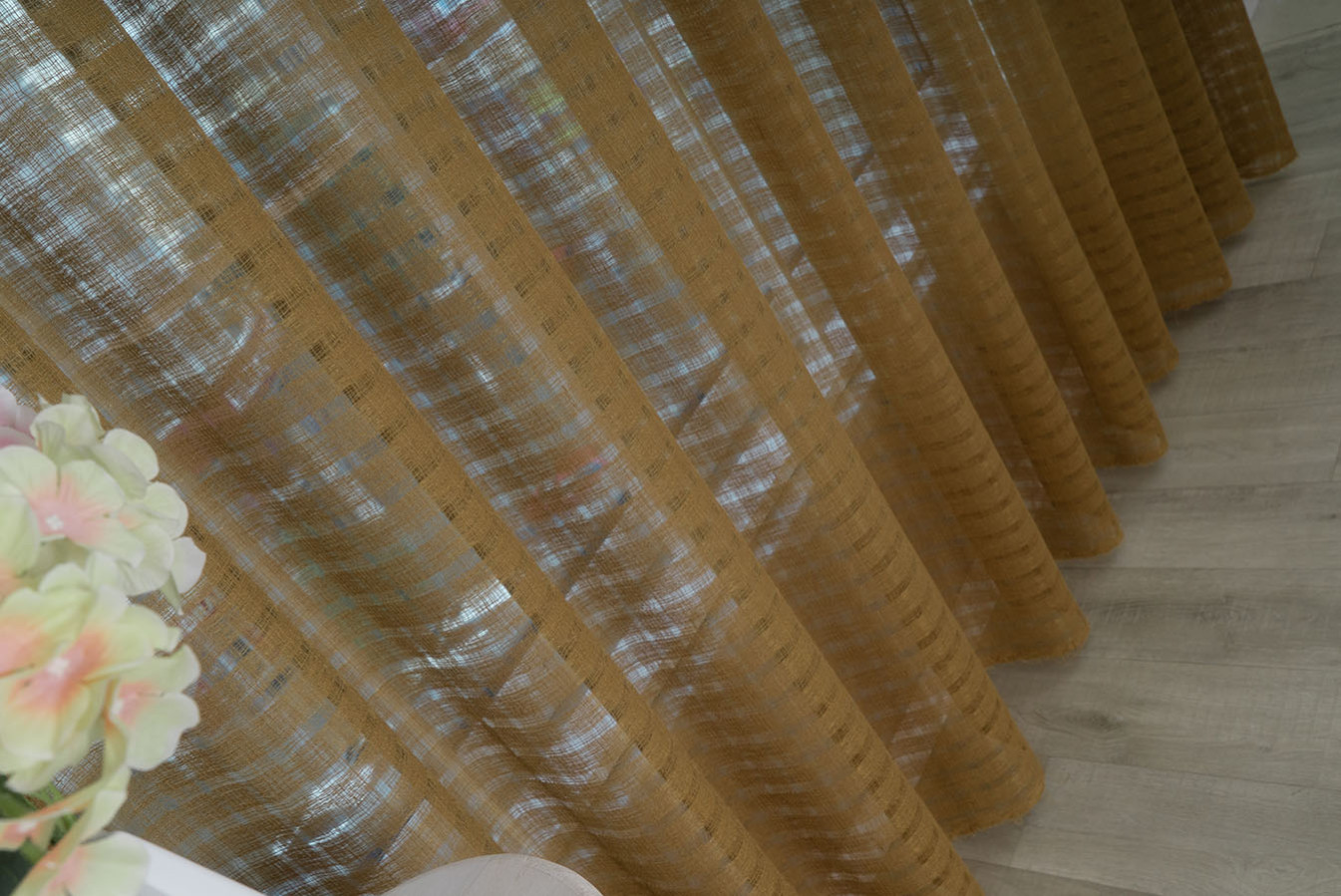 Теракотовий тюль льон з ритмічним візерунком, що нагадує клітинку. Плетіння волокон має пухку і фактурну структуру, що утворює сітчасту тканину. Не дивлячись на делікатний зовнішній вигляд, тюль відмінно тримає форму і не дає усадку, завдяки спеціальним добавкам в складі тканини. Це відмінний варіант для оформлення лаконічних і стильних інтер'єрів, а також прекрасно підходить для декору вікон на кухнях.
