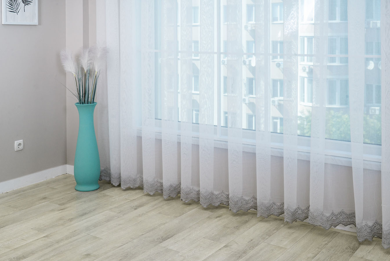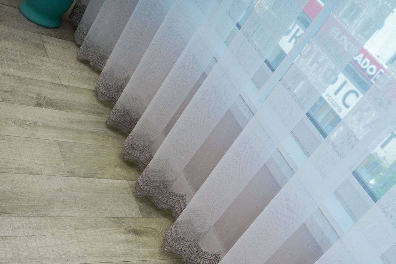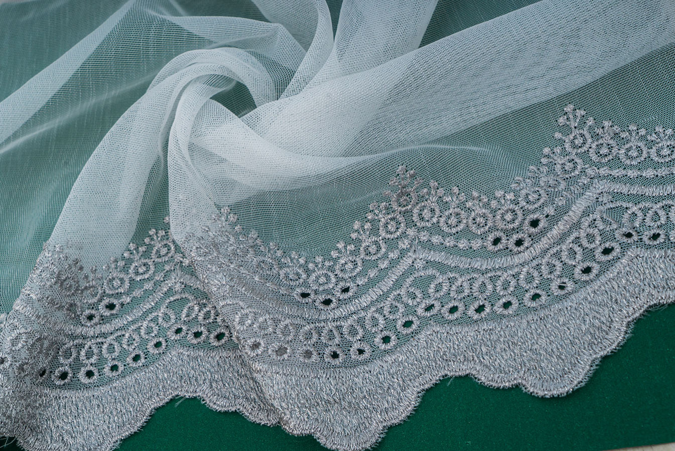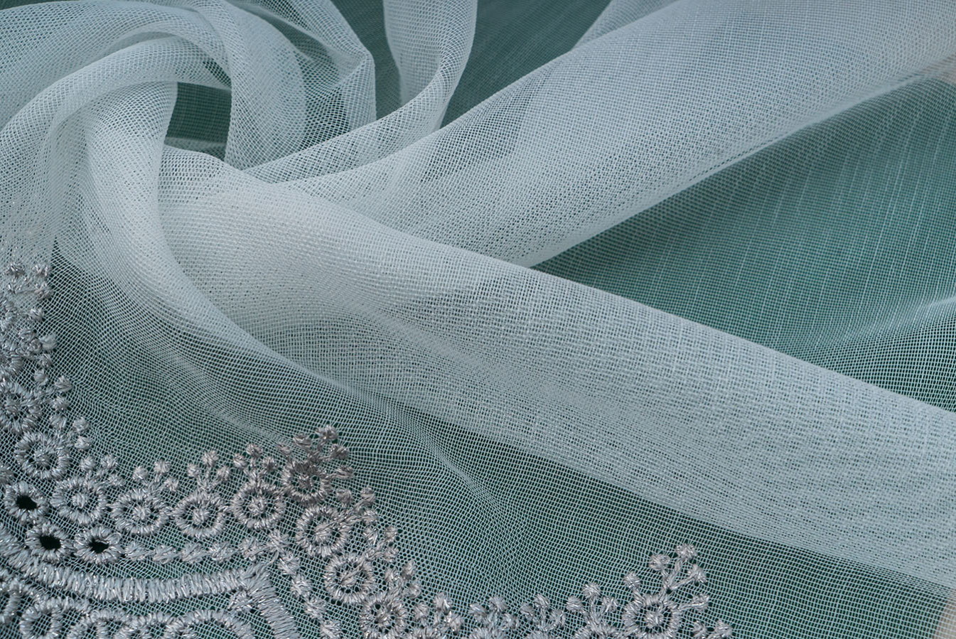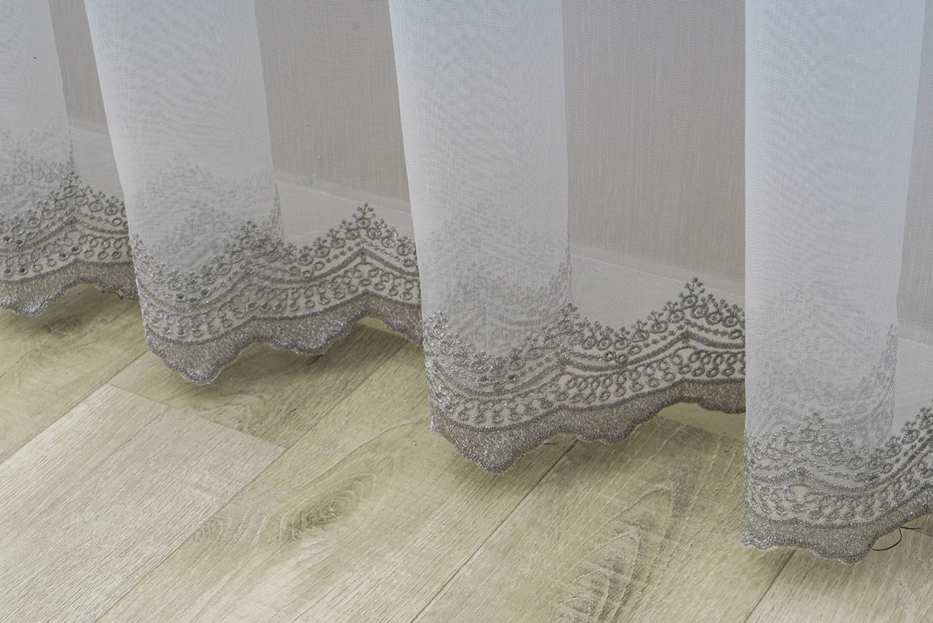 Тюль бамбук із мереживною вишивкою, розташованою по низу полотна. Основа гардини являє собою напівпрозору тканину з матовою поверхнею і дрібносітчастою структурою плетіння. Декоративне шиття виконано рельєфним виразним швом, а нижній край оброблений як фігурна щільна окантовка. У драпіровках тюль створює легкі волани, що вільно і красиво струмують. Це універсальний варіант для будь-якого інтер'єру, завіси виглядають ніжно та повітряно, надають декору вікон свіжого та привабливого вигляду.