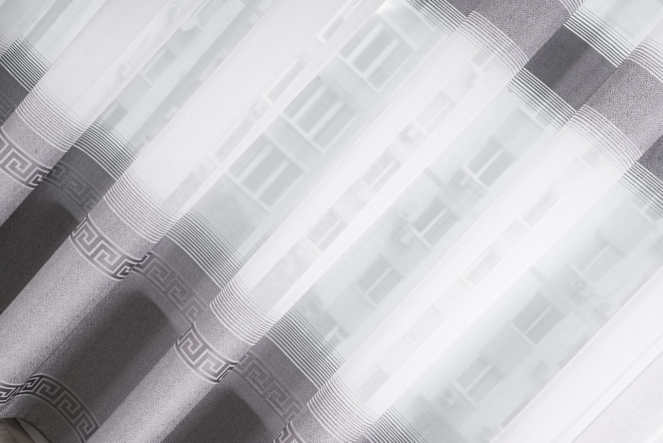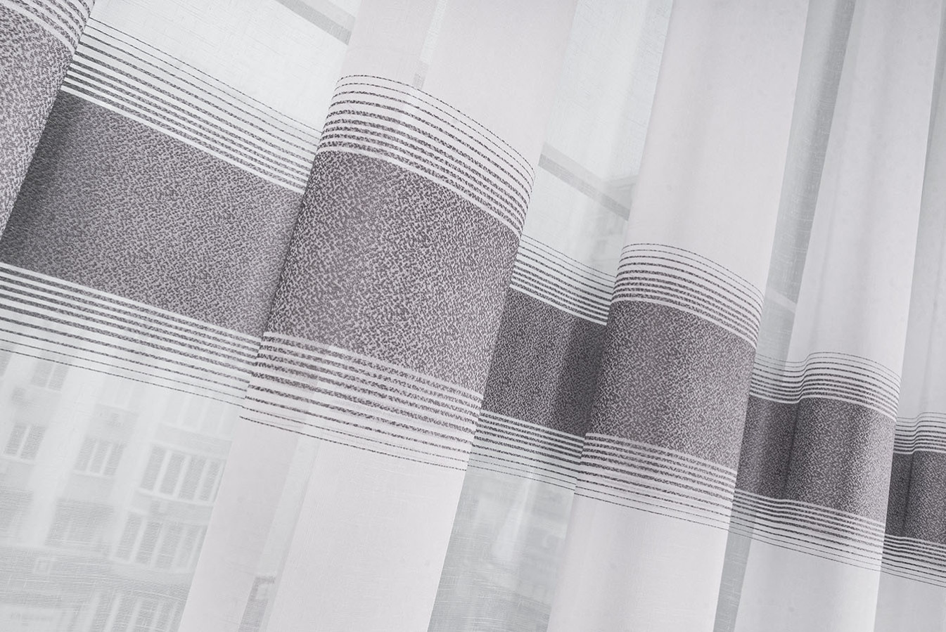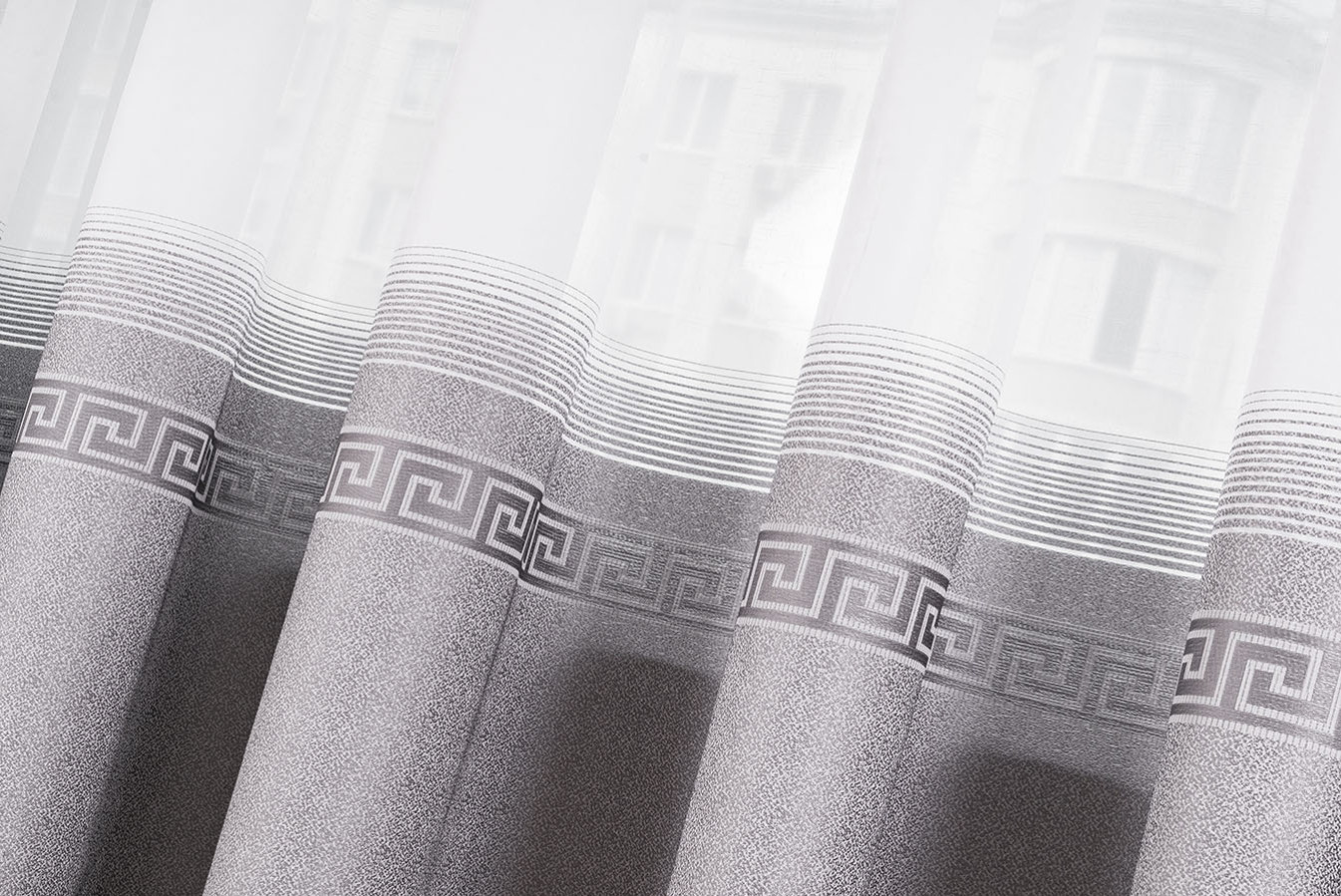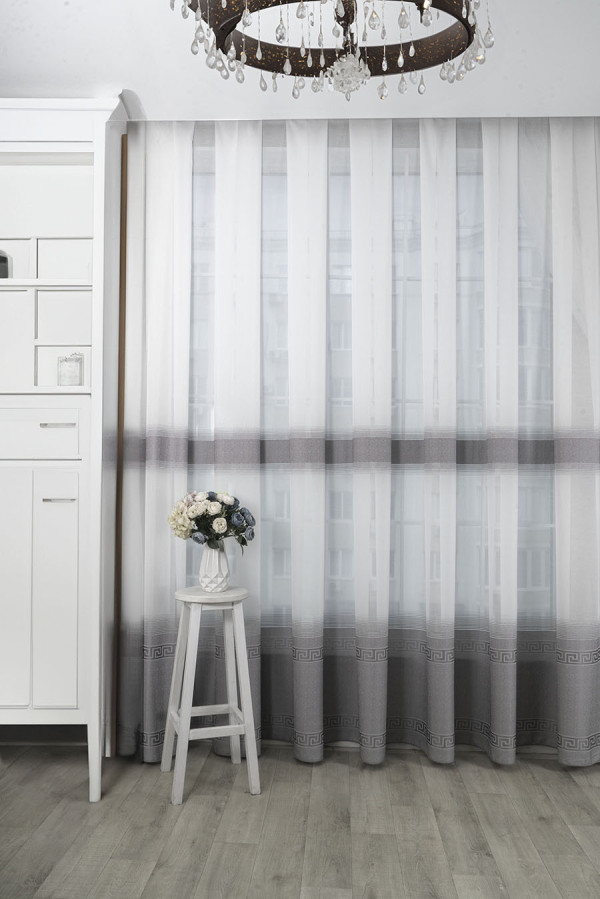 Турецький тюль на основі тканини під льон з широкою смугою по низу. Основа гардини — це матова напівпрозора тканина з виразним полотняним плетінням ниток. Купон оформлений як щільна жаккардовая смуга з візерунчастою структурою і орнаментом "міандр". Тюль виглядає свіжо і стильно, а його оригінальний дизайн прекрасно впишеться в будь-який інтер'єр.