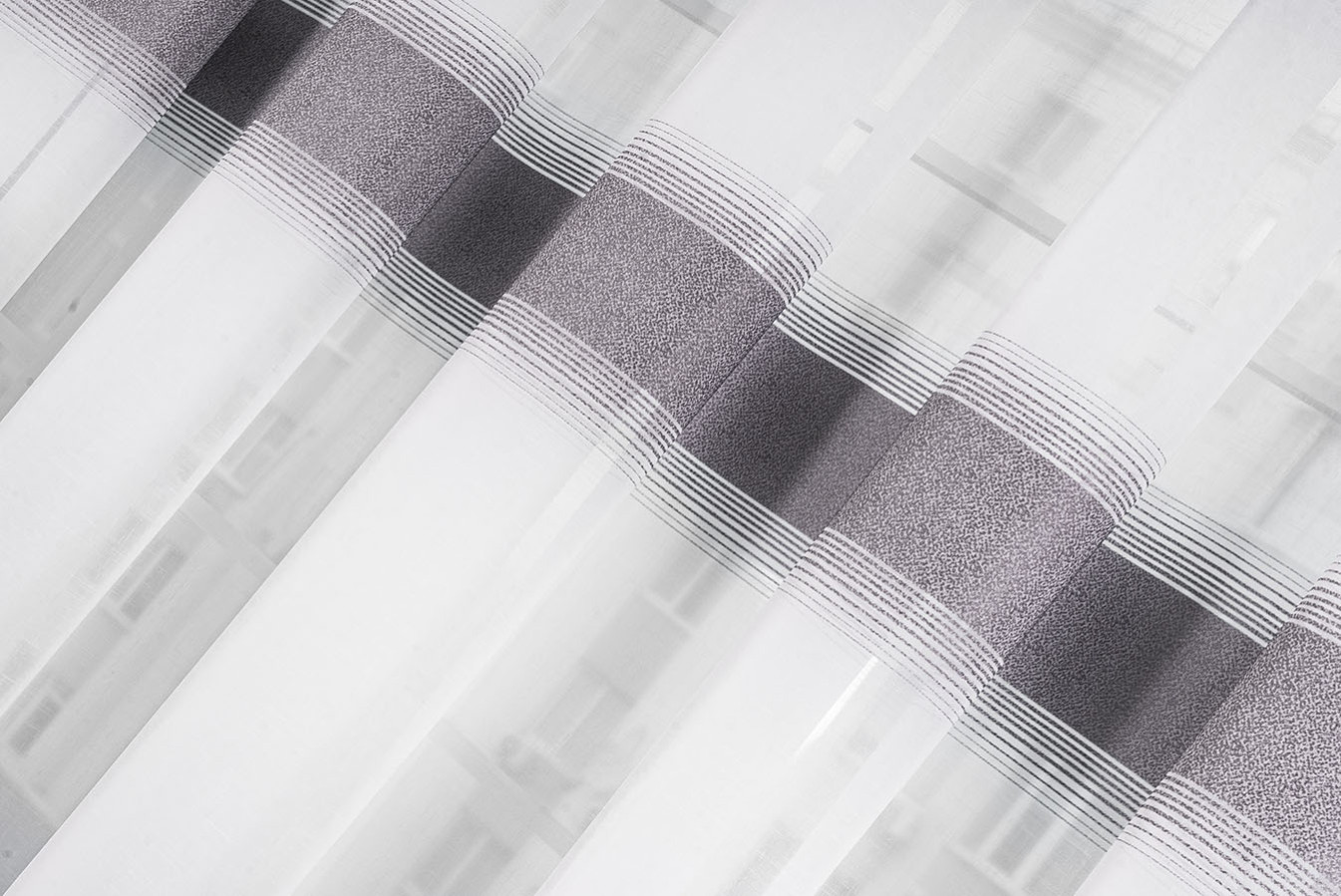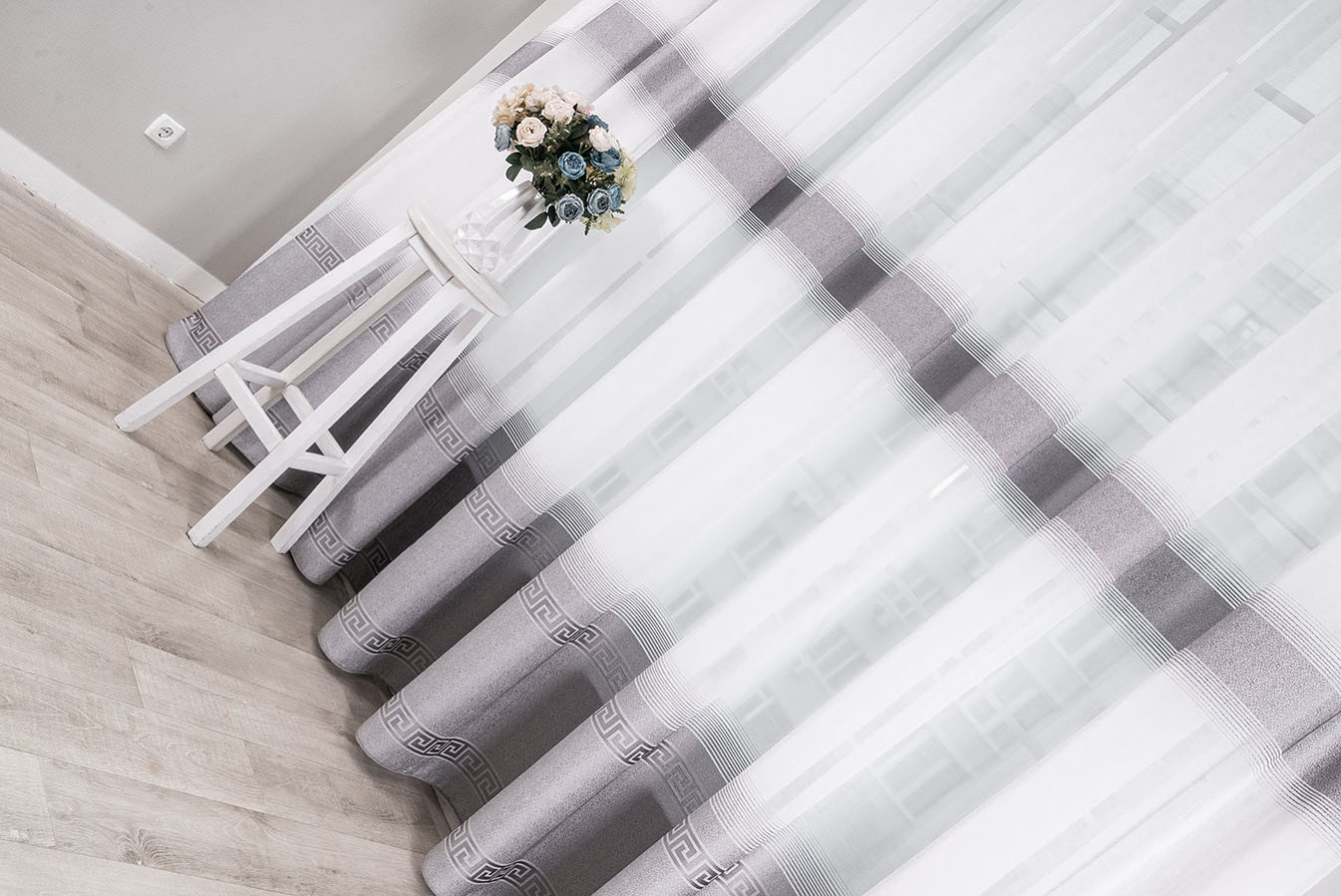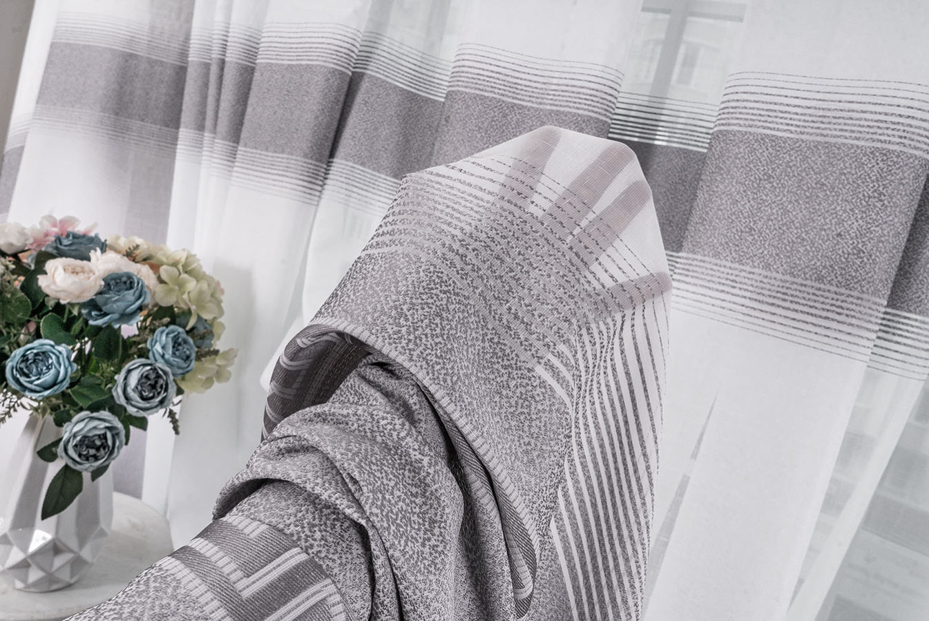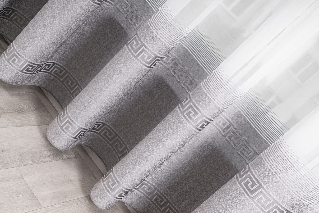 Турецький тюль на основі тканини під льон з широкою смугою по низу. Основа гардини — це матова напівпрозора тканина з виразним полотняним плетінням ниток. Купон оформлений як щільна жаккардовая смуга з візерунчастою структурою і орнаментом "міандр". Тюль виглядає свіжо і стильно, а його оригінальний дизайн прекрасно впишеться в будь-який інтер'єр.