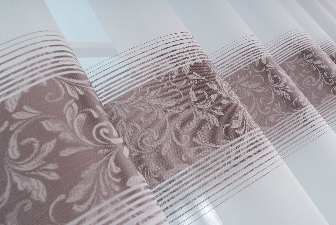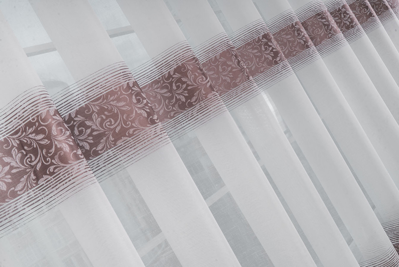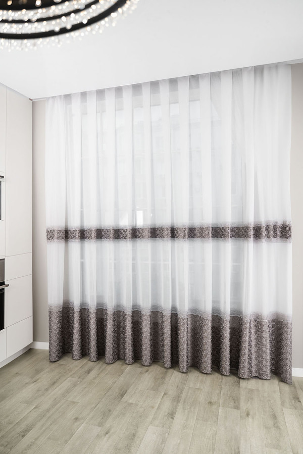 Турецький тюль на основі тканини під льон з широкою смугою по низу. Основа гардини — це матова напівпрозора тканина з виразним полотняним плетінням ниток. Купон оформлений як щільна жаккардовая смуга з фактурним рослинним візерунком. Тюль виглядає свіжо і стильно, а його оригінальний дизайн прекрасно впишеться в будь-який інтер'єр.