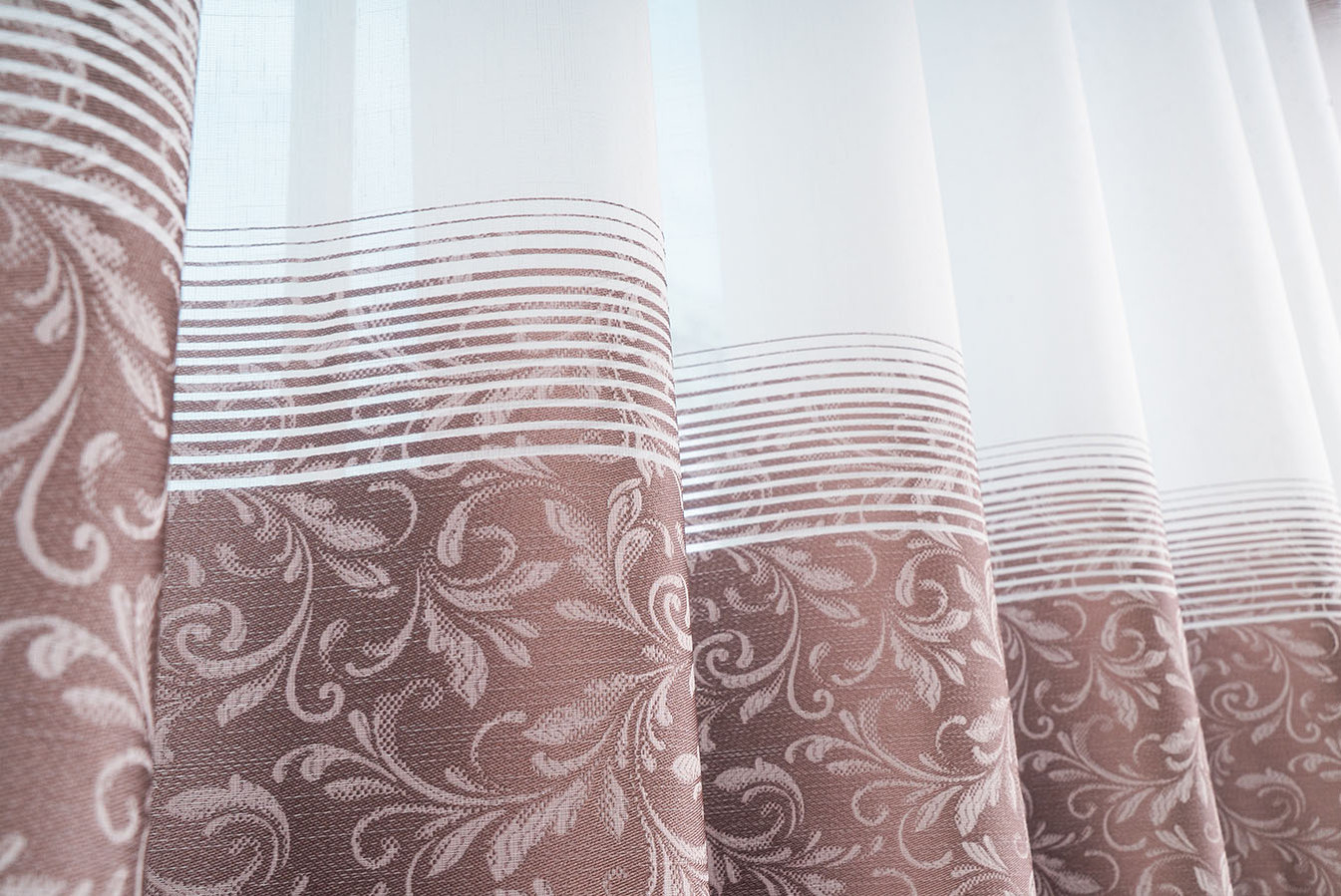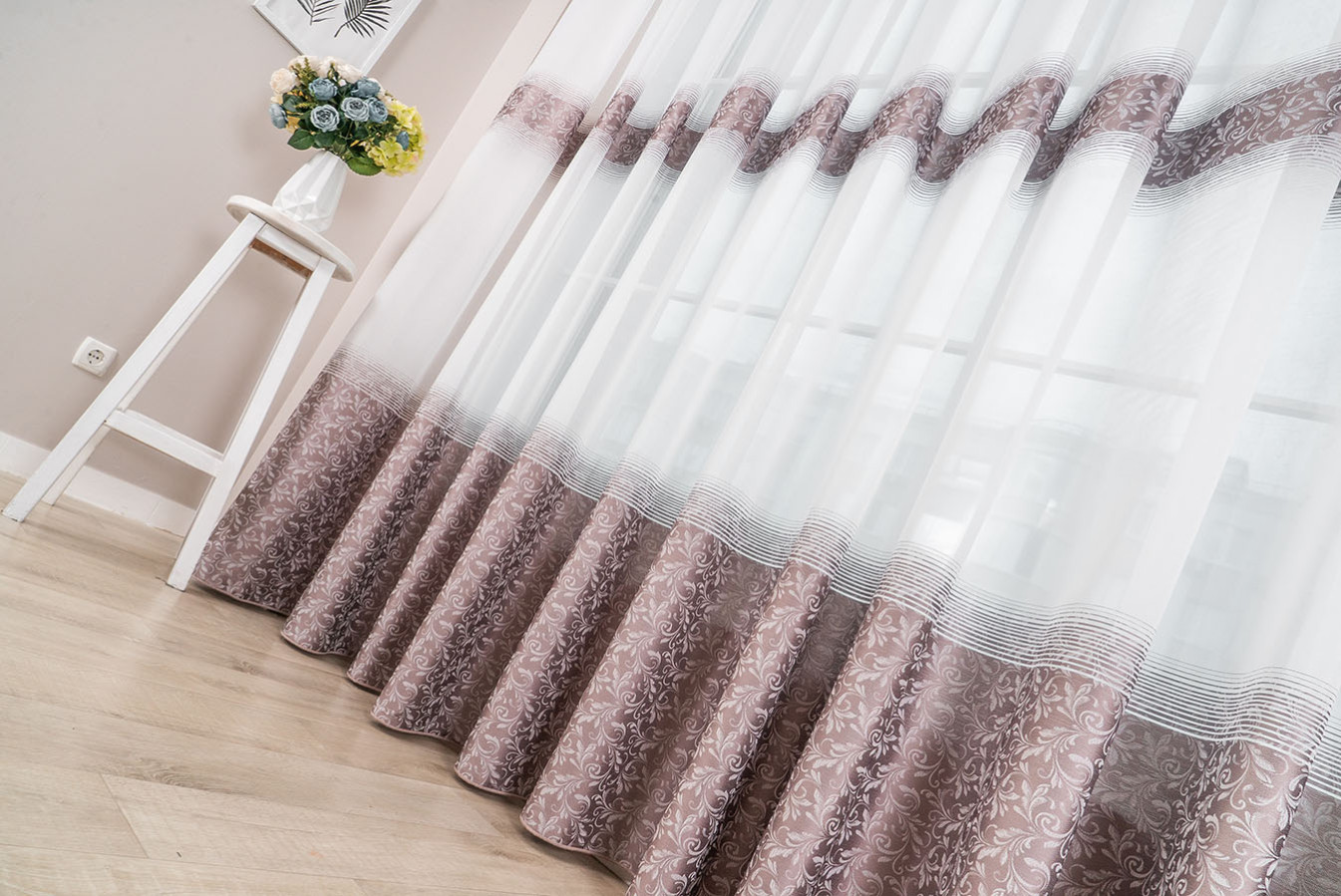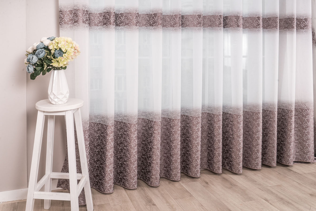 Турецький тюль на основі тканини під льон з широкою смугою по низу. Основа гардини — це матова напівпрозора тканина з виразним полотняним плетінням ниток. Купон оформлений як щільна жаккардовая смуга з фактурним рослинним візерунком. Тюль виглядає свіжо і стильно, а його оригінальний дизайн прекрасно впишеться в будь-який інтер'єр.