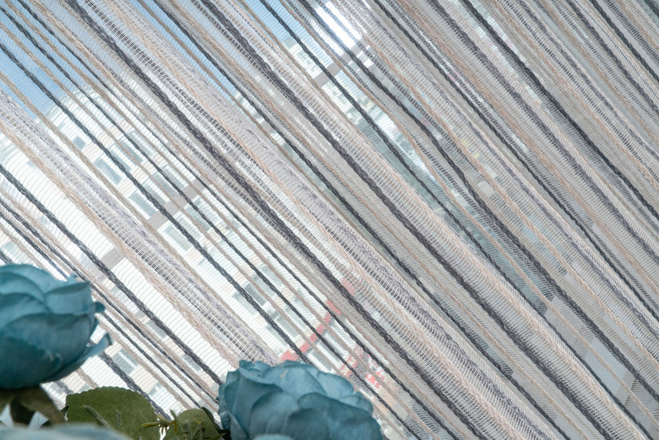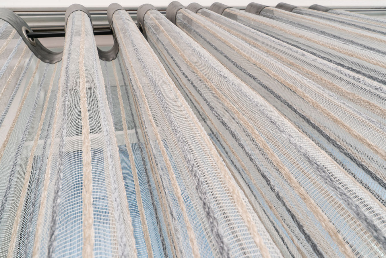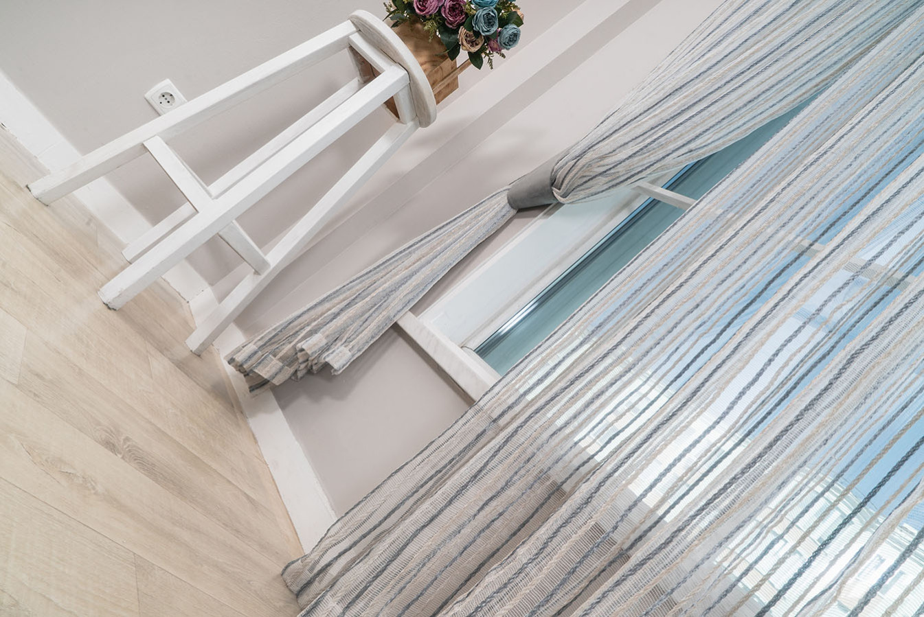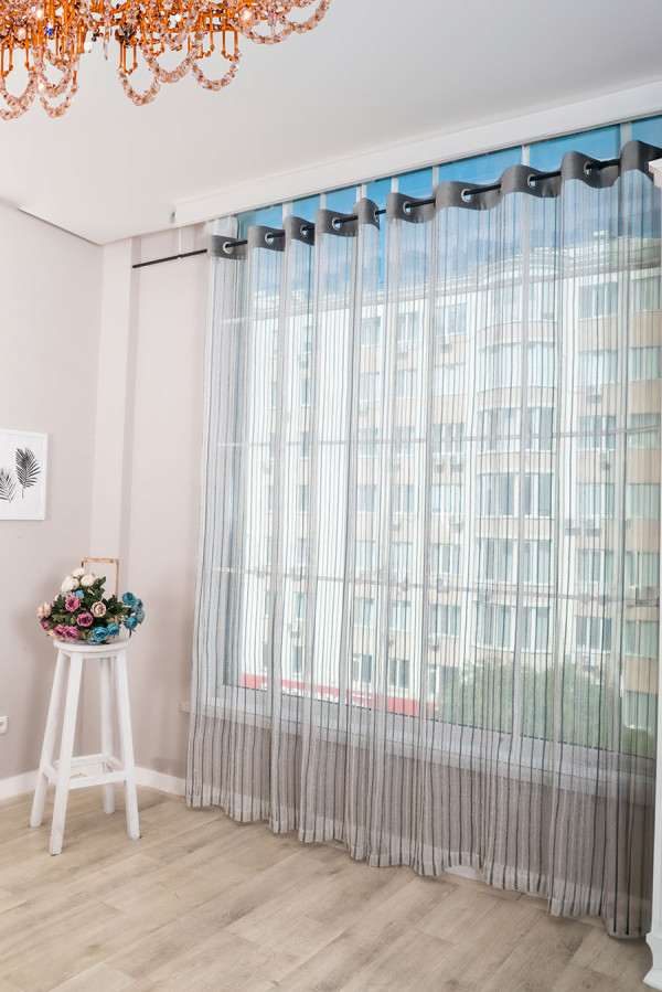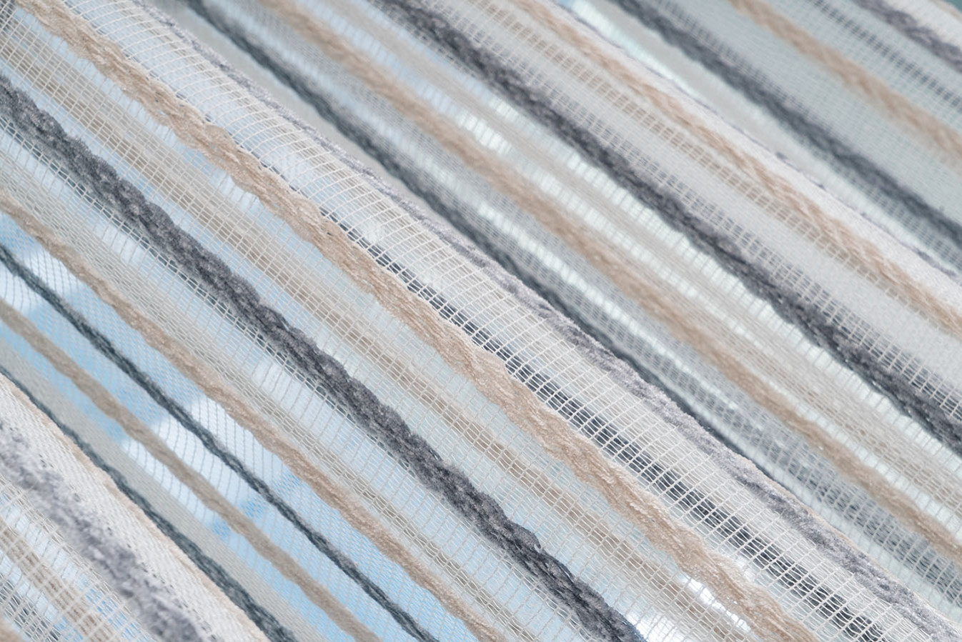 Льняна завіса з сітчастою структурою і вертикальними смужками шириною близько 6 мм. Смуги виконані декоративним вплітанням об'ємних пухнастих ниток бежевого і сірого відтінків. Таке виконання робить поверхню тканини рельєфною, а смужки опуклими. Тюль виглядає стильно і дуже привабливо, а також, цілком самодостатній, щоб прикрашати вікна без поєднання зі шторами.