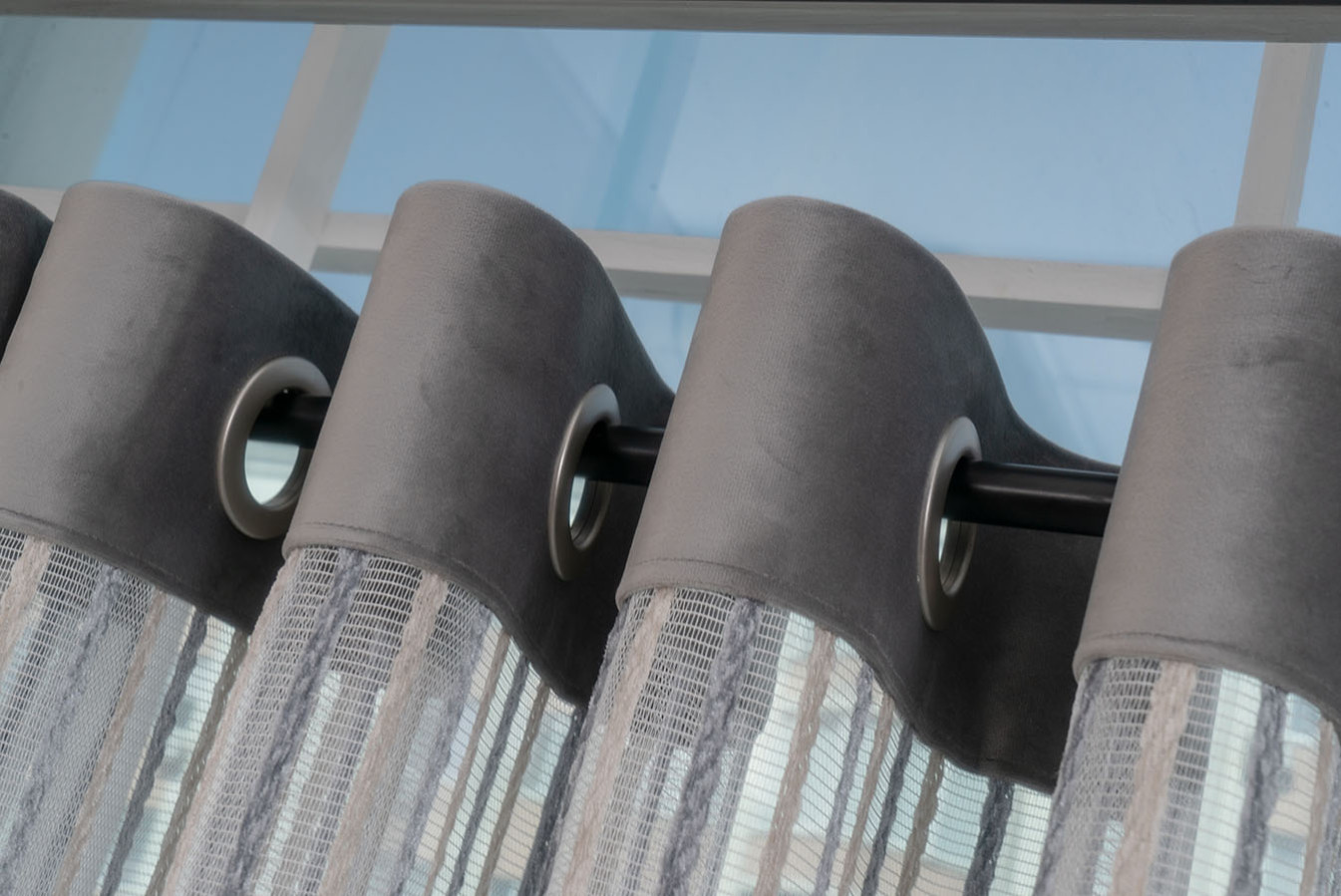 Фіранка пошита на люверси з манжетом із сірого мікрооксамиту, в комплекті два підхвата.