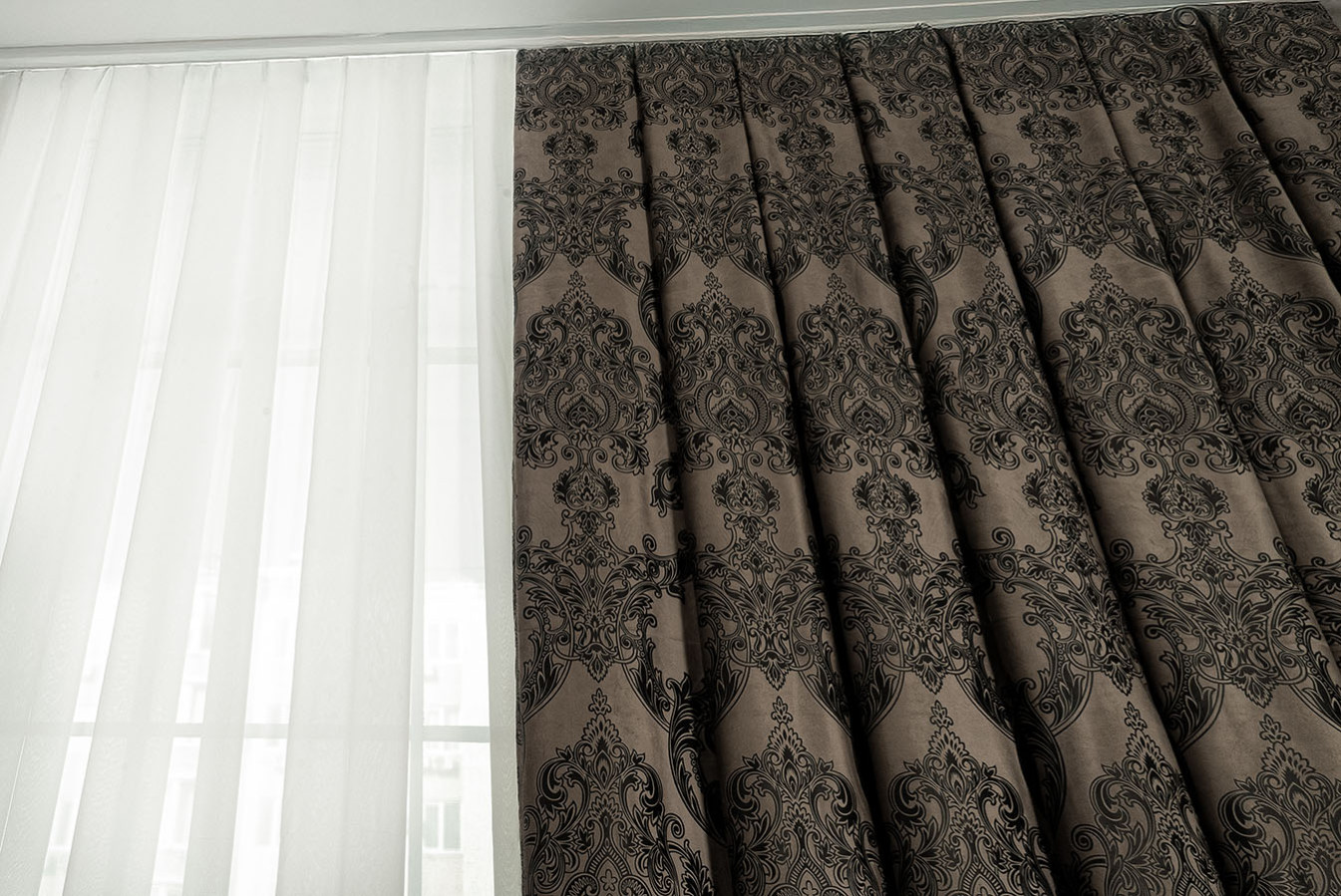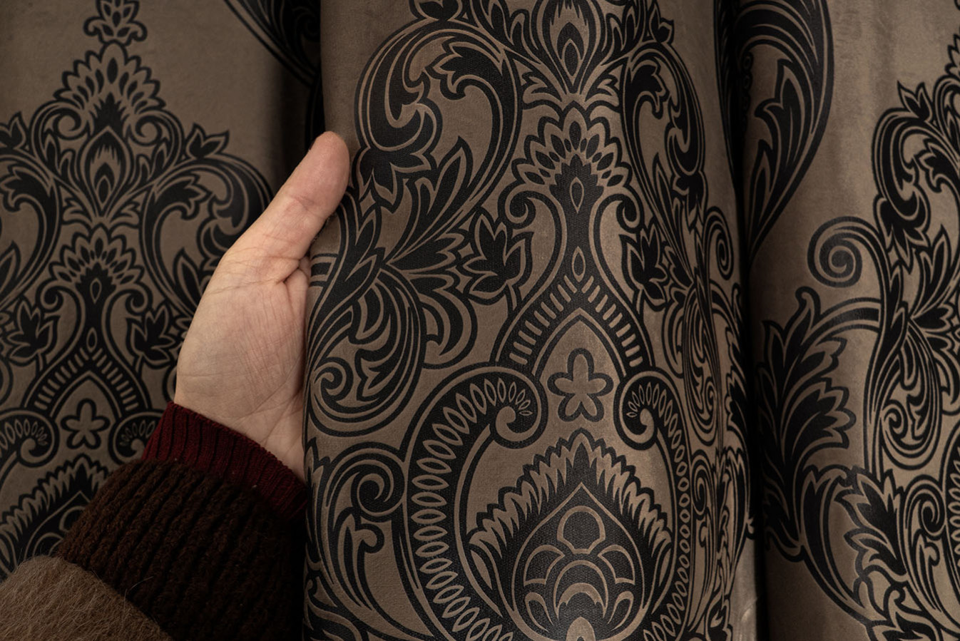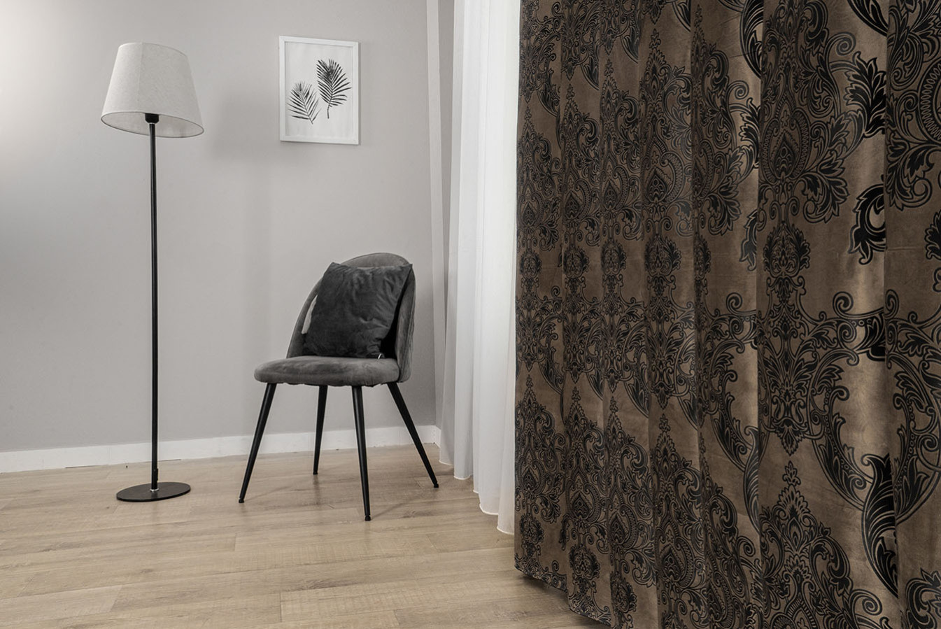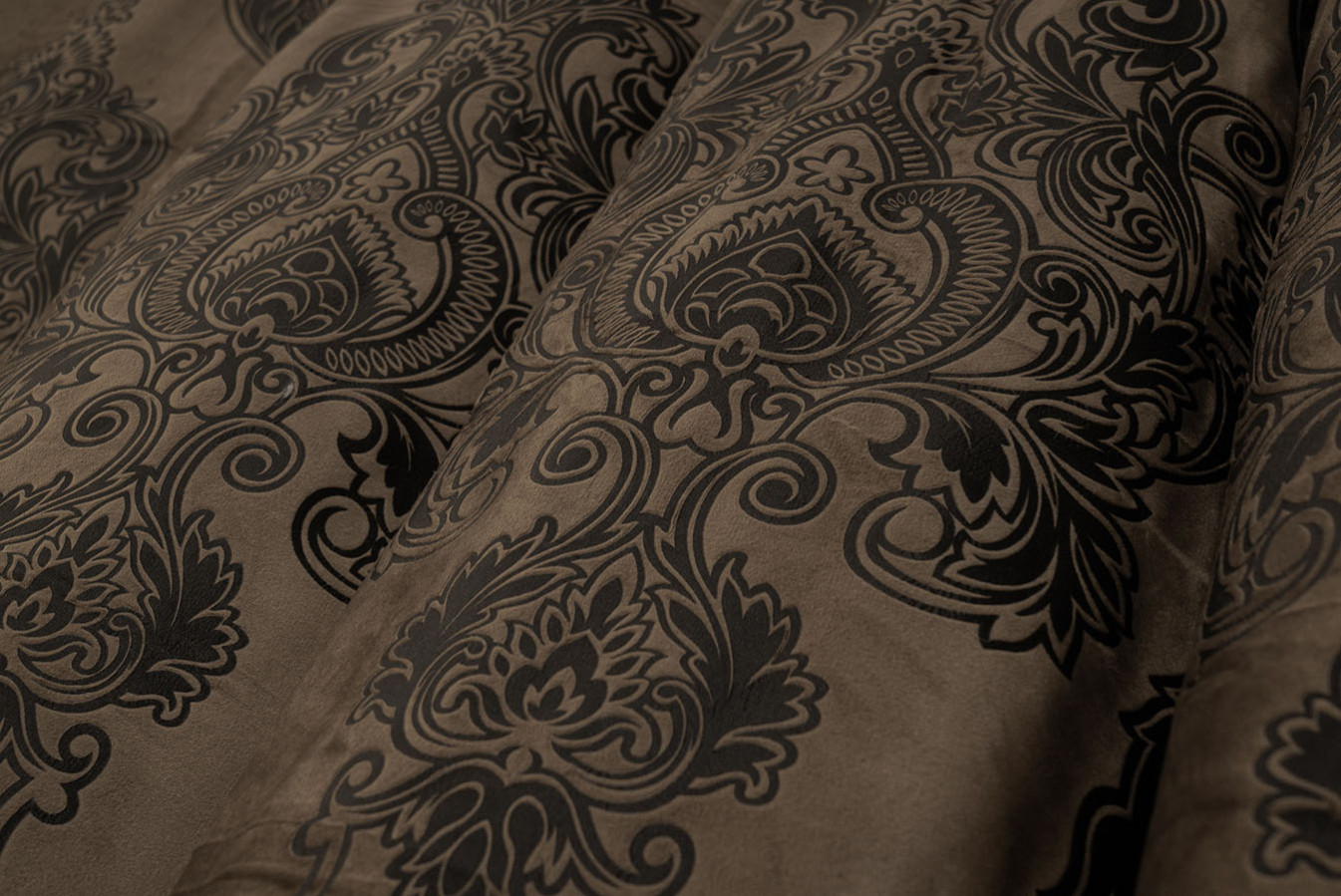 Коричневі штори оксамит із великим геральдичним візерунком "корона". Орнамент виконаний шляхом текстильного тиснення, завдяки якому, вийшов чіткий з точними дрібними деталями малюнок. Елементи візерунка мають графітовий відтінок та чіткі, виразні контури. А основа портьєри характеризується приємною на дотик, ворсистою поверхнею з ніжним бархатистим відливом. У драпіровках ця тканина утворює м'які фальди, що вільно струмують. Цей розкішний варіант штор ідеально підходить для випадків, коли потрібно надати інтер'єру нотки шику та аристократизму.