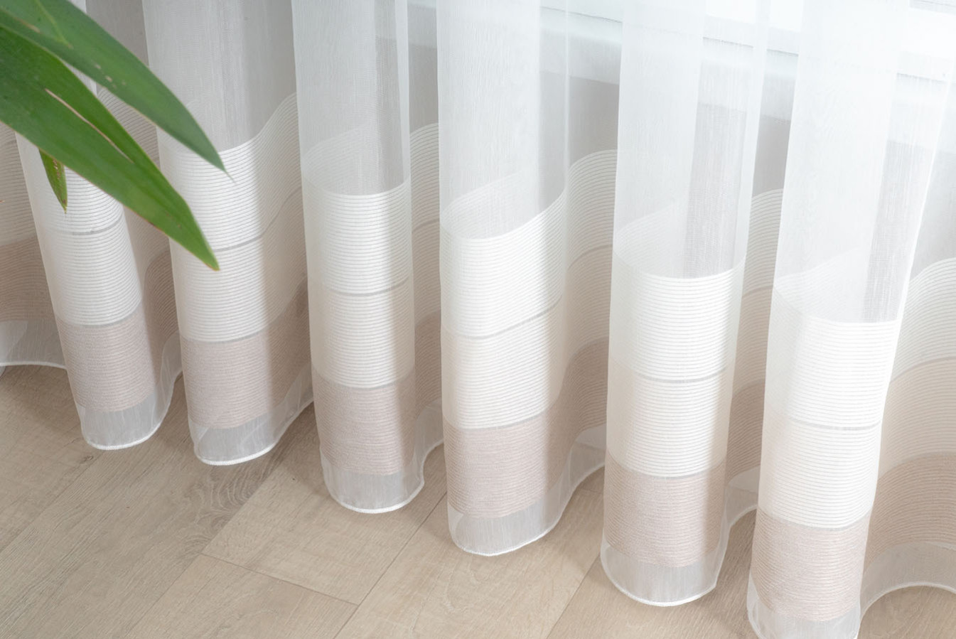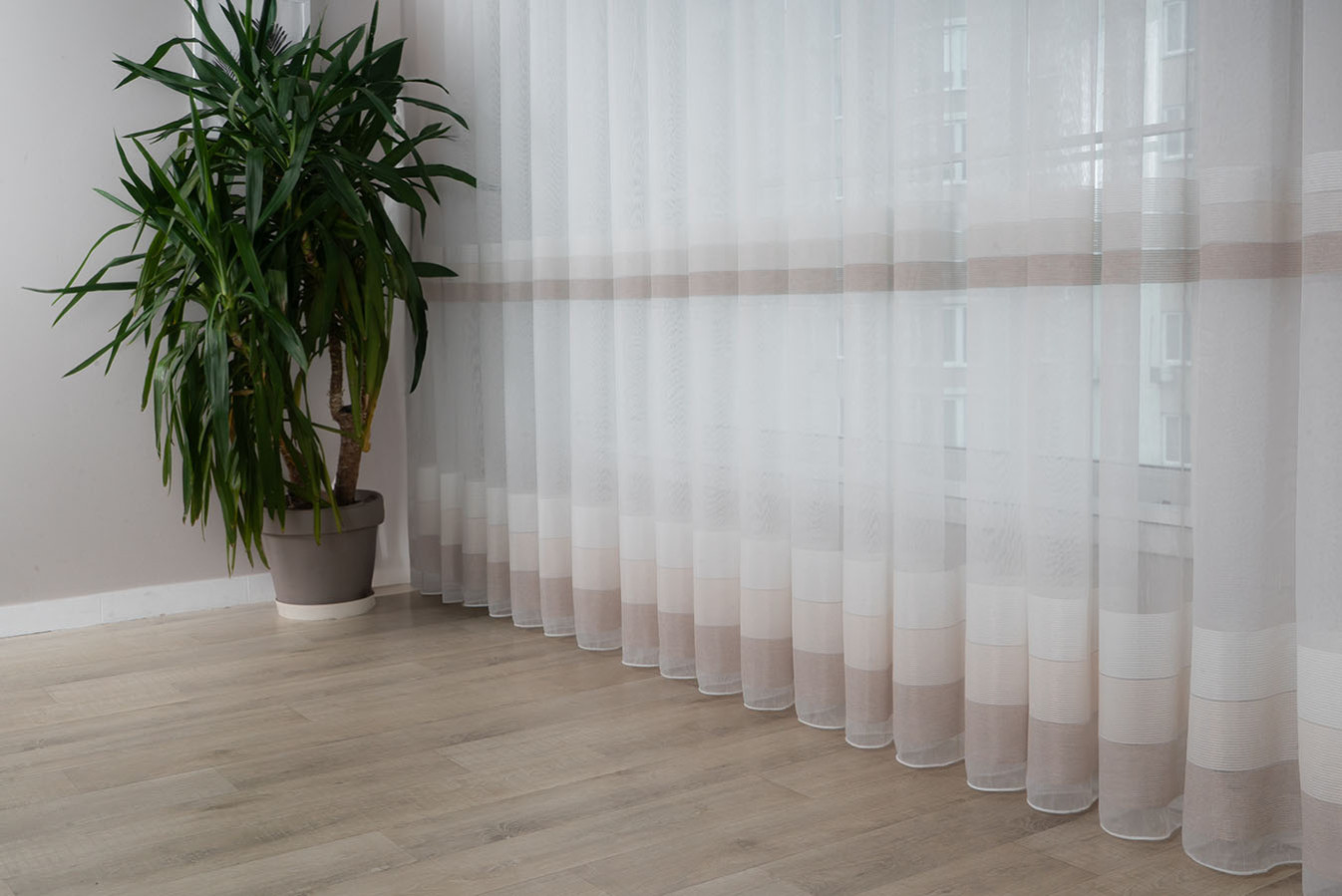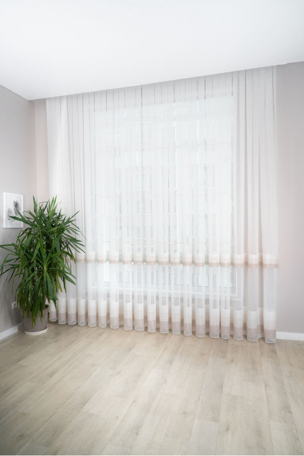 Тюль бамбук турецького виробництва зі смужками — це легка, напівпрозора гардина із двома рядами щільних смуг, розташованих по нижній частині полотна. Фактура тюлю бамбук імітує натуральне переплетення бамбукових волокон, поверхня тканини має матовий відлив. Такий тюль виглядає легким і повітряним, забезпечує м'яке розсіювання світла та надає приміщенню затишку та природної гармонії. Обтяжувач по низу полотна забезпечує об'ємну і стійку форму драпіруванням. Лаконічний дизайн гардини ідеально підходить для екостилю, мінімалізму та класичних інтер'єрів.