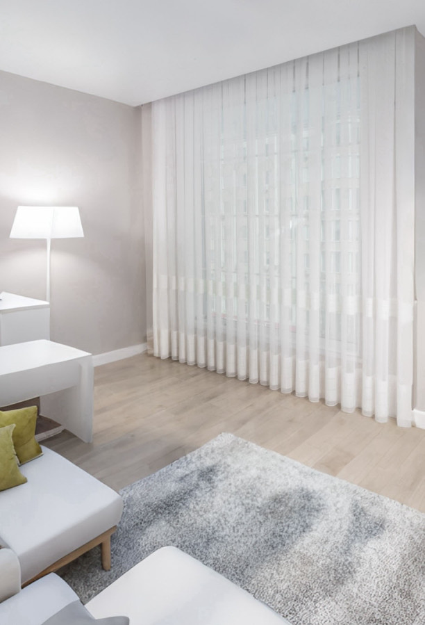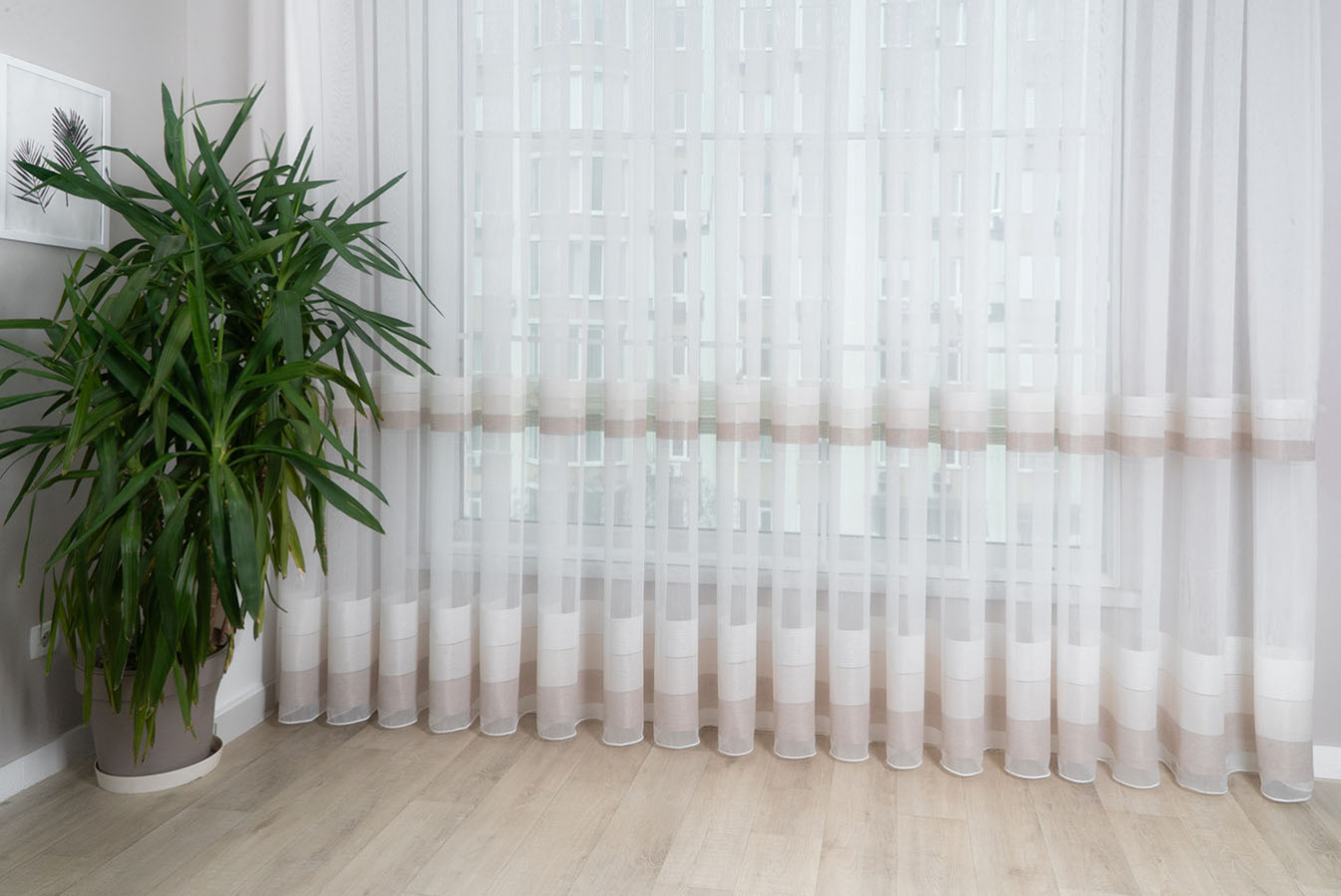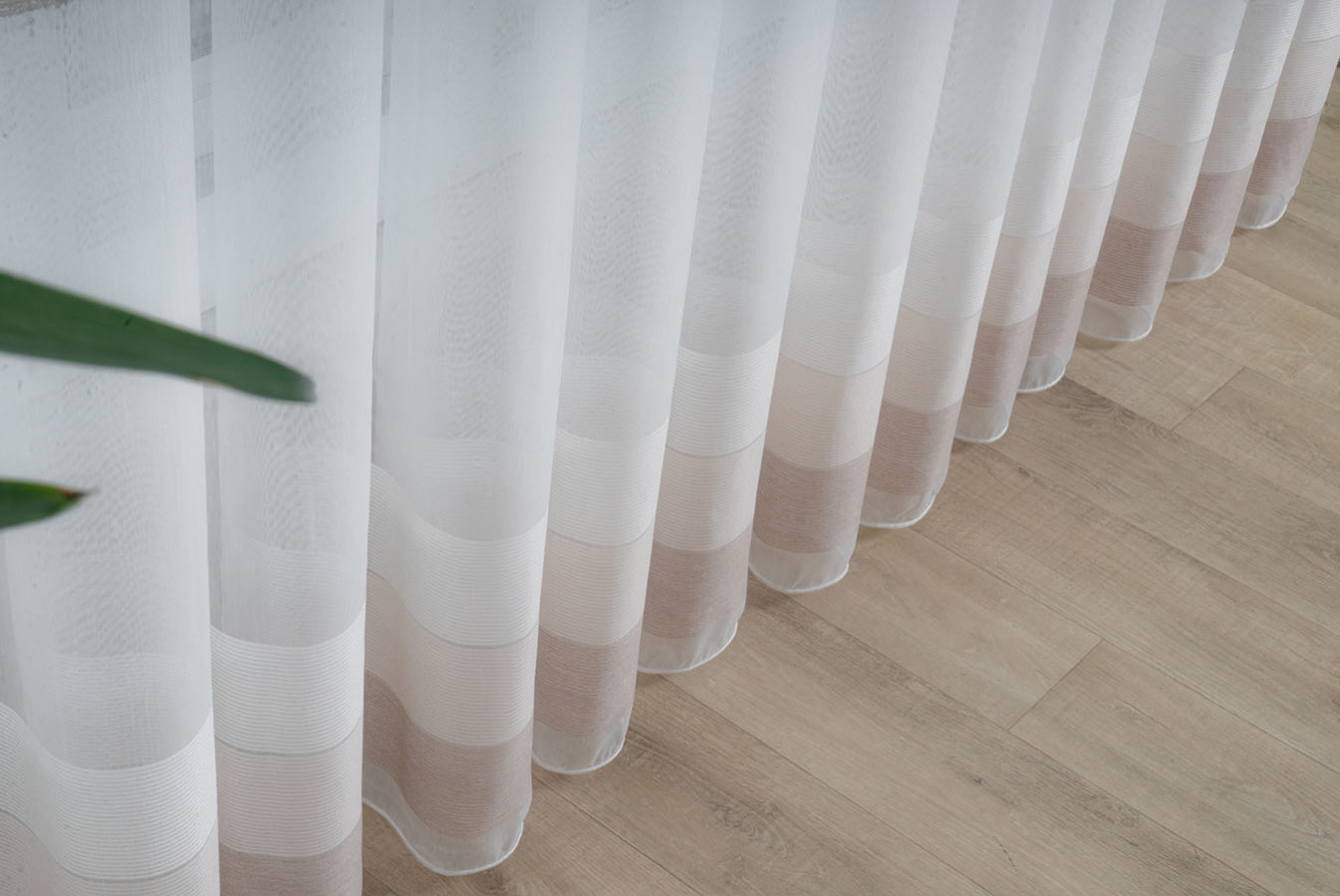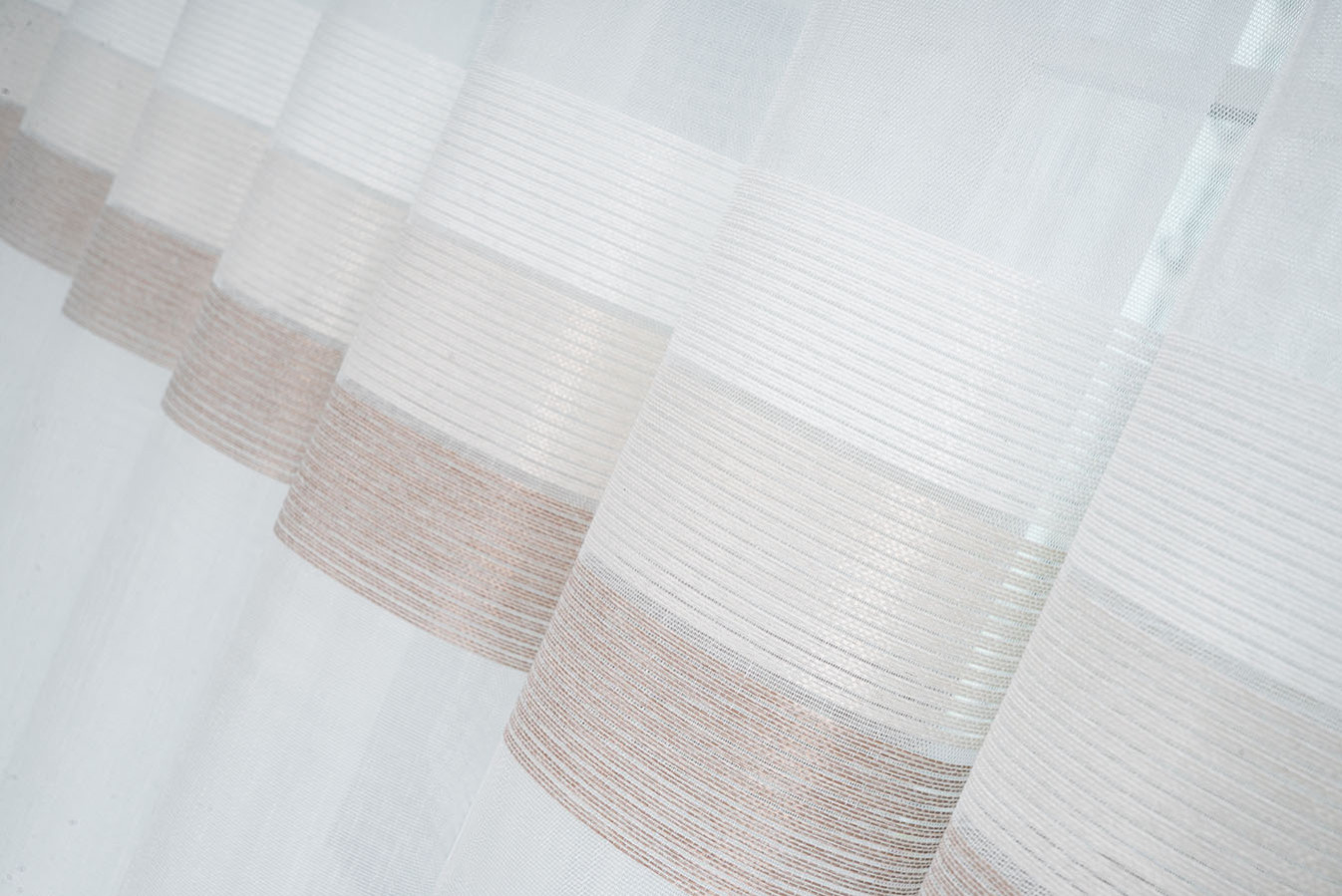 Тюль бамбук турецького виробництва зі смужками — це легка, напівпрозора гардина із двома рядами щільних смуг, розташованих по нижній частині полотна. Фактура тюлю бамбук імітує натуральне переплетення бамбукових волокон, поверхня тканини має матовий відлив. Такий тюль виглядає легким і повітряним, забезпечує м'яке розсіювання світла та надає приміщенню затишку та природної гармонії. Обтяжувач по низу полотна забезпечує об'ємну і стійку форму драпіруванням. Лаконічний дизайн гардини ідеально підходить для екостилю, мінімалізму та класичних інтер'єрів.
