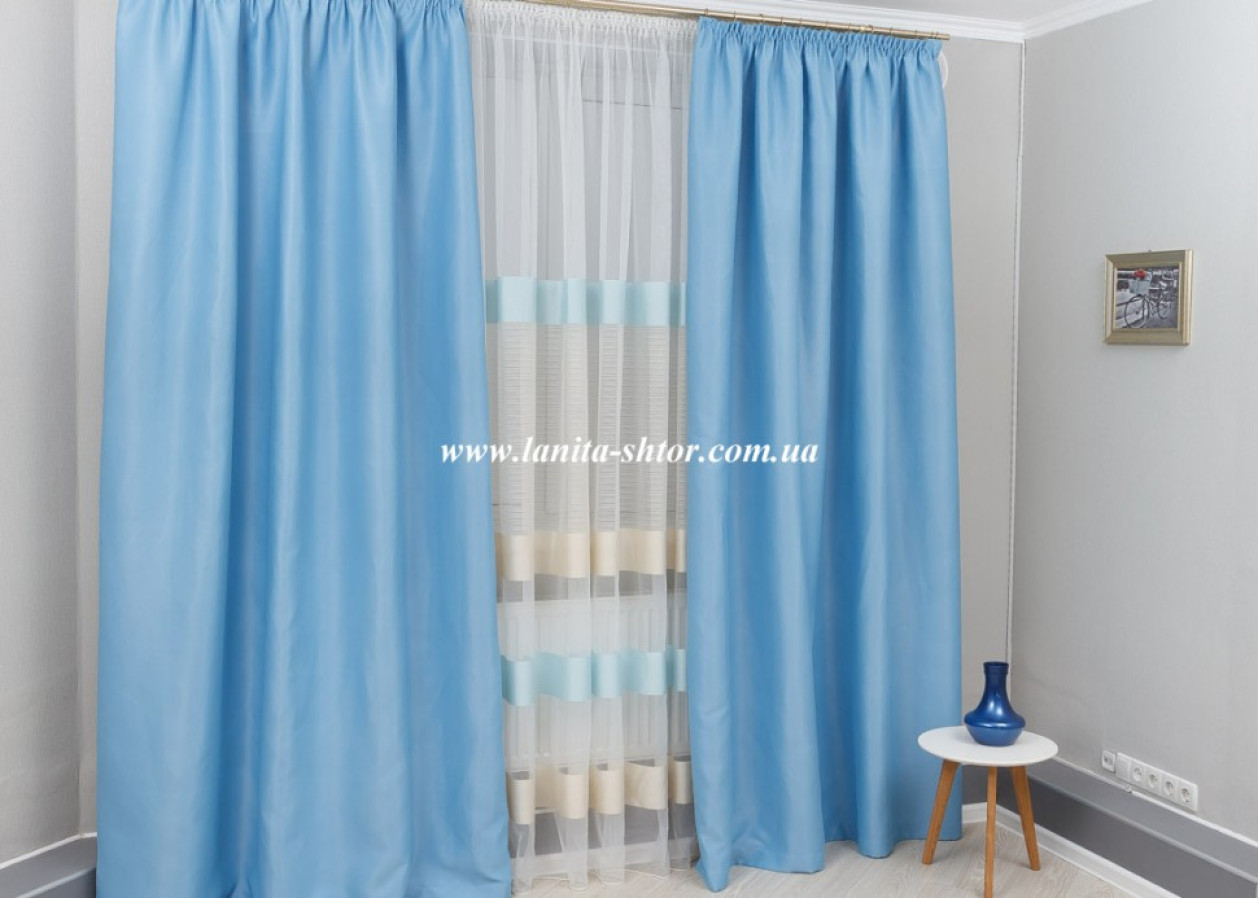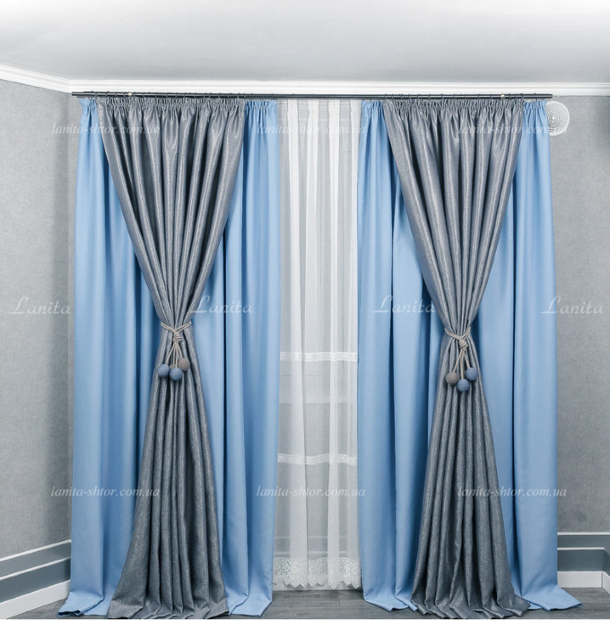 Однотонний матовий блекаут в двосторонньому виконанні пастельного блакитного кольору. Це полегшений варіант блекаута, який характеризується такою ж здатністю до світлозахисту як і традиційні аналоги, але більш м'який і гнучкий в драпіруваннях. За структурою - це щільний і шаруватий матеріал, з включенням внутрішнього шару плетіння чорних ниток, який і надає тканині хороші світлопоглинальні властивості. Портьєри цієї серії виглядають дуже елегантно і стильно, а складки виходять рівними, акуратними і глибокими.