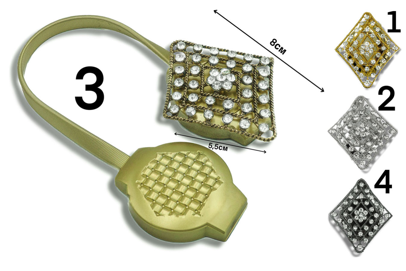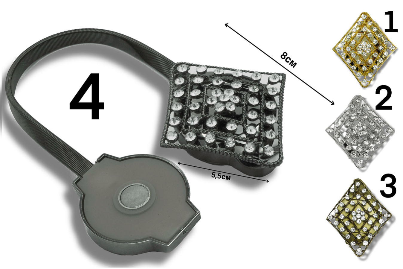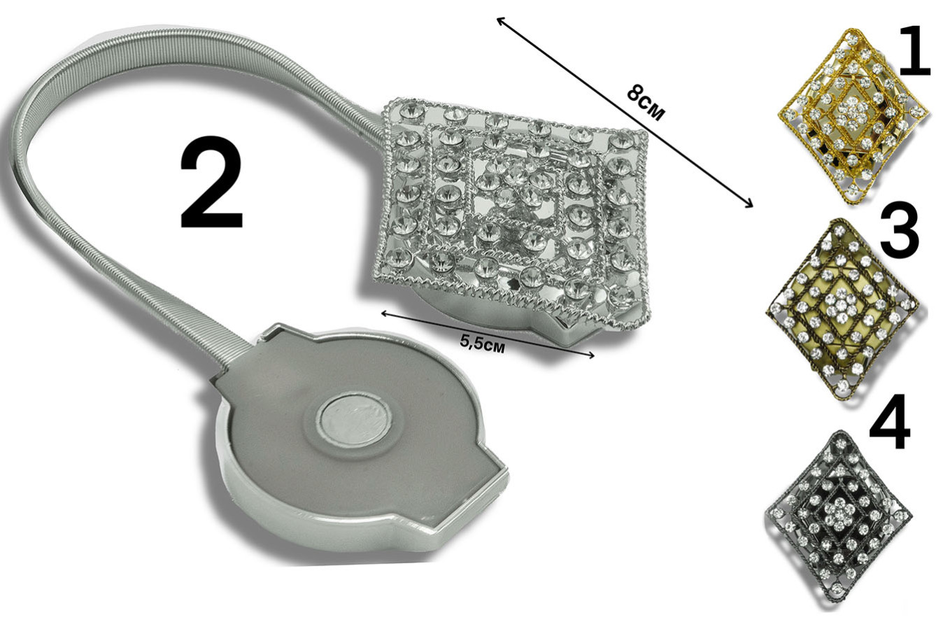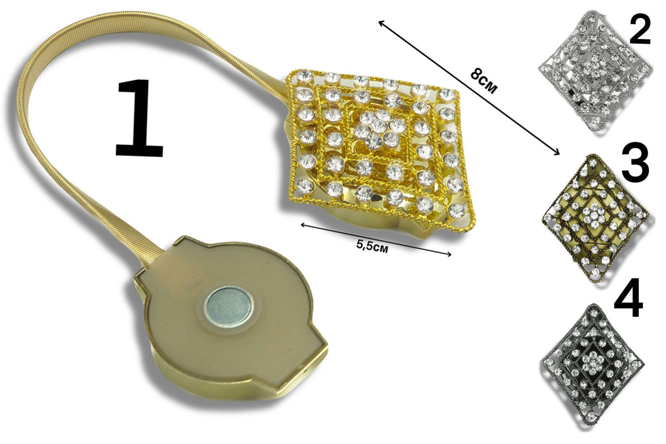 Магніти для штор у формі брошки ромбовидної форми. Цей витончений аксесуар поєднує надійність, практичність та надзвичайну красу декоративної складової. Мерехтіння білого каміння вигідно відтінюється кольорами металевої основи. А благородний блиск оправи надає виробу особливо багатого та респектабельного вигляду. Просто закріпіть драпірування штор за допомогою такого магніту та насолоджуйтесь стильним та красивим видовищем))