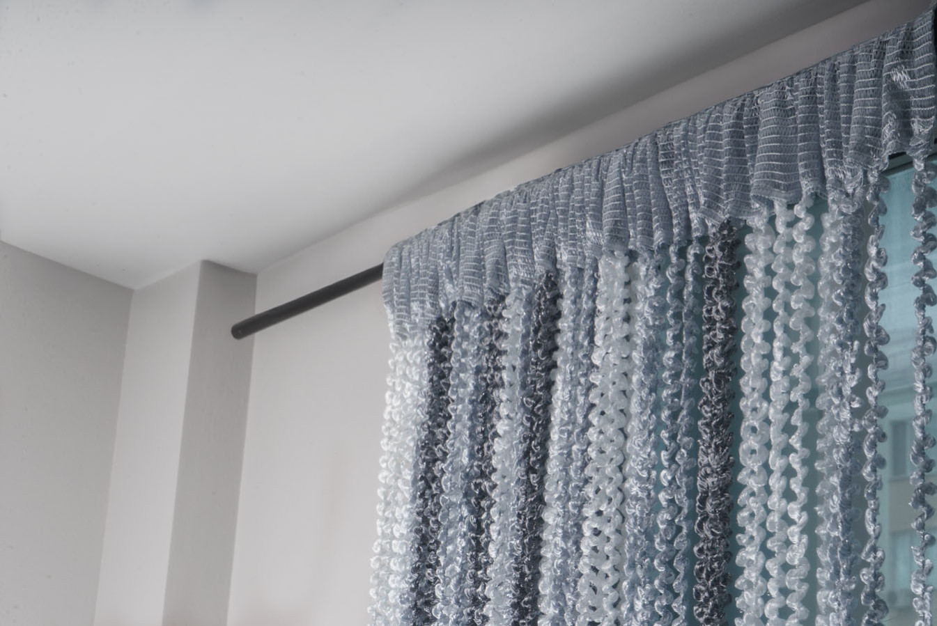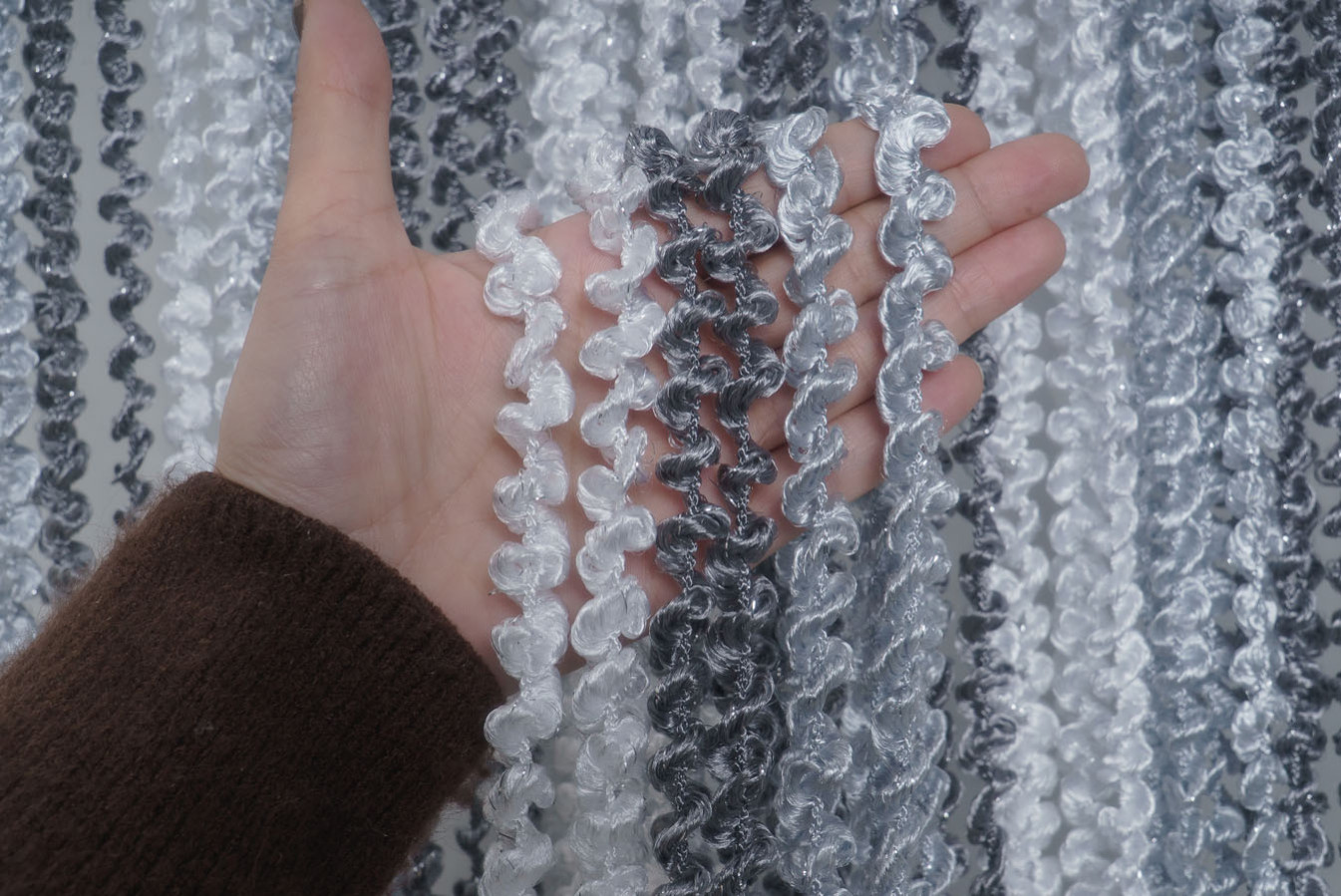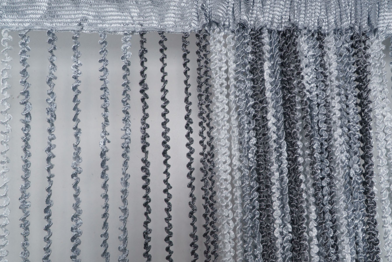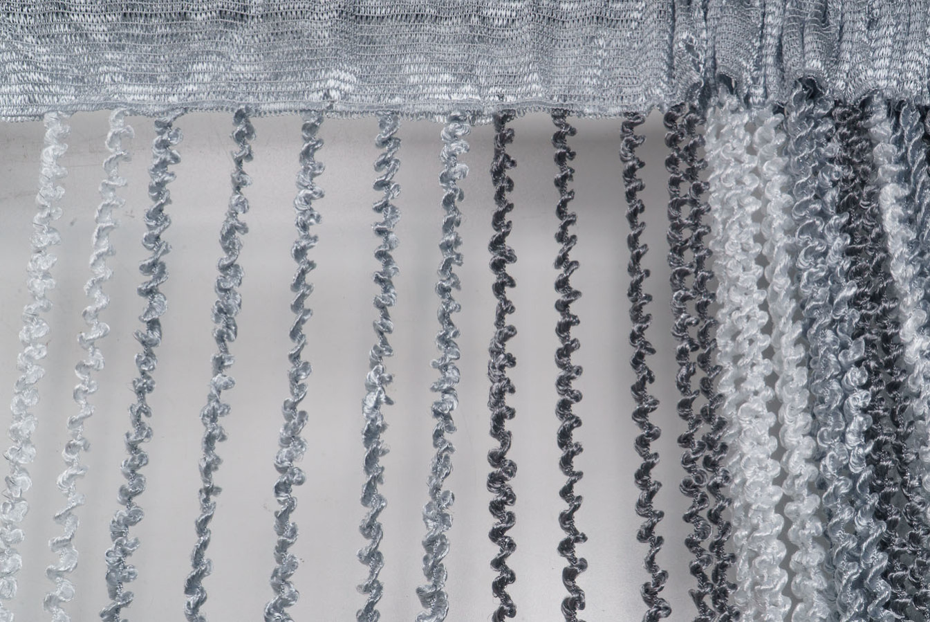 Штори-нитки спіраль — це декоративна штора з ниток, що прикрашена витонченим спіральним плетінням, що додає інтер'єру особливого шарму. Вона чудово пропускає світло, створюючи м'яке розсіювання, і водночас виконує декоративну функцію, зонуючи простір чи прикрашаючи вікно, дверний проріз або стіну. У фігурне плетіння ниток включений сріблястий люрекс, що надає кисеї ніжне мерехтіння. А об'ємна та пухнаста структура ниток робить штори схожими на фантастичну, легку хмару.