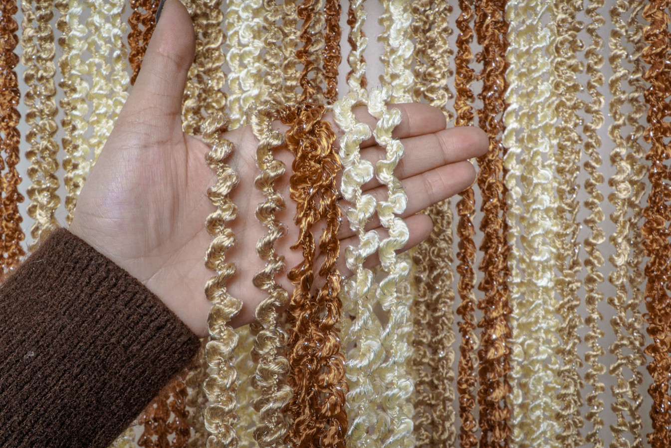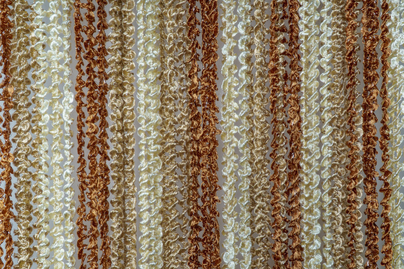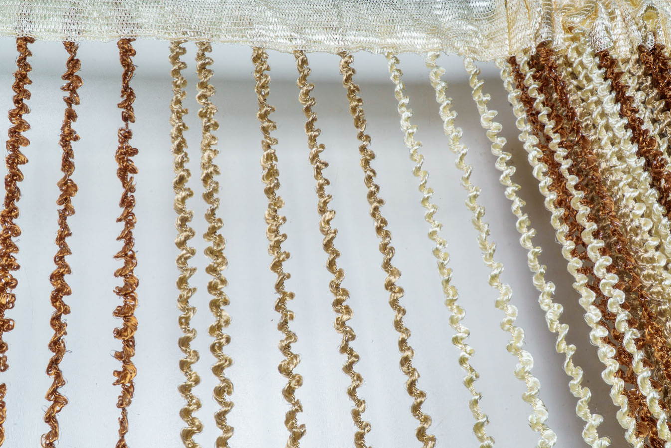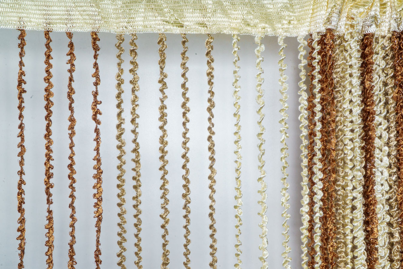 Штори-нитки спіраль — це декоративна штора з ниток, що прикрашена витонченим спіральним плетінням, що додає інтер'єру особливого шарму. Вона чудово пропускає світло, створюючи м'яке розсіювання, і водночас виконує декоративну функцію, зонуючи простір чи прикрашаючи вікно, дверний проріз або стіну. У фігурне плетіння ниток включений сріблястий люрекс, що надає кисеї ніжне мерехтіння. А об'ємна та пухнаста структура ниток робить штори схожими на фантастичну, легку хмару.