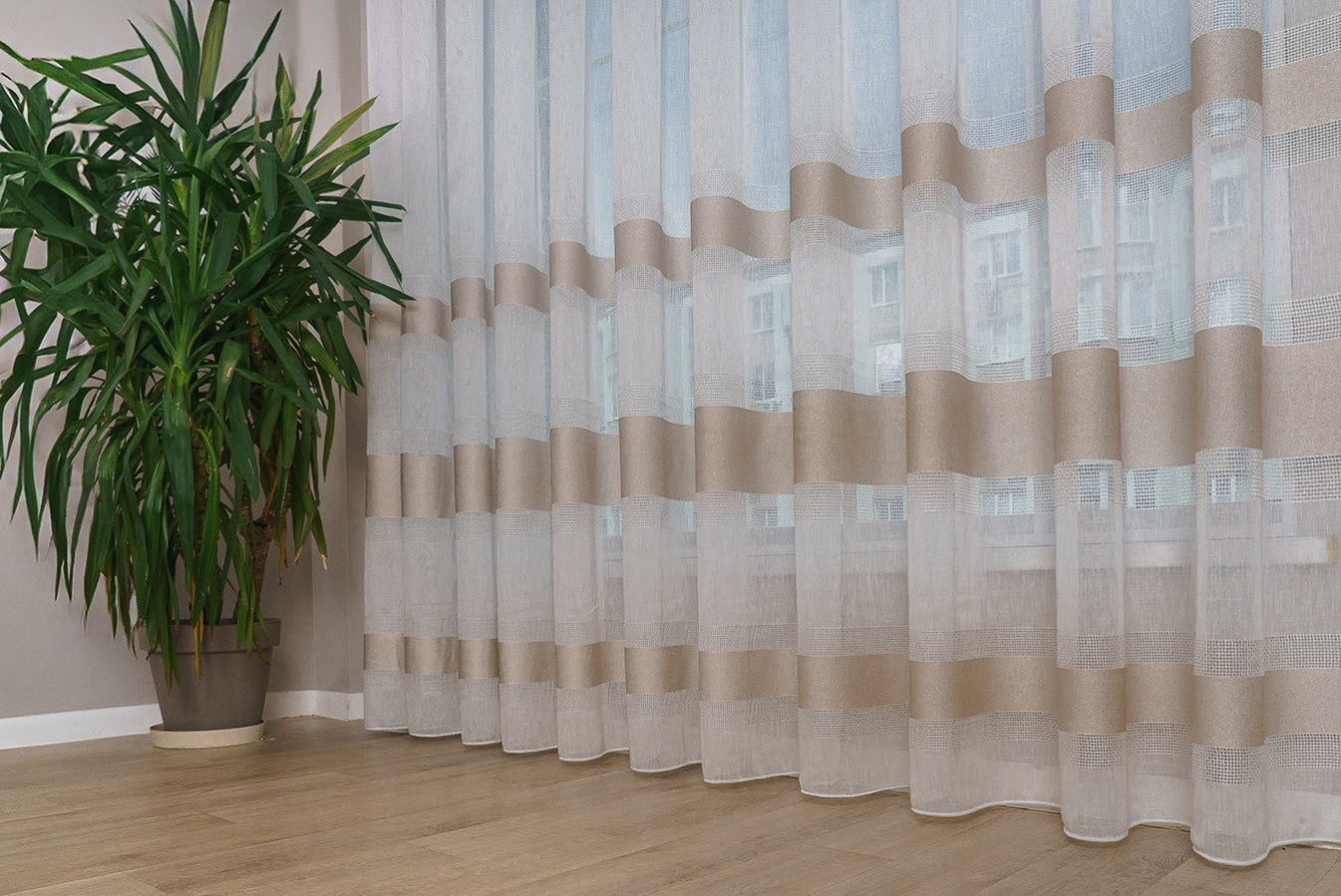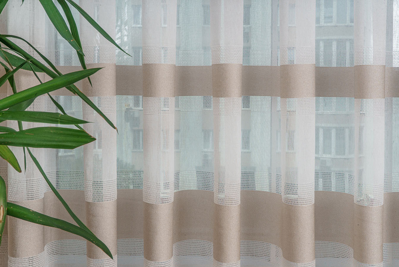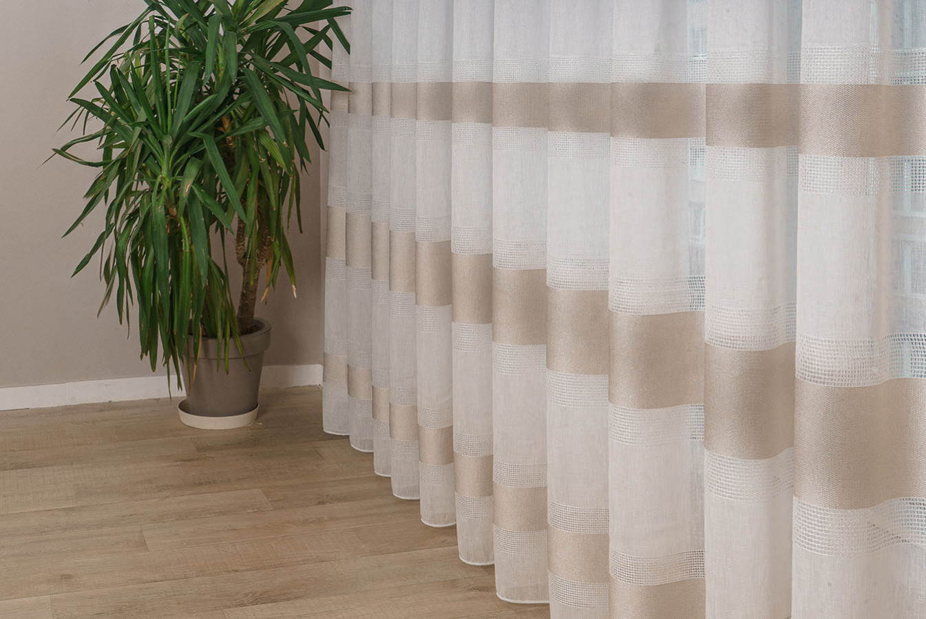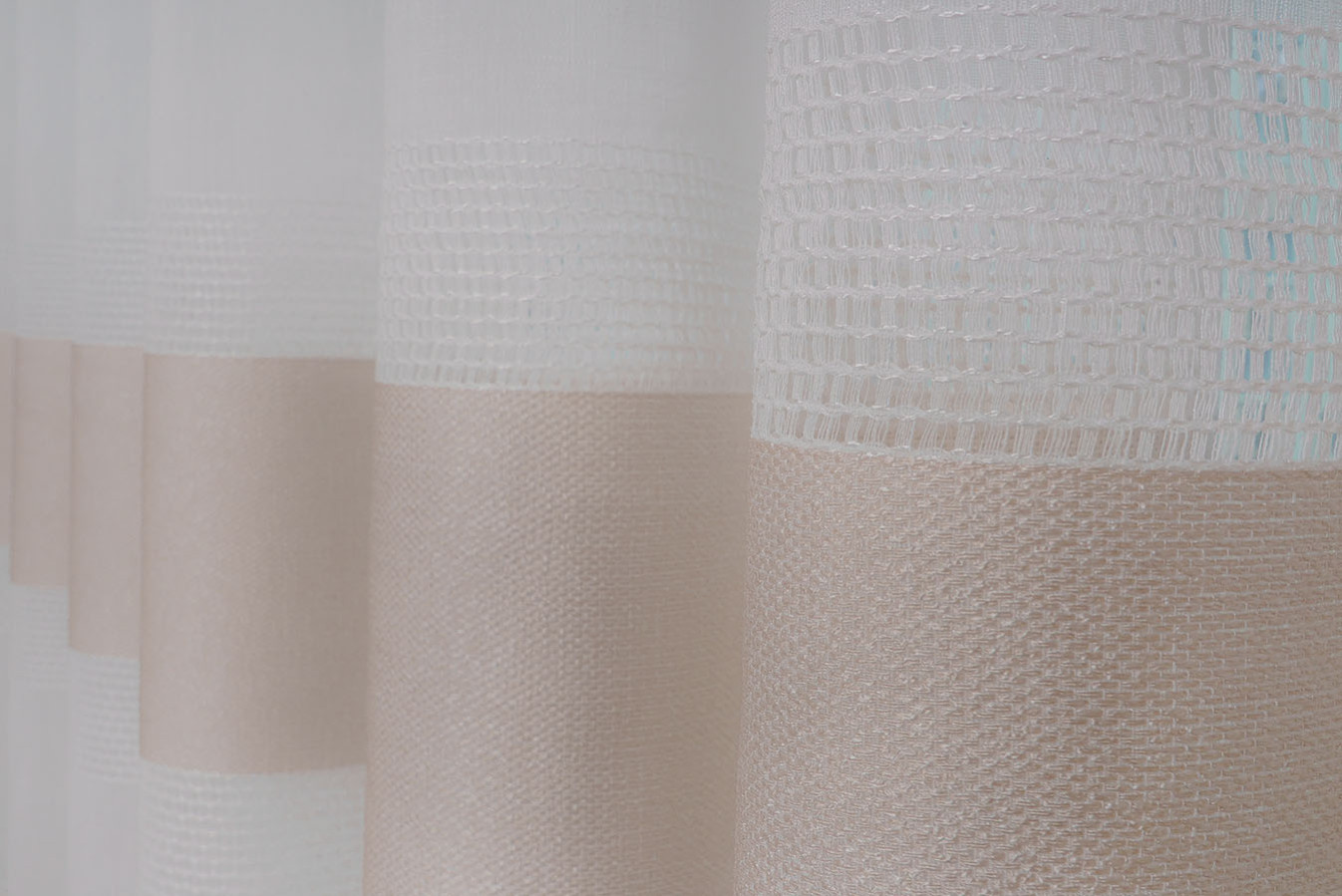 Тюль льон зі смужками по низу полотна в біло-бежевому забарвленні. Тканина має матову поверхню і виразну структуру полотняного плетіння ниток. Сітчасті вставки з боків кольорових смужок, ефектно доповнюють декор і прикрашають гардину. Це легкий і повітряний матеріал для стильного і ультрамодного оформлення вікон. А його напівжорстка структура дозволяє створювати формостійкі драпірування.