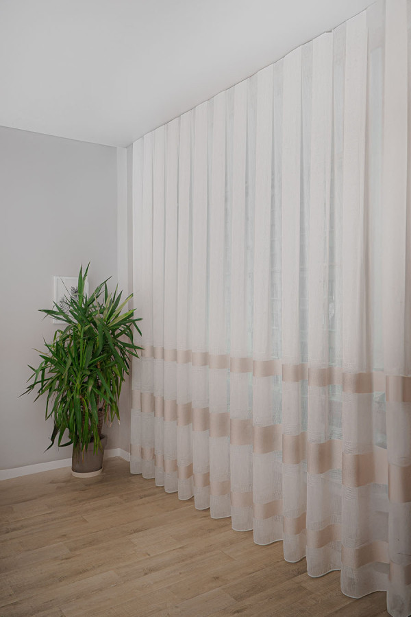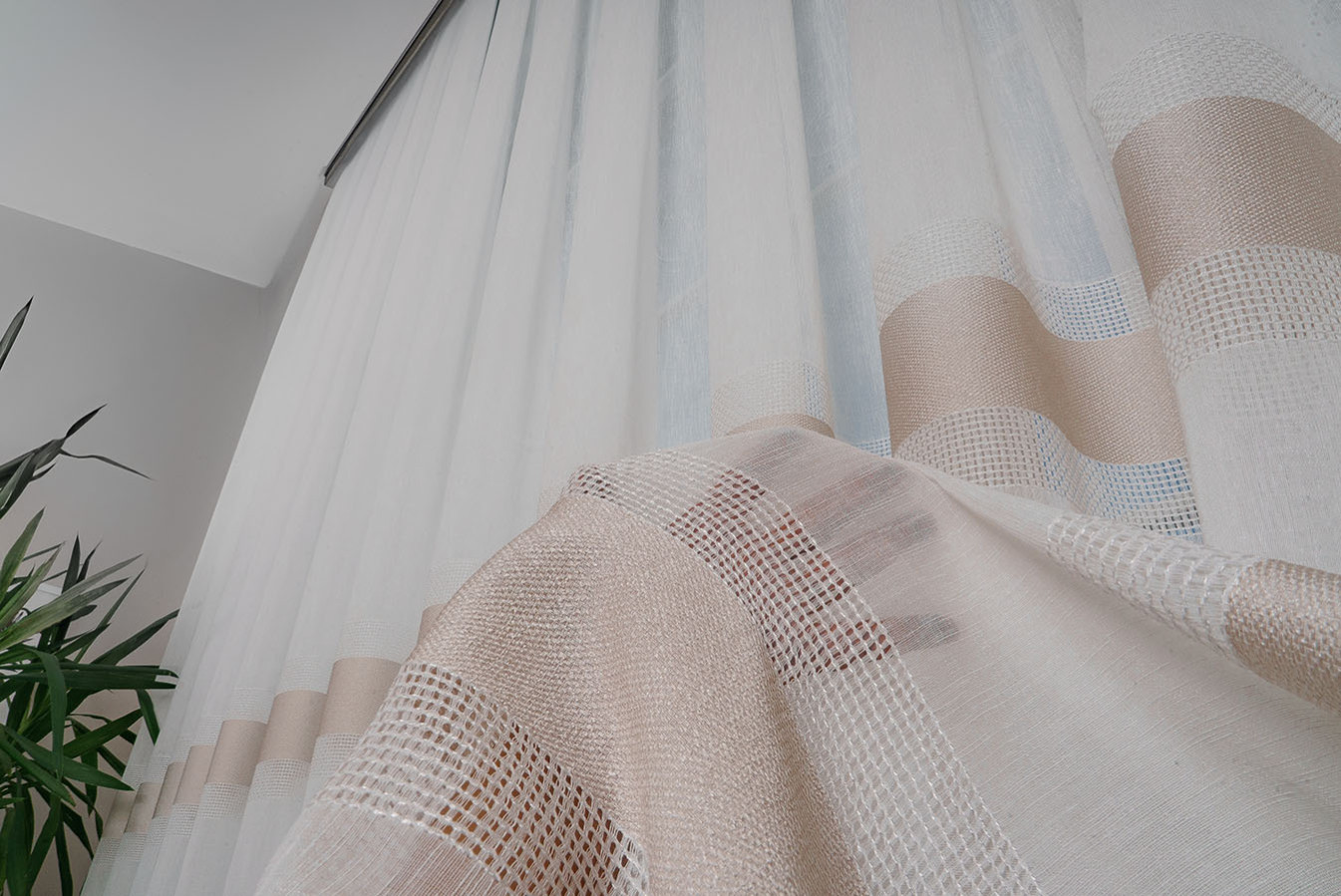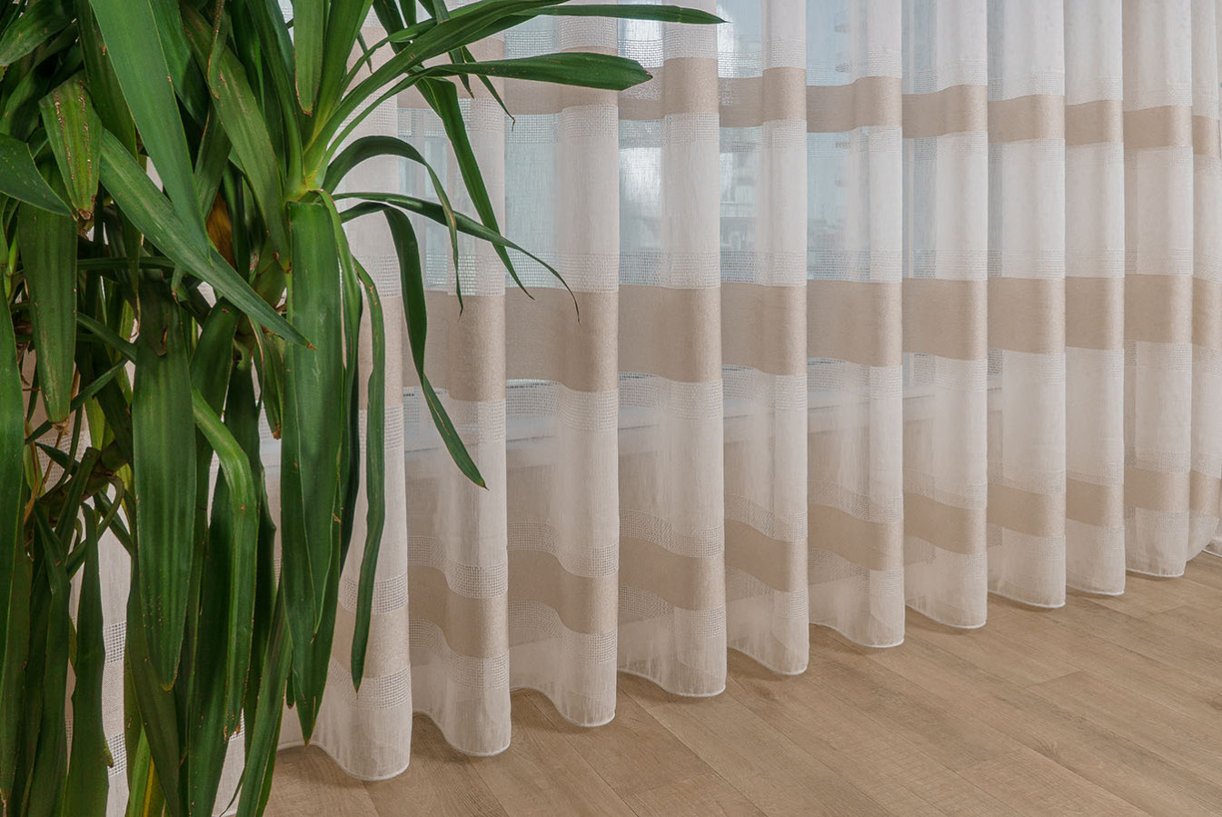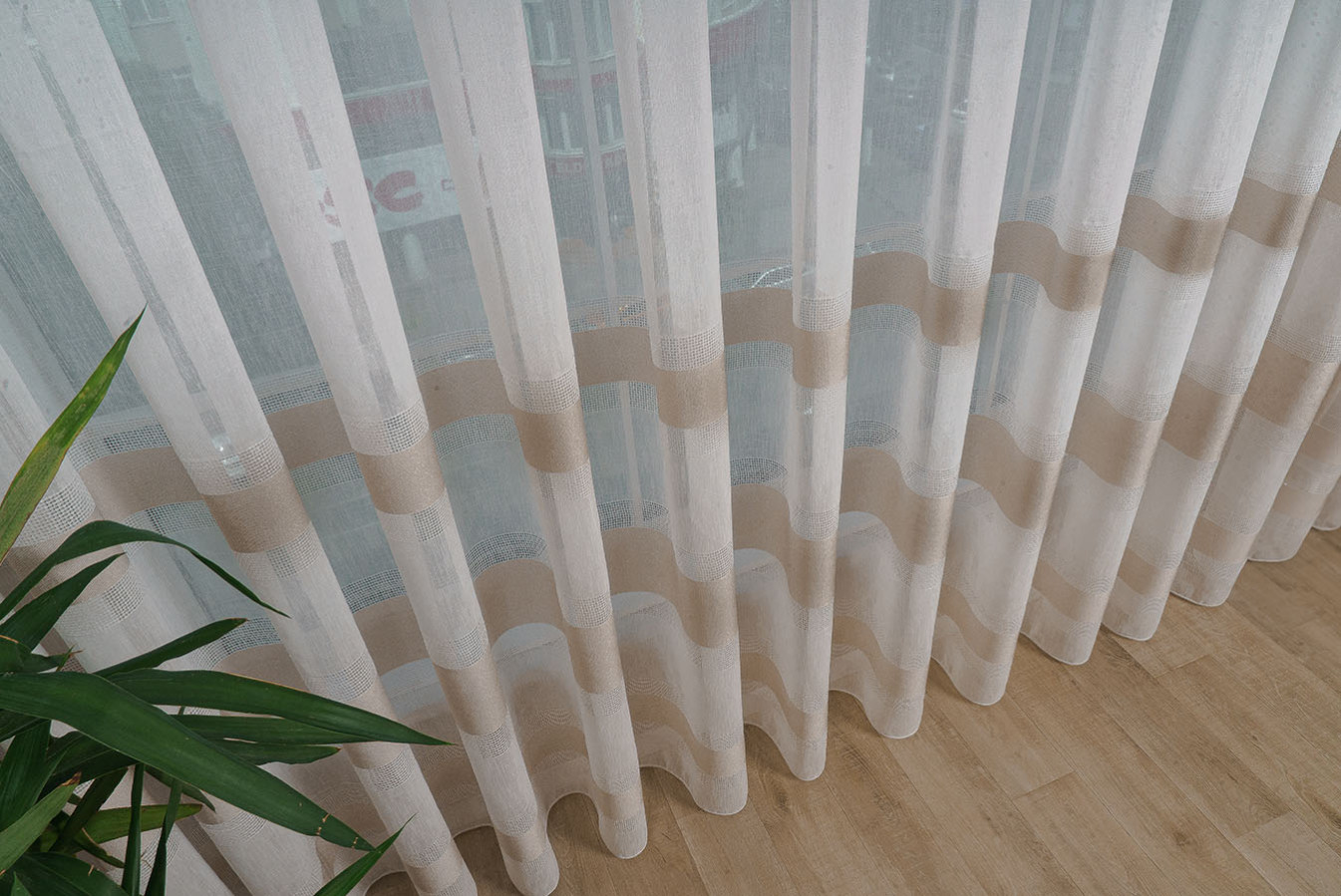 Тюль льон зі смужками по низу полотна в біло-бежевому забарвленні. Тканина має матову поверхню і виразну структуру полотняного плетіння ниток. Сітчасті вставки з боків кольорових смужок, ефектно доповнюють декор і прикрашають гардину. Це легкий і повітряний матеріал для стильного і ультрамодного оформлення вікон. А його напівжорстка структура дозволяє створювати формостійкі драпірування.