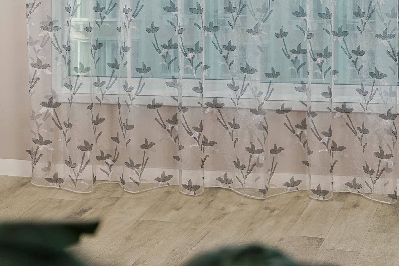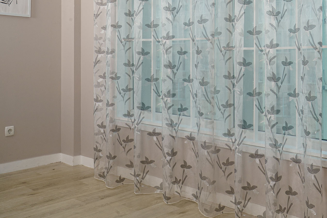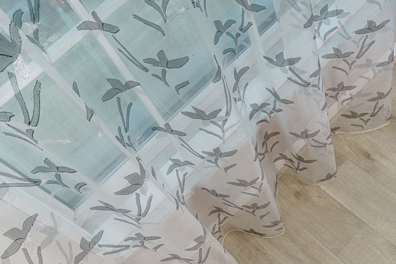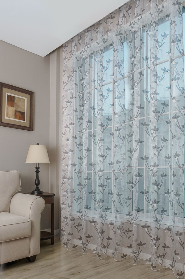 Тюль органза з густим листяним візерунком в сіро-сріблястому забарвленні. Малюнок виконаний шляхом вплетення кольорових і срібних люрексових ниток в основу тканини. Поверхня гардини має ніжне іскристе сяйво, а елементи візерунка виглядають виразно на легкому прозорому фоні. Це гарний і доступний за ціною варіант, для повітряного і живописного оформлення вікон.