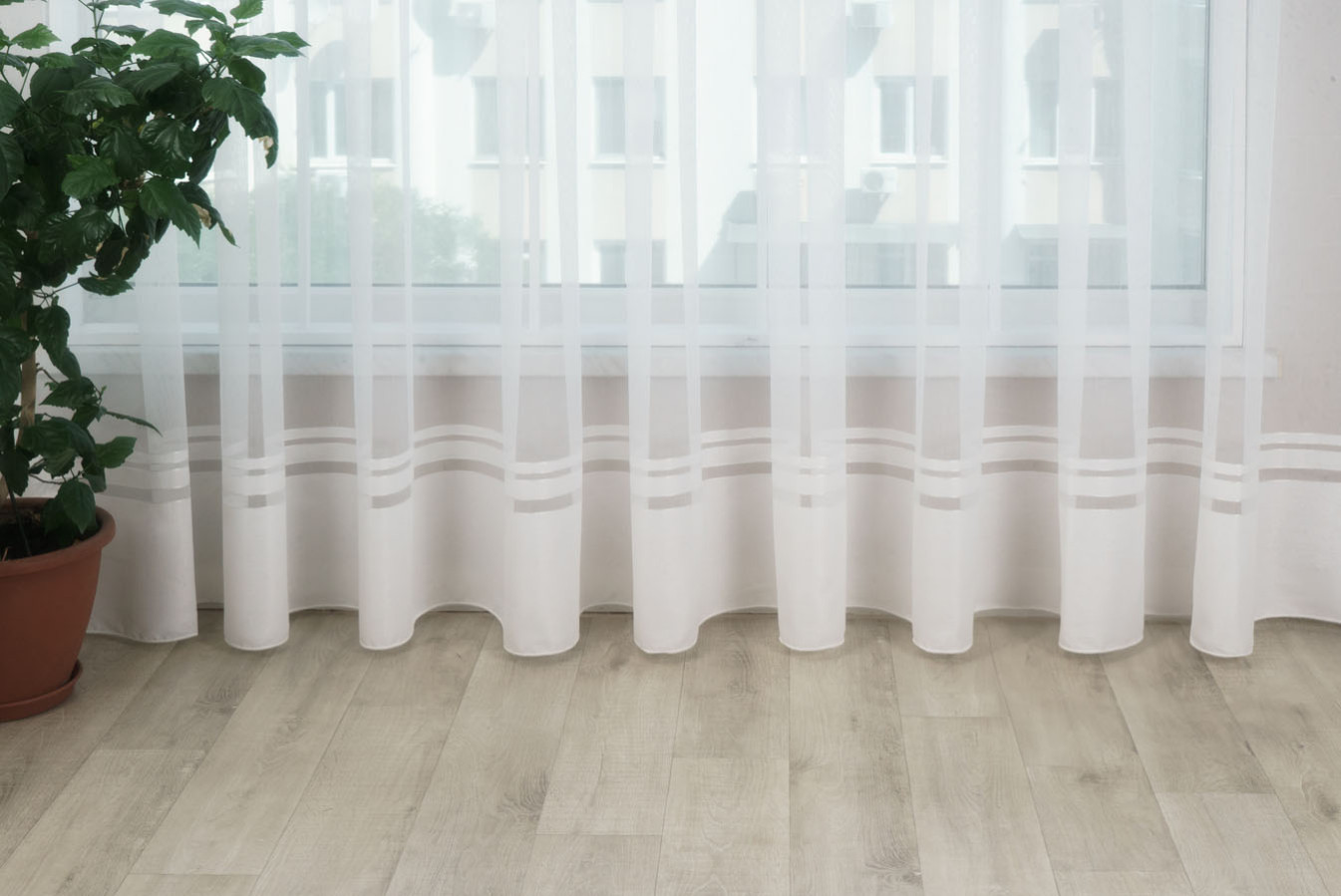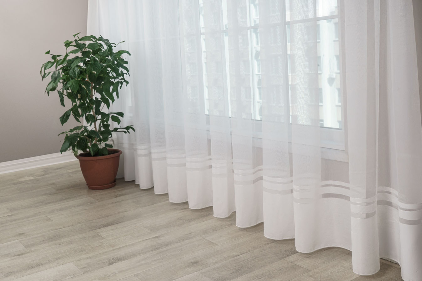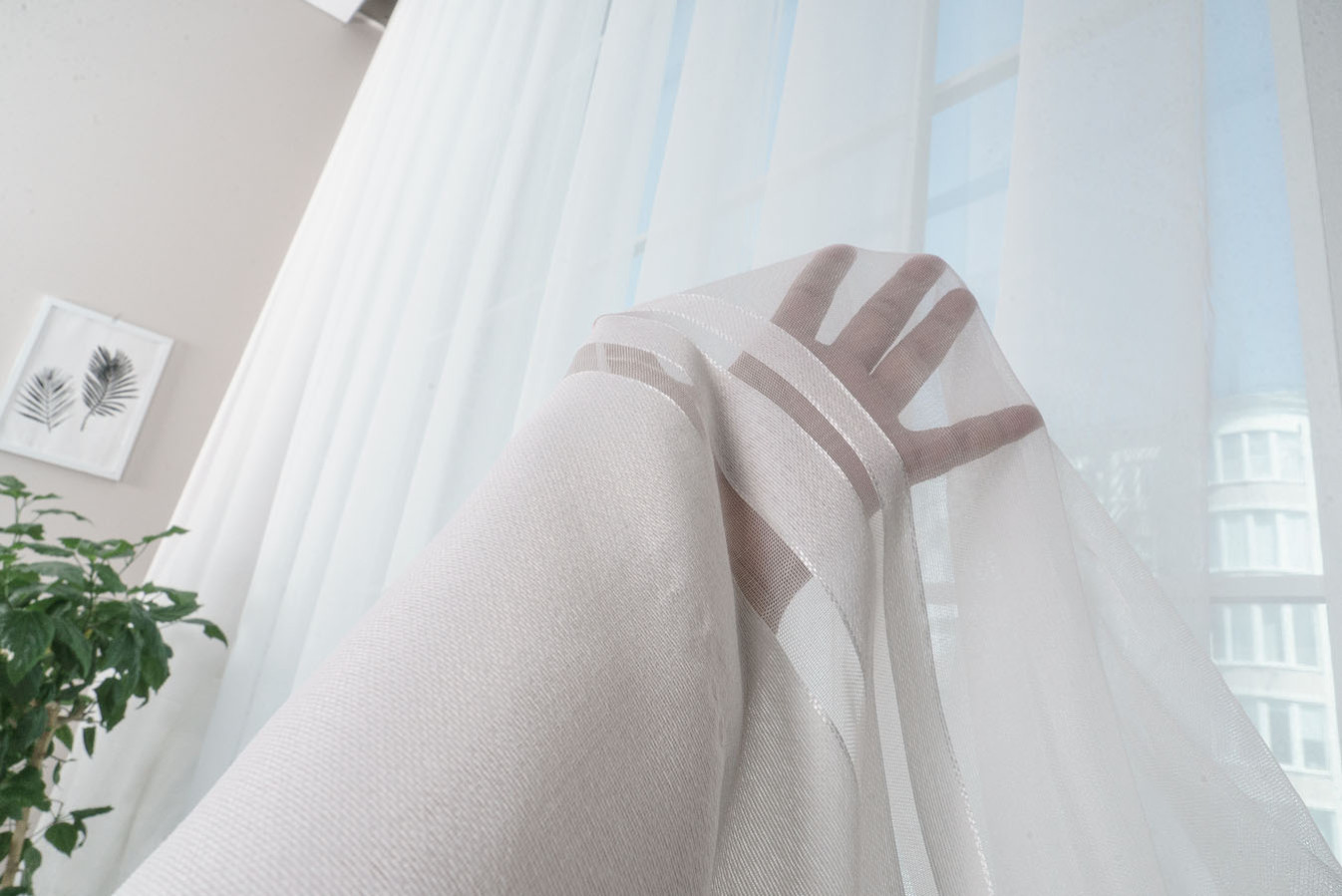 Легкий тюль бамбук з горизонтальними смужками знизу поєднує в собі ніжність і сучасний стиль. Напівпрозора тканина з виразною фактурою «бамбук» створює відчуття повітряності та природної свіжості. Завершений акцент у вигляді горизонтальних смужок внизу полотна додає інтер’єру структури й елегантності.