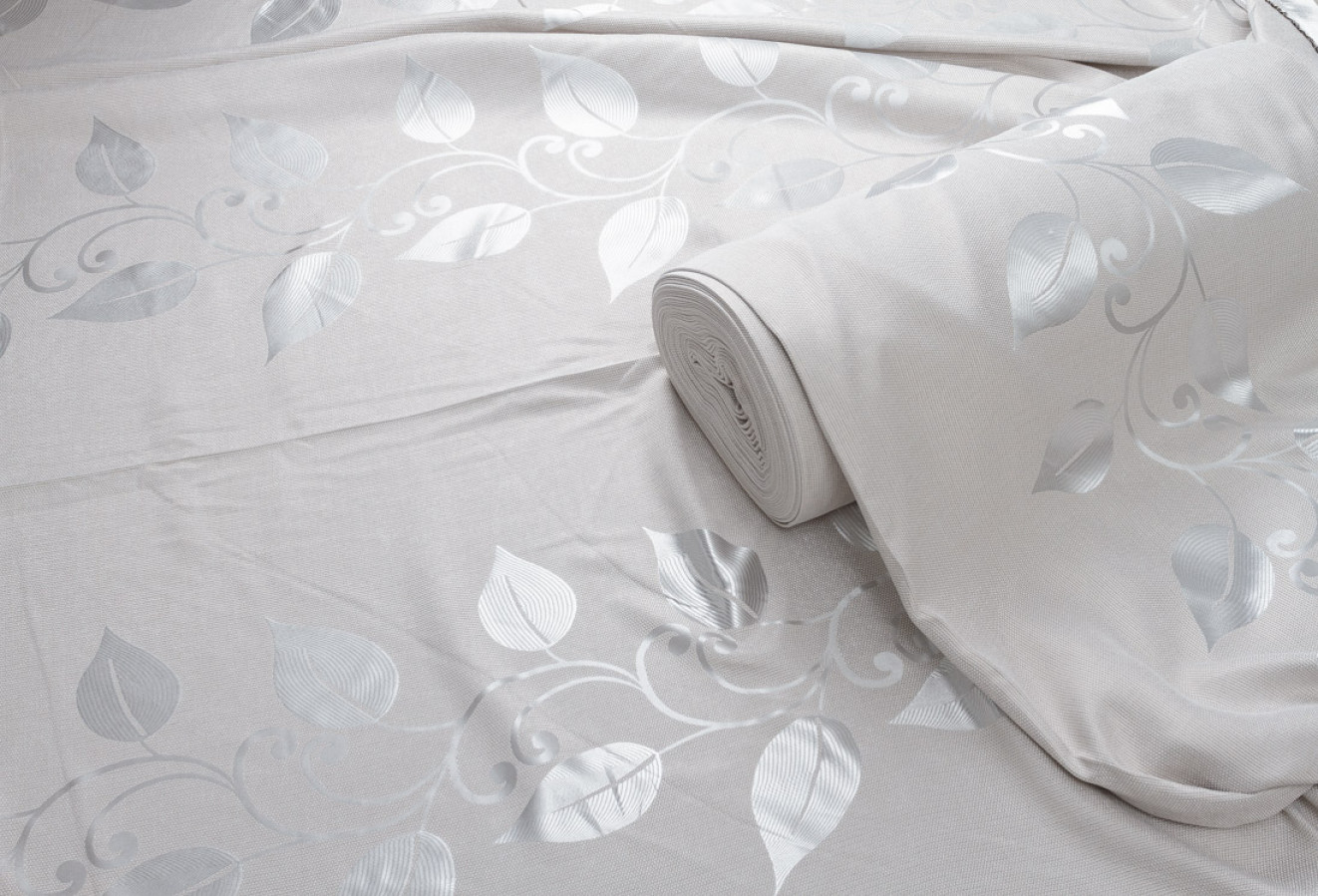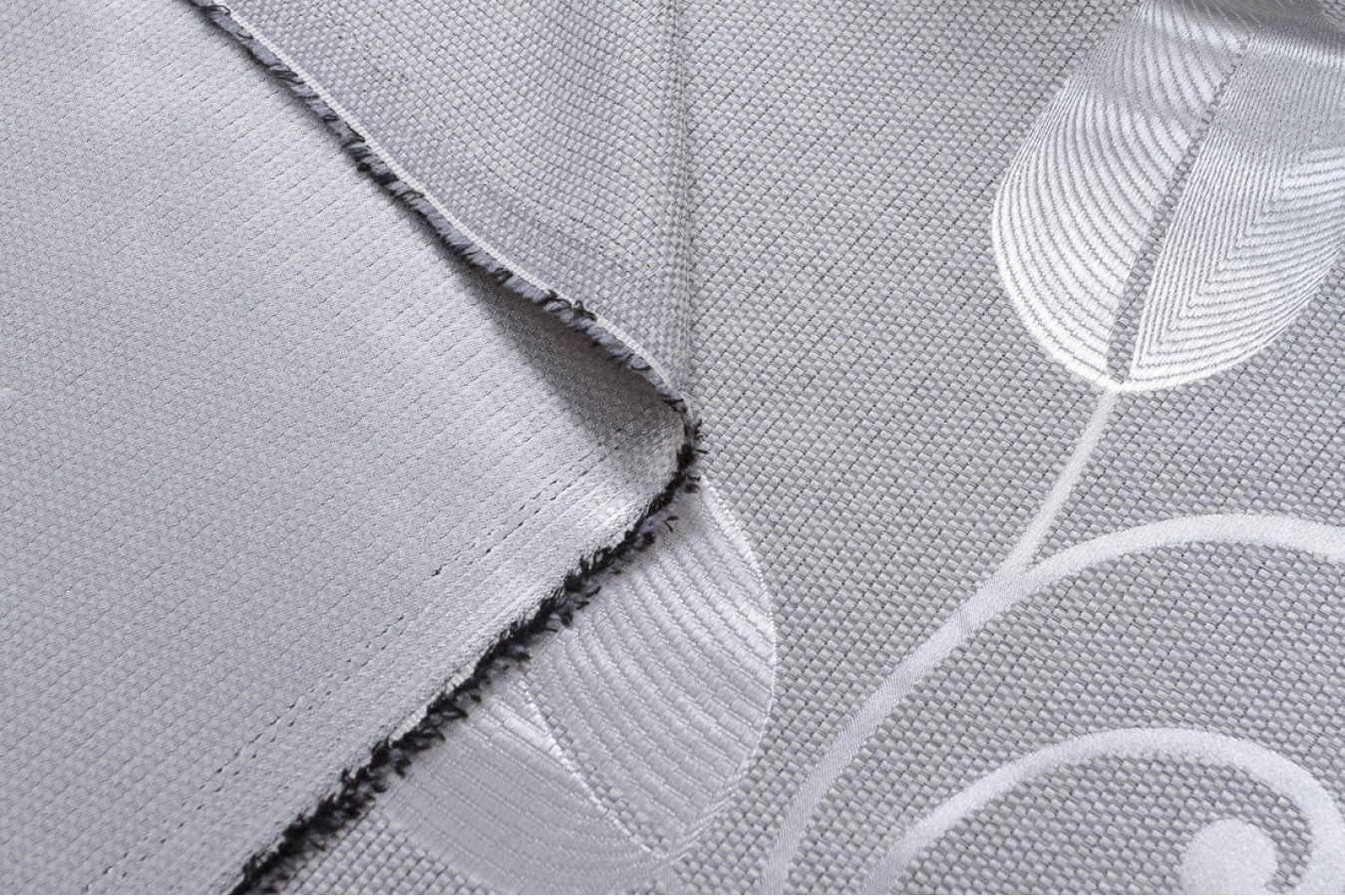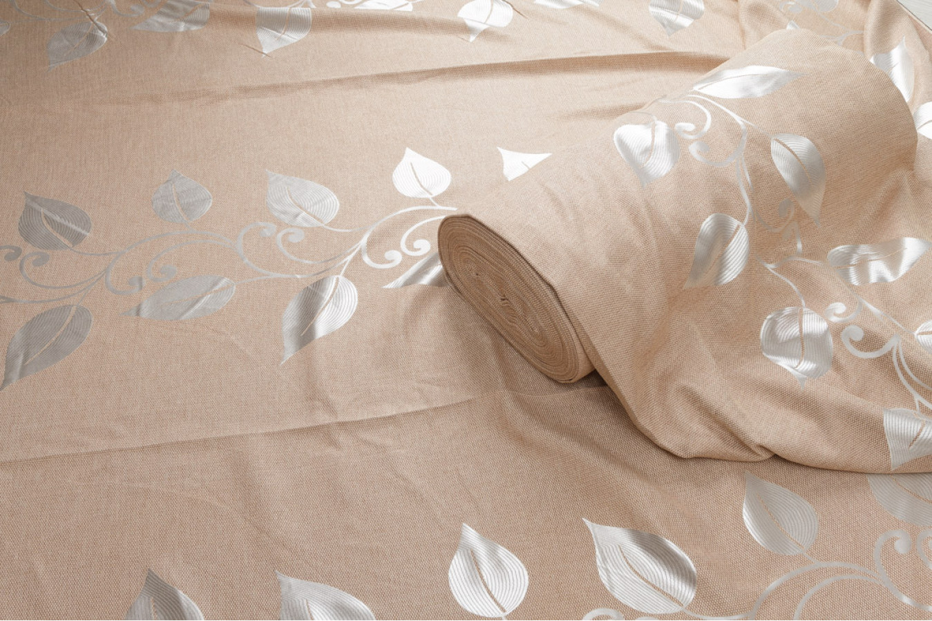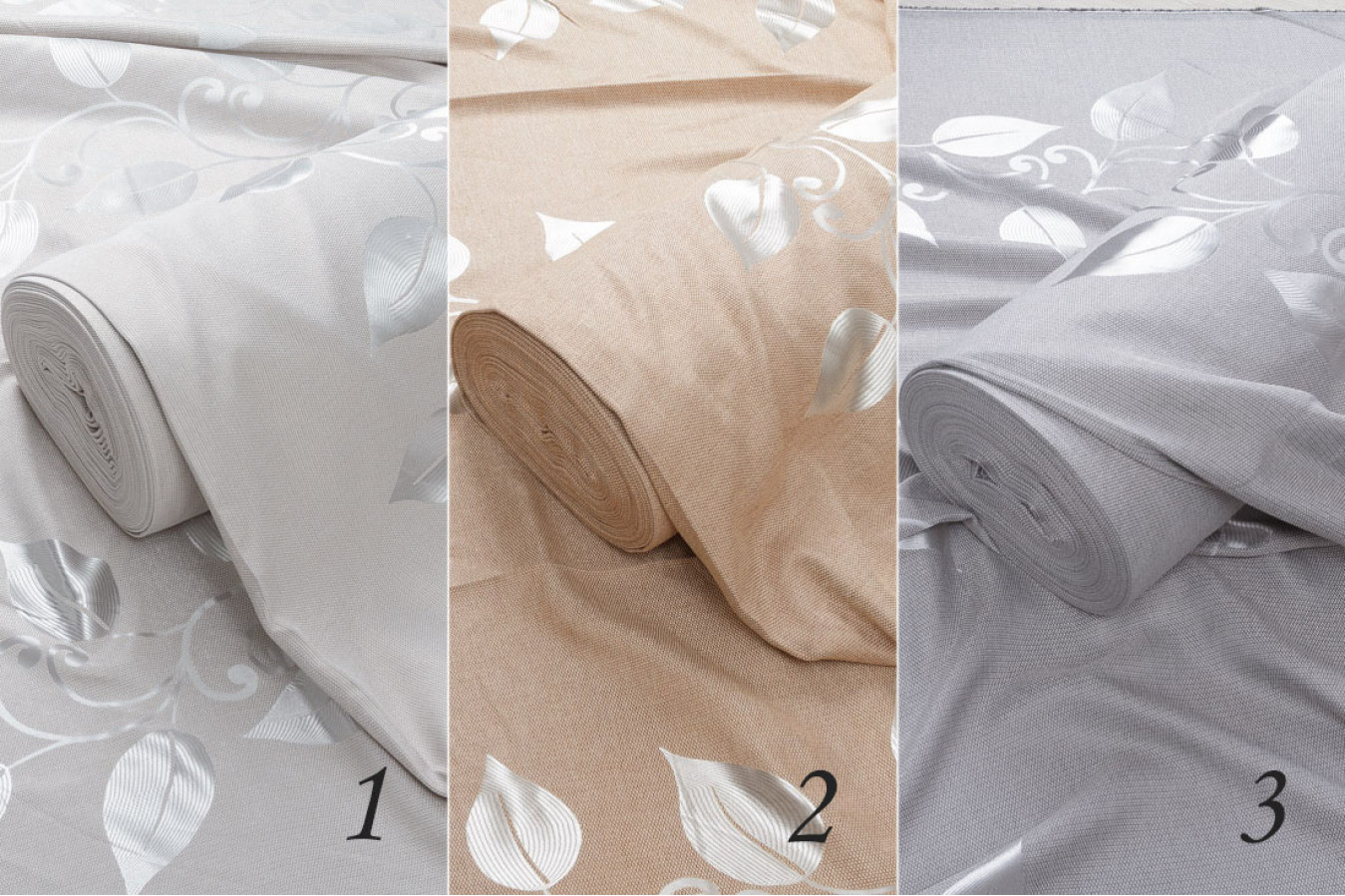 Штори блекаут двосторонні прикрашені крупним, горизонтально розташованим листяним орнаментом. Одна зі сторін блекауту має фактурну матову поверхню з виразним полотняним переплетенням волокон на кшталт рогожки. Візерунок виконаний завдяки вплетенню блискучих шовковистих ниток в основу. Інша сторона тканини має гладкий, ніжно сяючий фон і матовий візерунок. Штори виглядають дуже ефектно і виразно, до того ж завдяки своїй щільності і шаруватій структурі добре захищають від сонця.