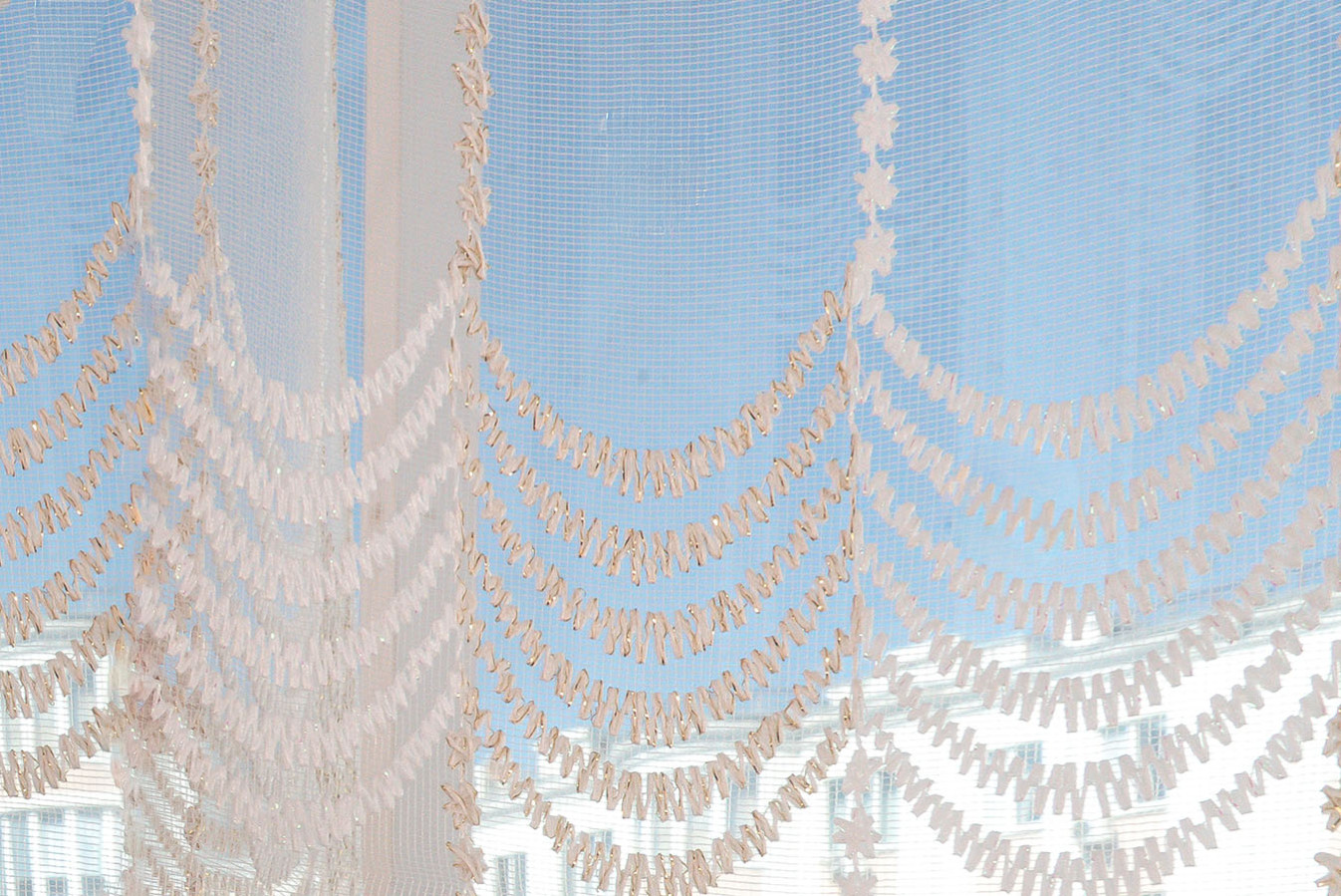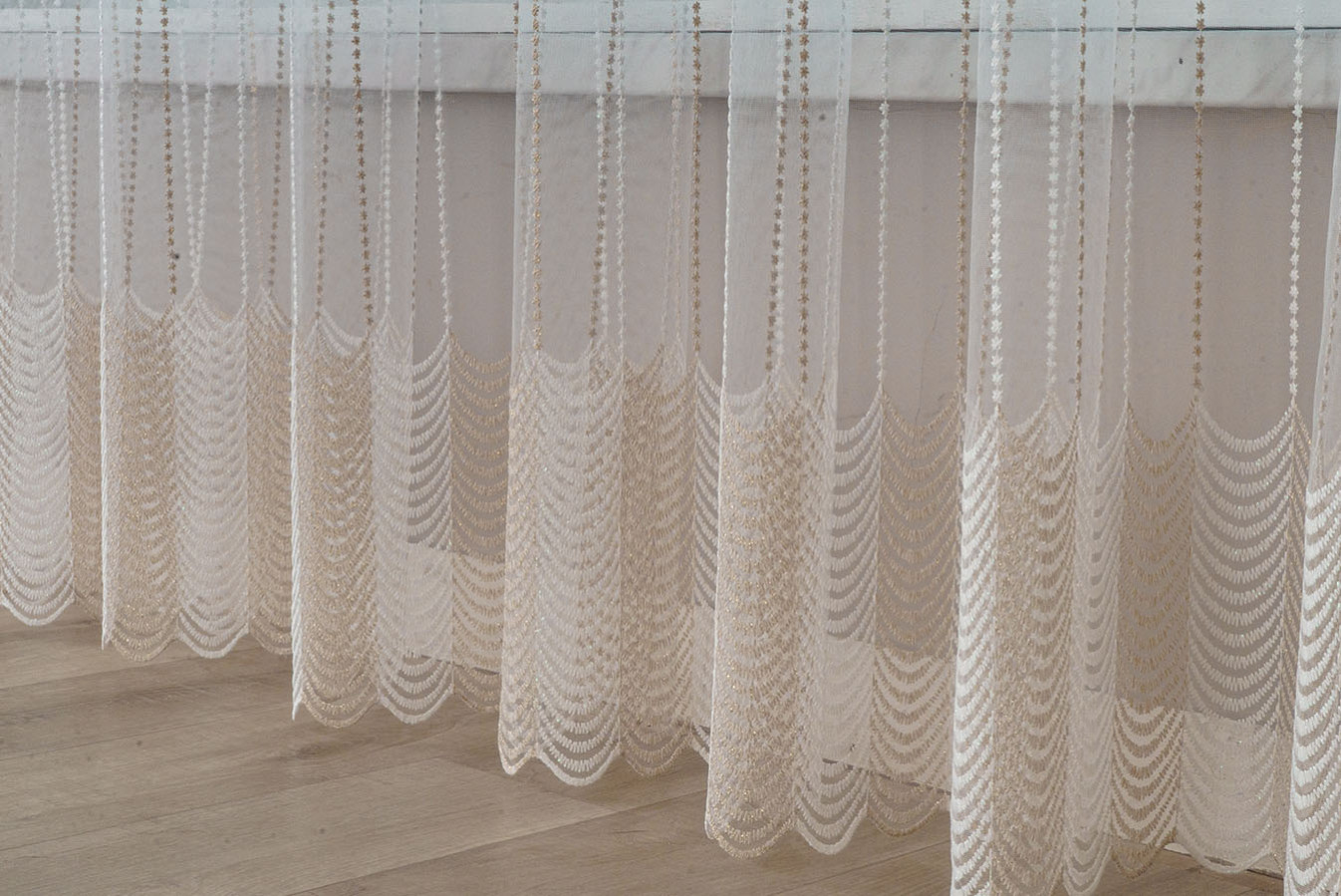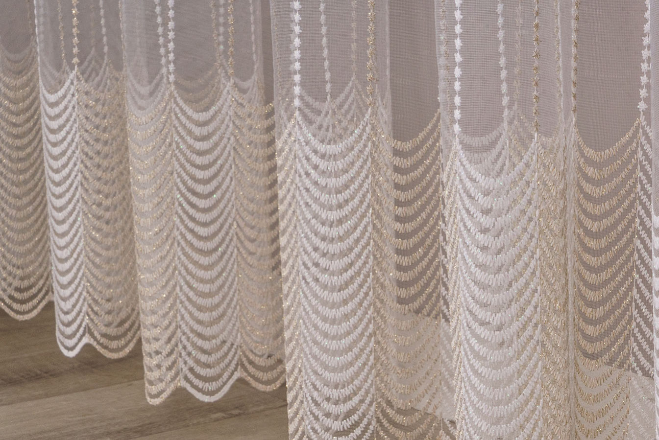 Розкішний турецький тюль на основі фатину прикрашений вишуканою вишивкою та ніжним блиском люрексу. Напівпрозора тканина створює легку та повітряну атмосферу, пропускає м’яке світло й надає інтер’єру витонченості. Вишивка з геометричними хвилястими лініями гармонійно поєднує класичну елегантність та сучасний стиль, а легкі блискітки люрексу додають ефекту святковості. Такий тюль стане стильним акцентом у вашому інтер’єрі та чудово поєднується як із класичними шторами, так і з сучасними гардинами.