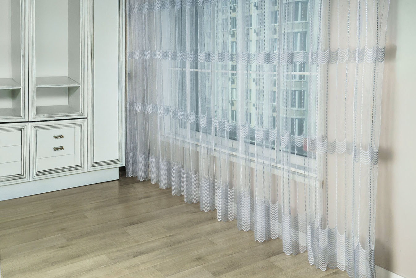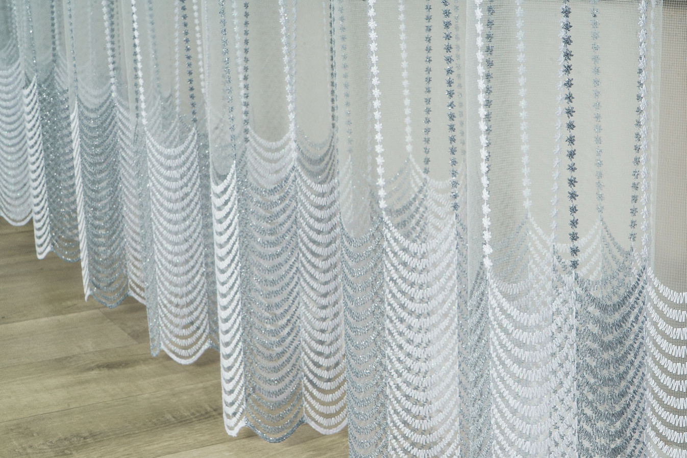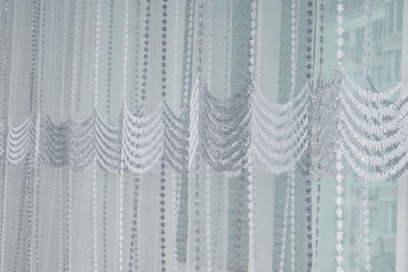 Розкішний турецький тюль на основі фатину прикрашений вишуканою вишивкою та ніжним блиском люрексу. Напівпрозора тканина створює легку та повітряну атмосферу, пропускає м’яке світло й надає інтер’єру витонченості. Вишивка з геометричними хвилястими лініями гармонійно поєднує класичну елегантність та сучасний стиль, а легкі блискітки люрексу додають ефекту святковості. Такий тюль стане стильним акцентом у вашому інтер’єрі та чудово поєднується як із класичними шторами, так і з сучасними гардинами.