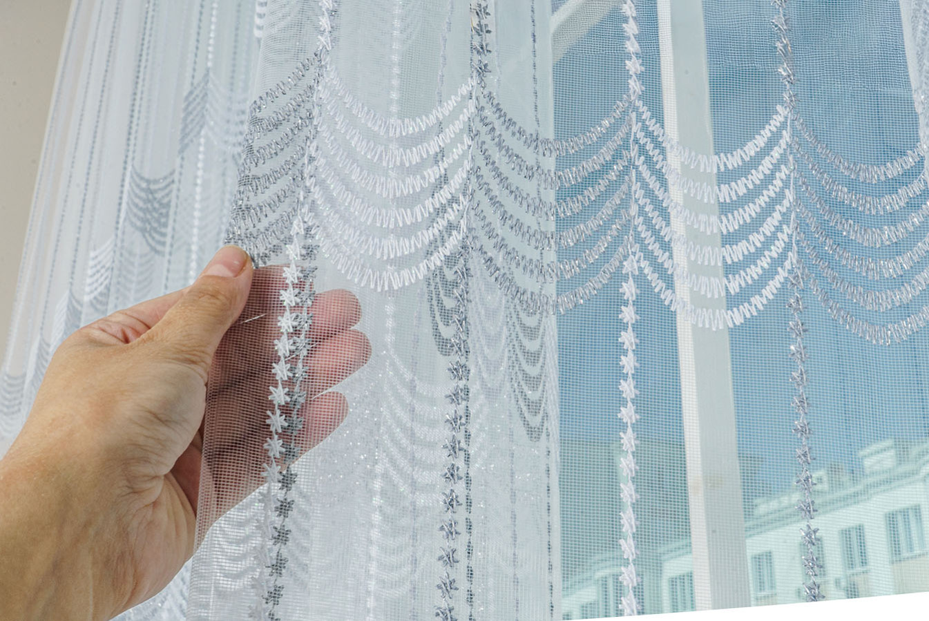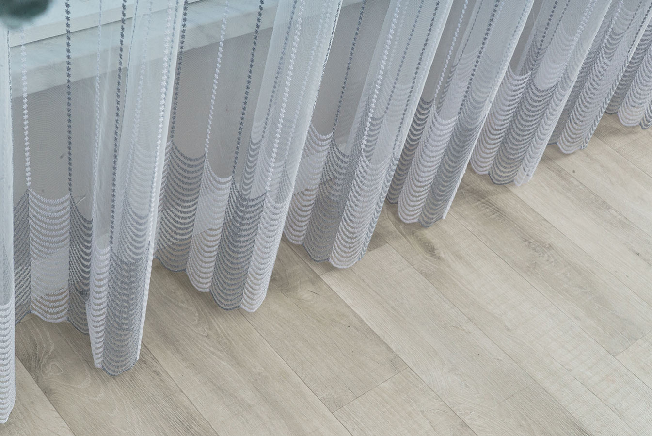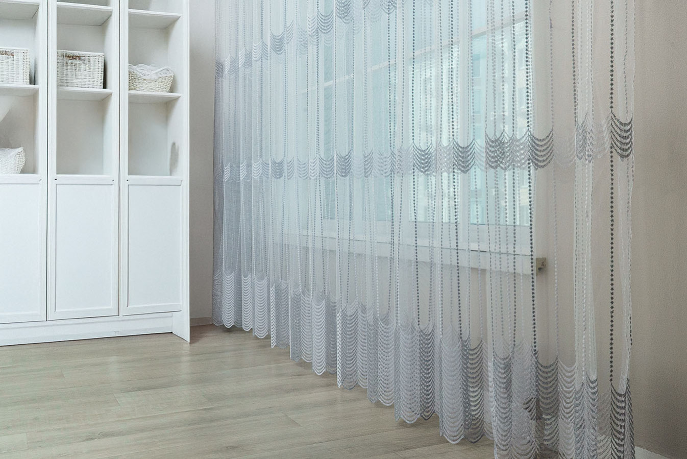 Розкішний турецький тюль на основі фатину прикрашений вишуканою вишивкою та ніжним блиском люрексу. Напівпрозора тканина створює легку та повітряну атмосферу, пропускає м’яке світло й надає інтер’єру витонченості. Вишивка з геометричними хвилястими лініями гармонійно поєднує класичну елегантність та сучасний стиль, а легкі блискітки люрексу додають ефекту святковості. Такий тюль стане стильним акцентом у вашому інтер’єрі та чудово поєднується як із класичними шторами, так і з сучасними гардинами.