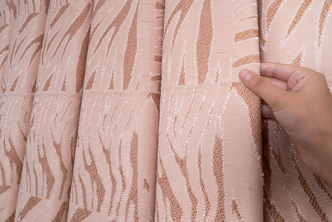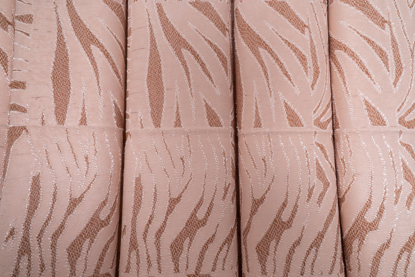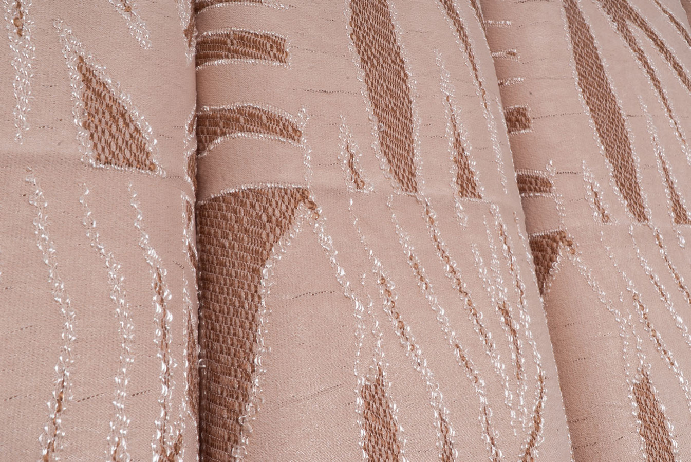 Штори прикрашені абстрактним візерунком у бежево-пудровій гамі. Тканина має виразну поверхню, створену завдяки рельєфній структурі переплетення. Штори відрізняються пластичністю і податливістю до будь-яких драпіровок, у призібраному вигляді утворюють струмуючі, вільно спадаючі складки. В інтер'єрі виглядають елегантно і привабливо, надають приміщенню затишну і комфортну атмосферу.