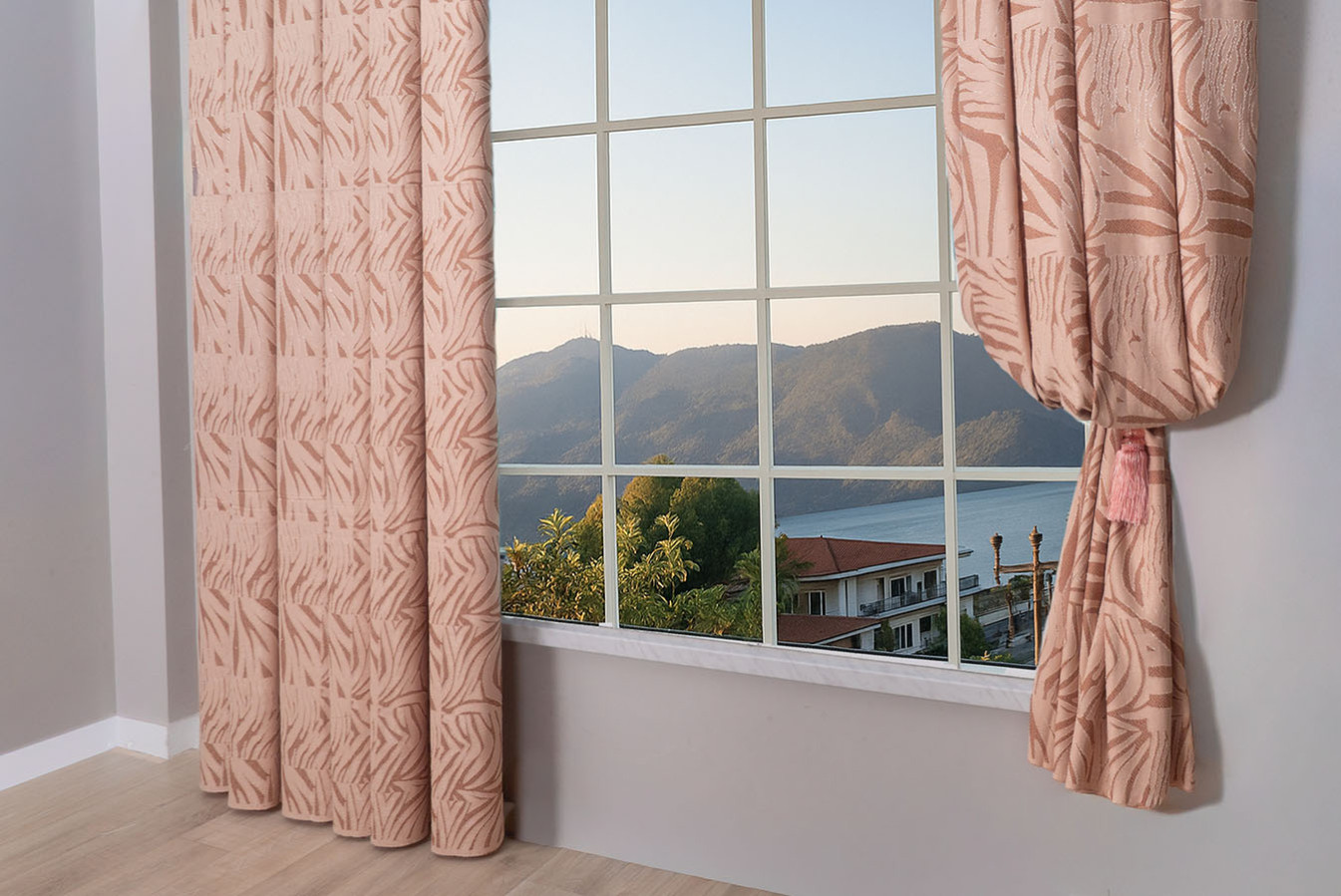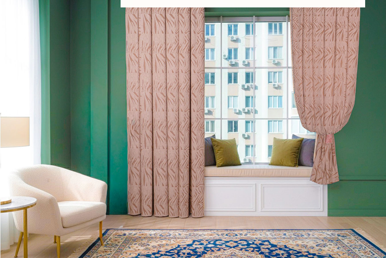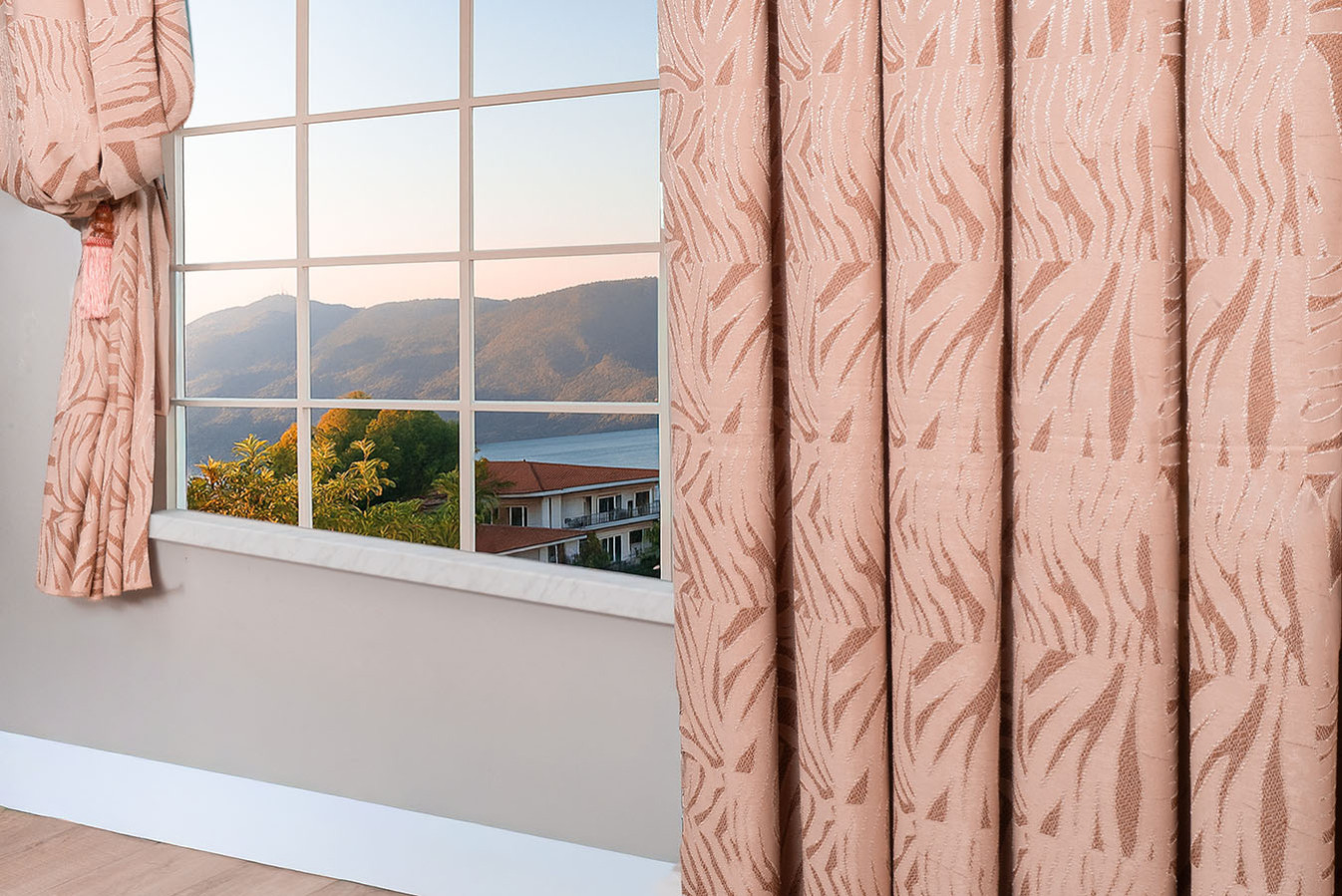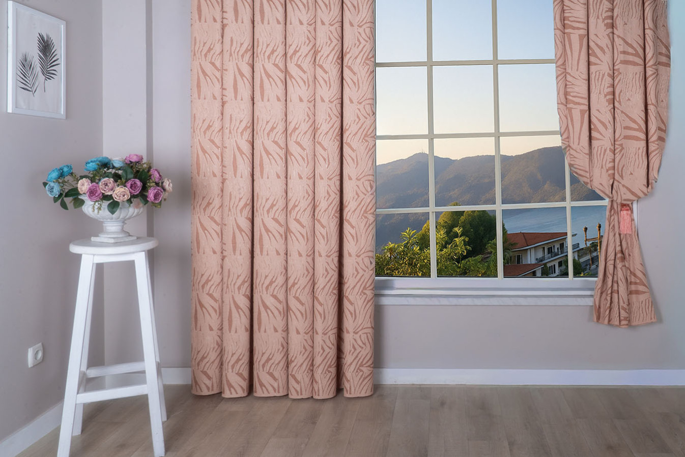 Штори прикрашені абстрактним візерунком у бежево-пудровій гамі. Тканина має виразну поверхню, створену завдяки рельєфній структурі переплетення. Штори відрізняються пластичністю і податливістю до будь-яких драпіровок, у призібраному вигляді утворюють струмуючі, вільно спадаючі складки. В інтер'єрі виглядають елегантно і привабливо, надають приміщенню затишну і комфортну атмосферу.