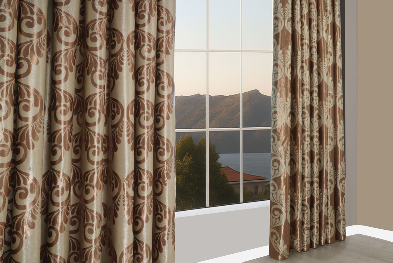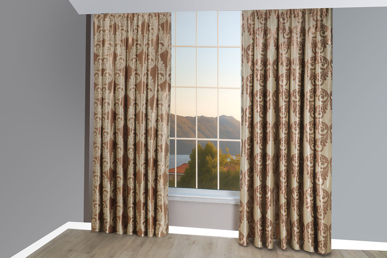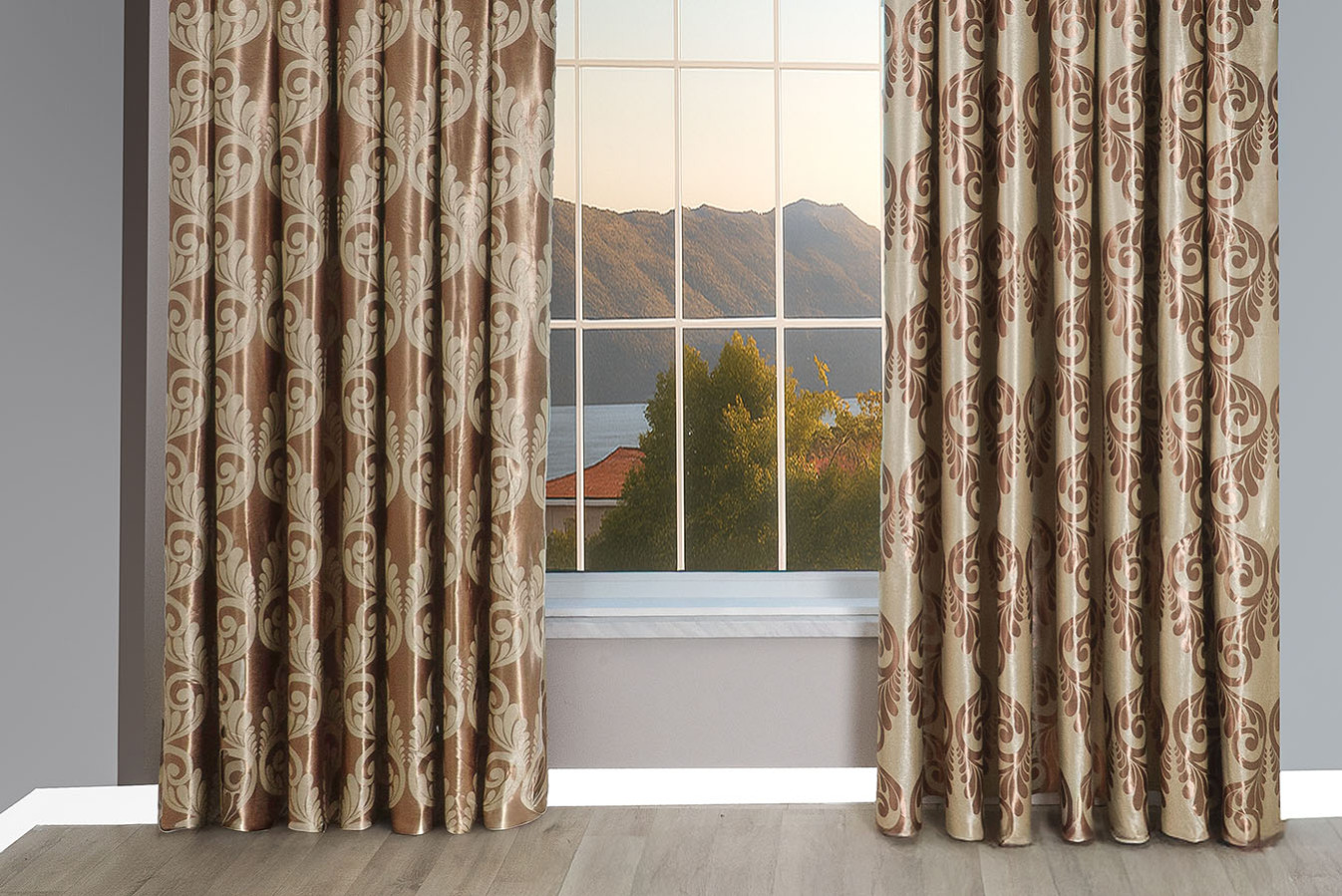 Шторы двухсторонние из блэкаута с золотистыми и светло-коричневыми вензелями. Крупный узор выполнен путем сложного переплетения волокон при котором получается красивая комбинация глянцевой и микровелюровой фактур. Приобретая такие портьеры вы, по сути, получаете два комплекта штор, так как сможете легко перевешивать их на любую сторону, а обработанные боковые кромки избавят от необходимости прокладывать лишние швы. Это идеальный вариант для эффектного оформления окон, к тому же, обладающий хорошими светозащитными свойствами.
