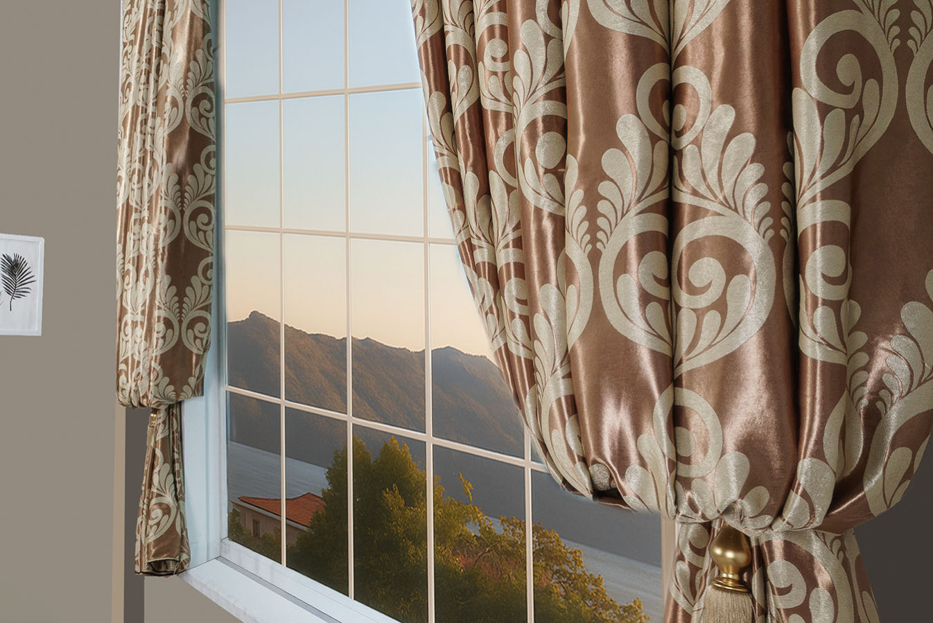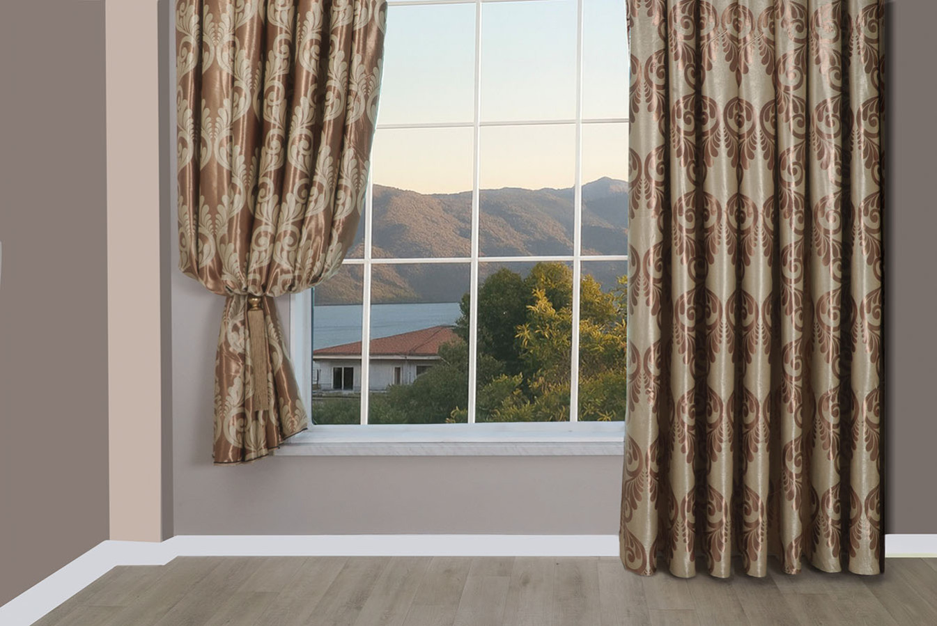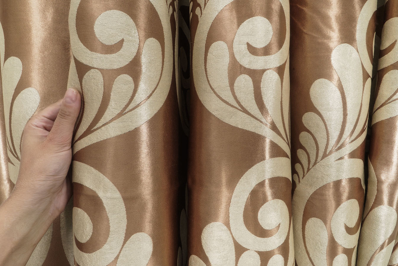 Шторы двухсторонние из блэкаута с золотистыми и светло-коричневыми вензелями. Крупный узор выполнен путем сложного переплетения волокон при котором получается красивая комбинация глянцевой и микровелюровой фактур. Приобретая такие портьеры вы, по сути, получаете два комплекта штор, так как сможете легко перевешивать их на любую сторону, а обработанные боковые кромки избавят от необходимости прокладывать лишние швы. Это идеальный вариант для эффектного оформления окон, к тому же, обладающий хорошими светозащитными свойствами.