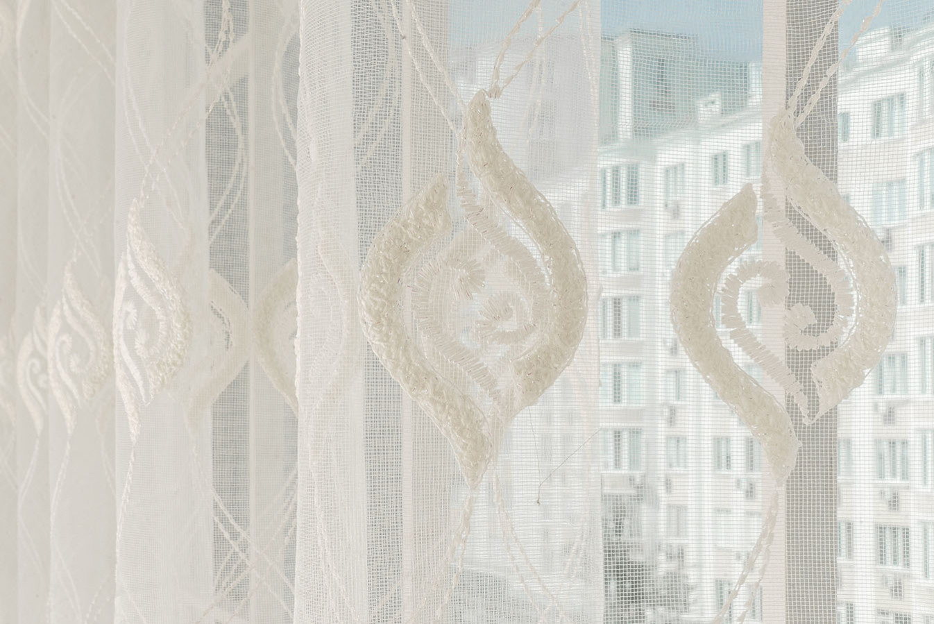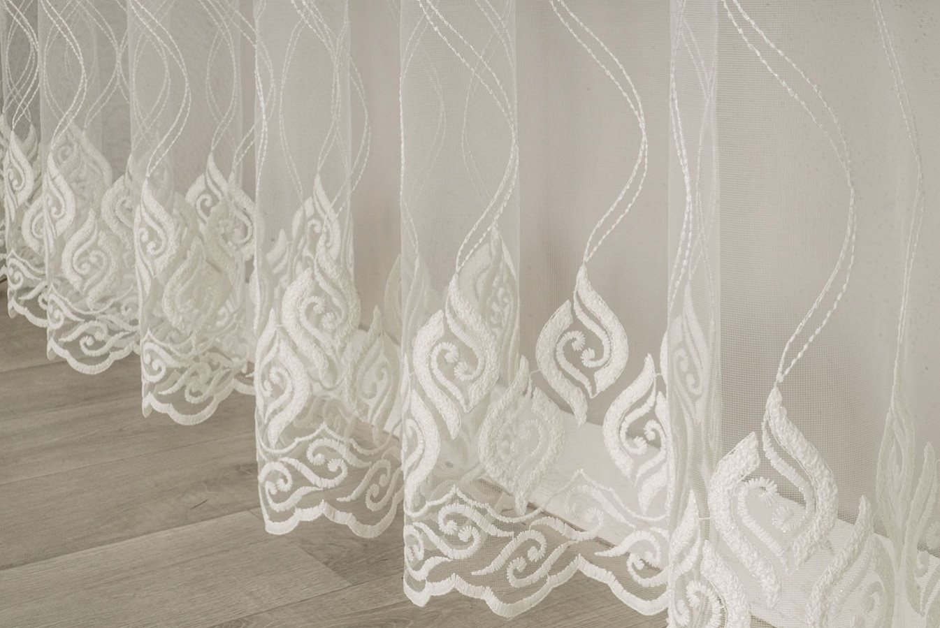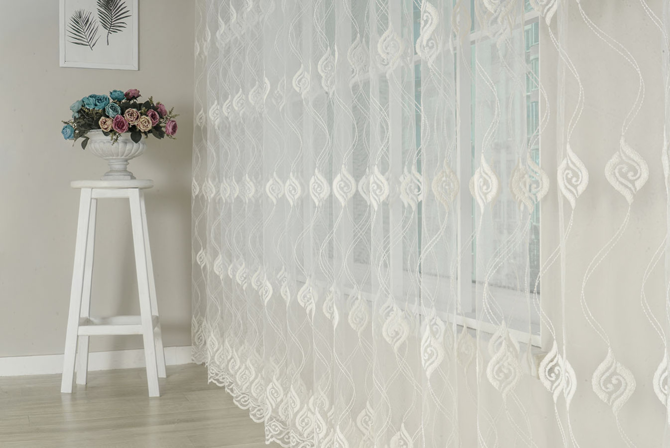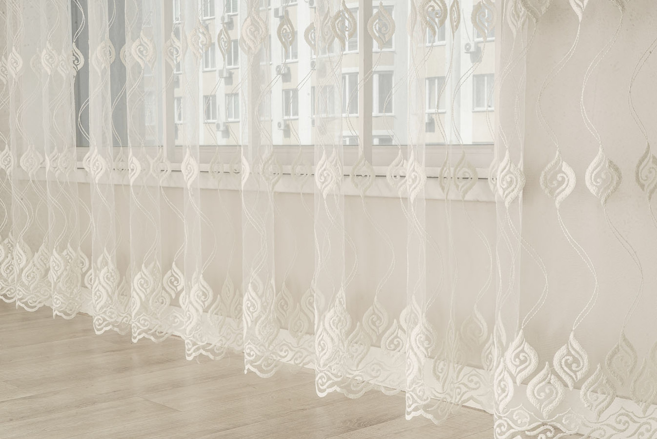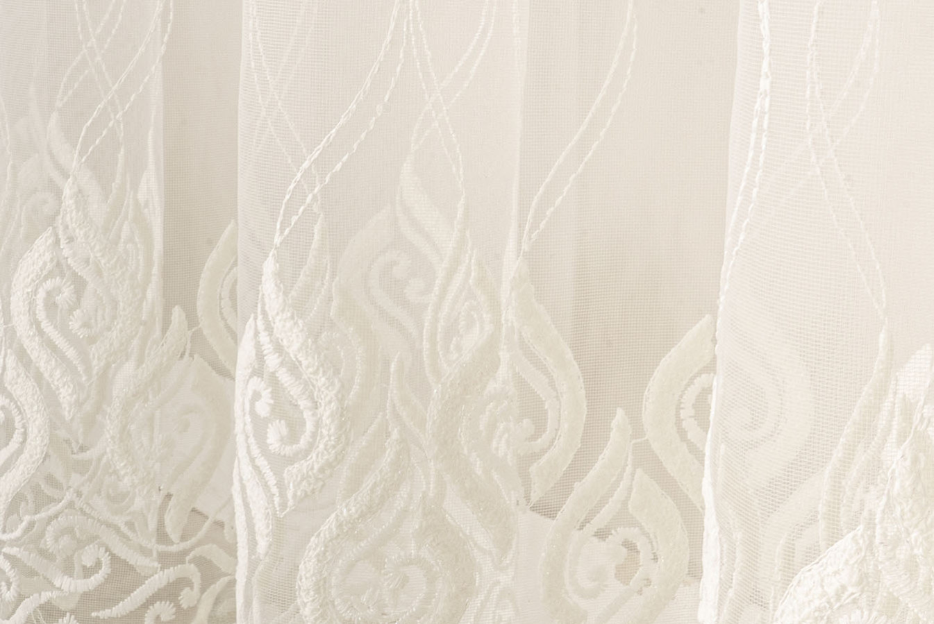 Тюль на основе молочного фатина с мелкосетчатой структурой, украшенный шитьем по всей высоте. Фигурный, горизонтально расположенный узор вышит матовыми нитями с включением прозрачного люрекса "хамелеон". Исполнение шитья имеет необычный и рельефный вид, напоминающий буклированную вышивку. Смотрится очень выразительно и объемно в сочетании с прозрачным и невесомым фоном.