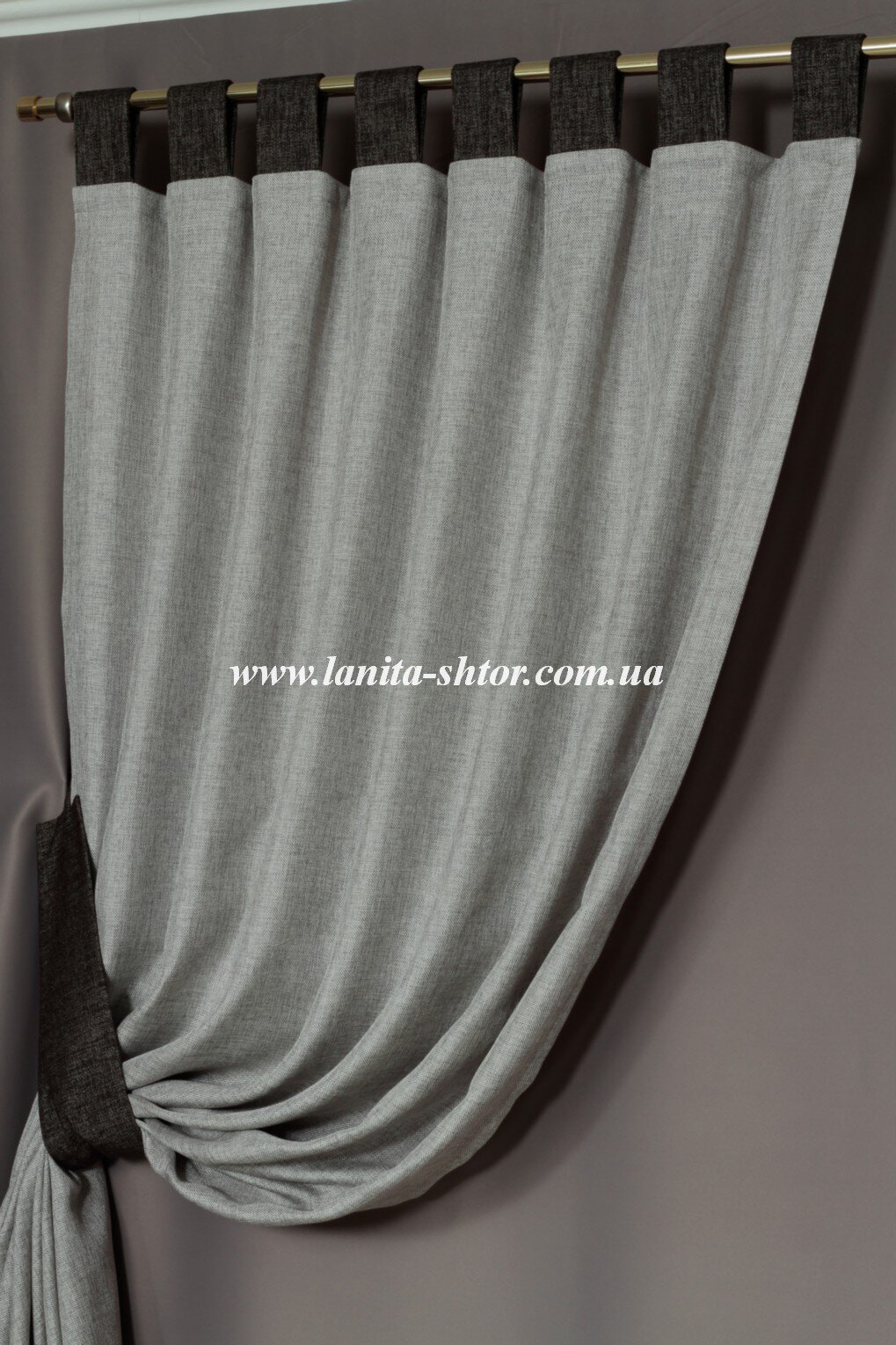 Модель из серой мешковины с петлями и подхватами из представленного здесь графитового льна.